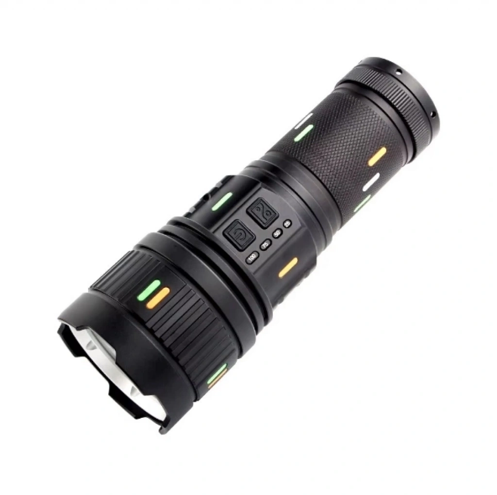 Kaymaz ve aşınmaya dayanıklı alüminyum alaşımlı malzemeden üretilmiştir. Tüksek parlaklığa sahip TG LED aydınlatmadır. Güç göstergesi ve USB çıkış işlevine sahiptir. Gövdede florasan şerit vardır. 4*18650 lityum pil ile çalışır. Type-C hızlı şarj edilir. Zoom : Var