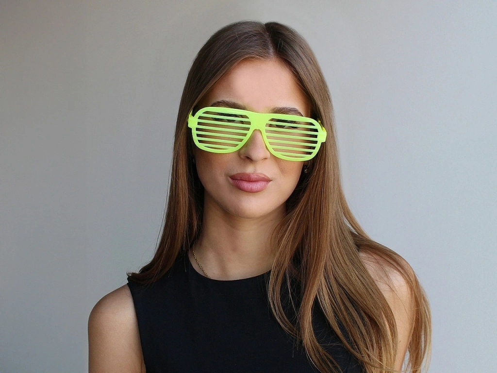 Retro panjur gözlük, nostaljik tasarımı ve neon renkleriyle partilerin, doğum günlerinin, konsept etkinliklerin ve fotoğraf çekimlerinin vazgeçilmez aksesuarı oluyor.
