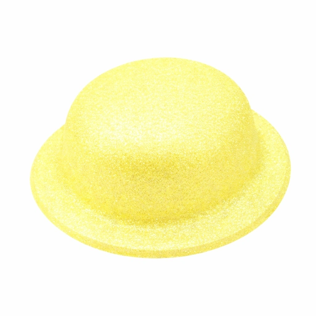 Simli sarı renk melon şapka, canlı rengi ve parlak glitter kaplamasıyla enerjik ve dikkat çekici bir görünüm sunar.
