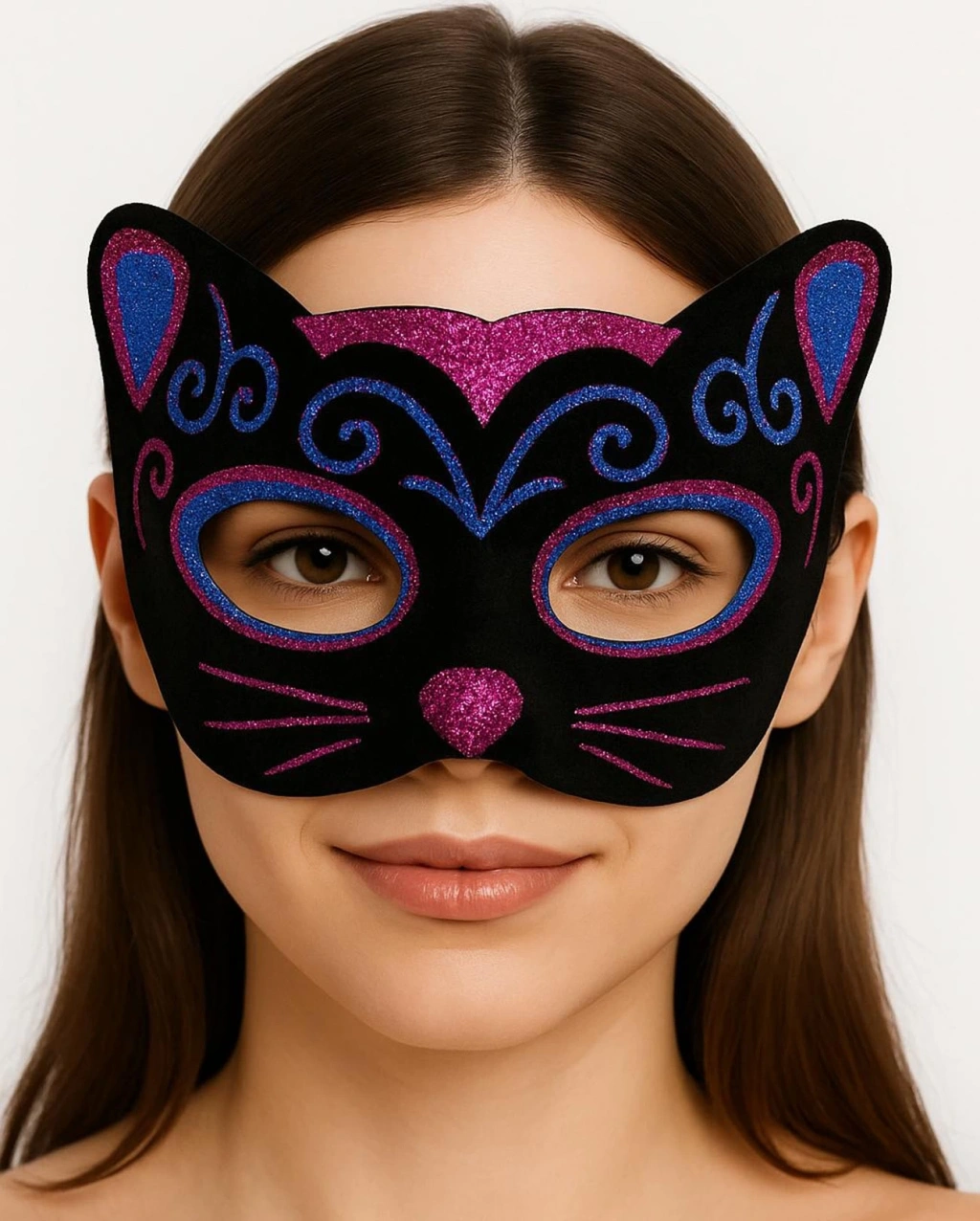 Siyah Kadife Kaplama Üzeri Pembe Mavi Sim İşlemeli Kedi Maskesi, balolar, maskeli partiler veya kostüm partileri gibi eğlenceli etkinliklerde sevimli ve dikkat çekici bir kedi görünümü elde etmek isteyenler için mükemmel bir seçimdir. Yumuşak siyah kadife kaplaması, parlak sarı yeşil sim işlemesi ve sevimli kedi kulakları ile bu maske sizi partinin en eğlenceli ve sevimli konuğu yapacak.