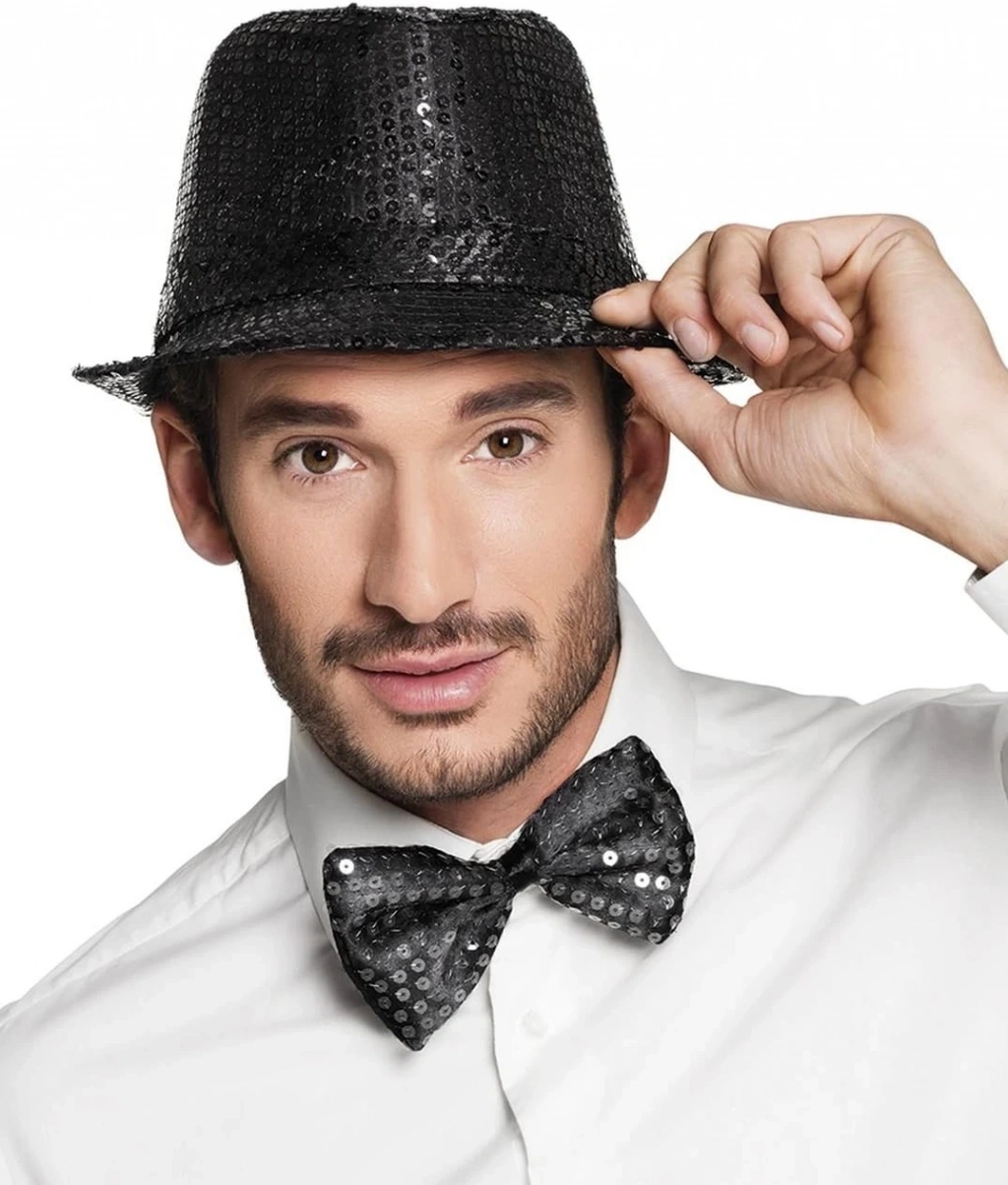 Göz alıcı bir tarz oluşturmak isteyenler için Siyah Payetli Şapka ve Papyon Seti tam size göre Işıltılı tasarımıyla özel davetlerden temalı partilere kadar her ortamda fark yaratın.