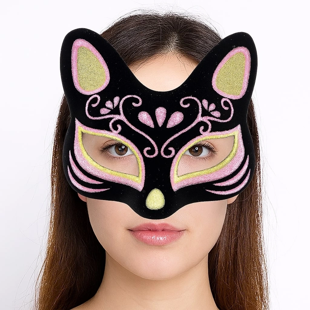 Siyah Renk Üzeri Pembe Sarı Simli Süet Kaplama Kedi Maskesi ile gizemli ve etkileyici bir görünüm oluşturun ve Kostüm Partisine hazır olun