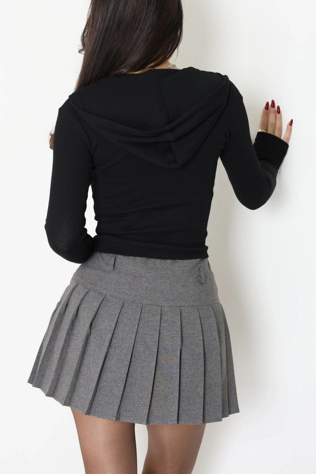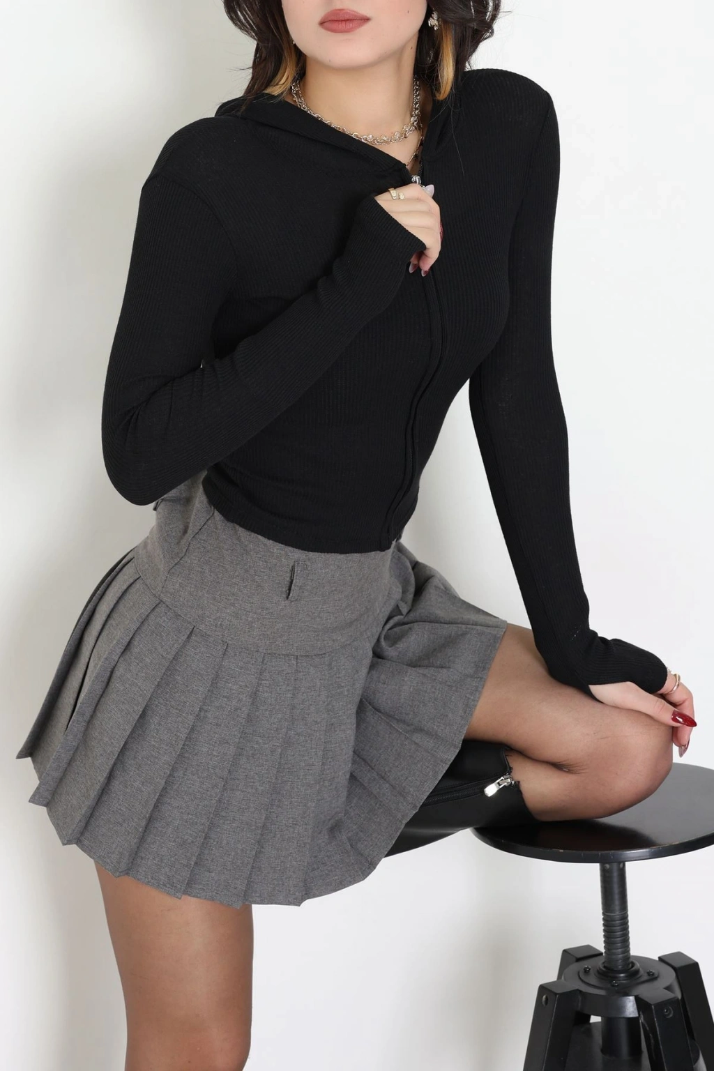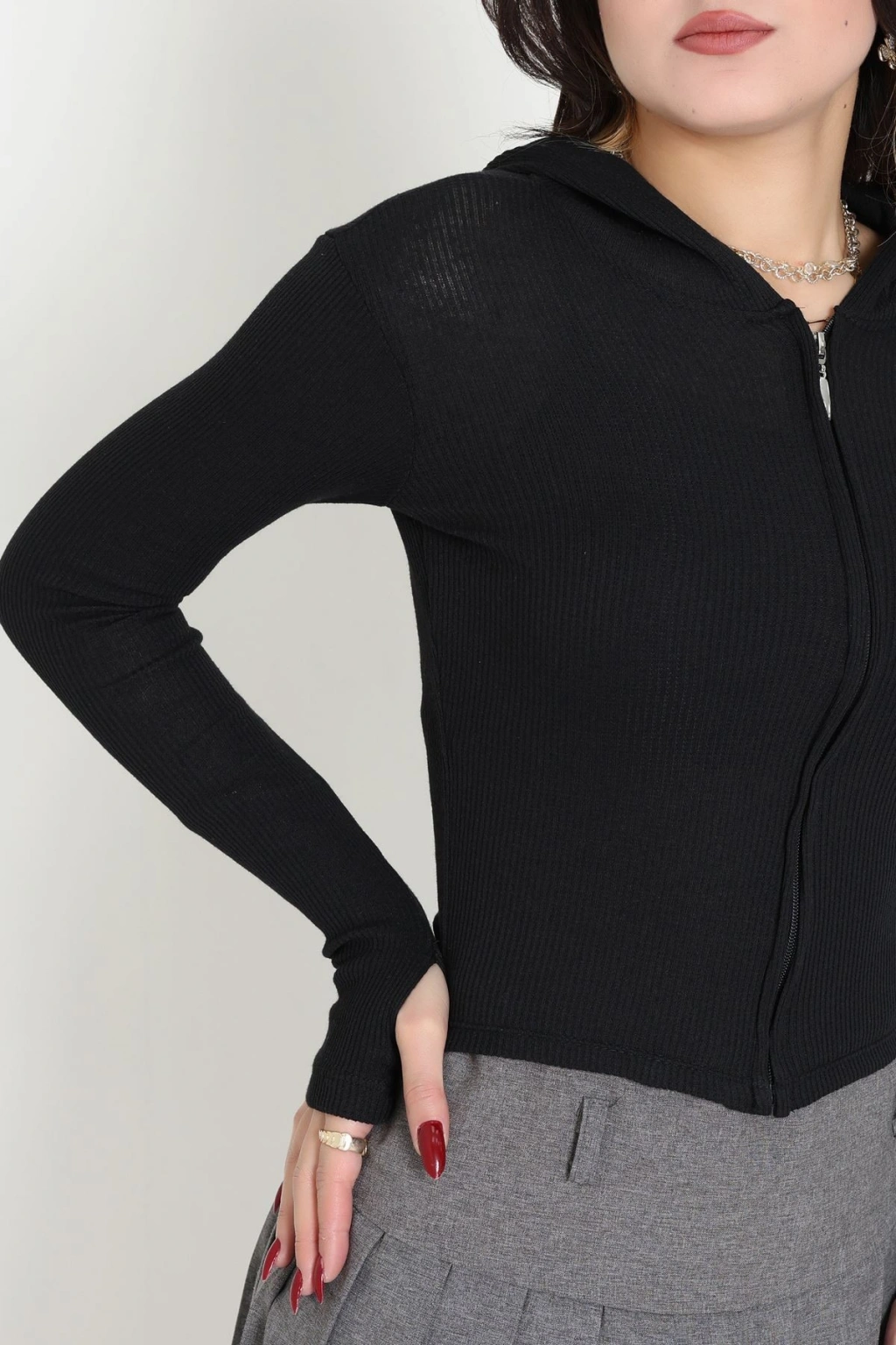 Kapşonlu Parmak Geçmeli Body Siyah - 70769.1567.