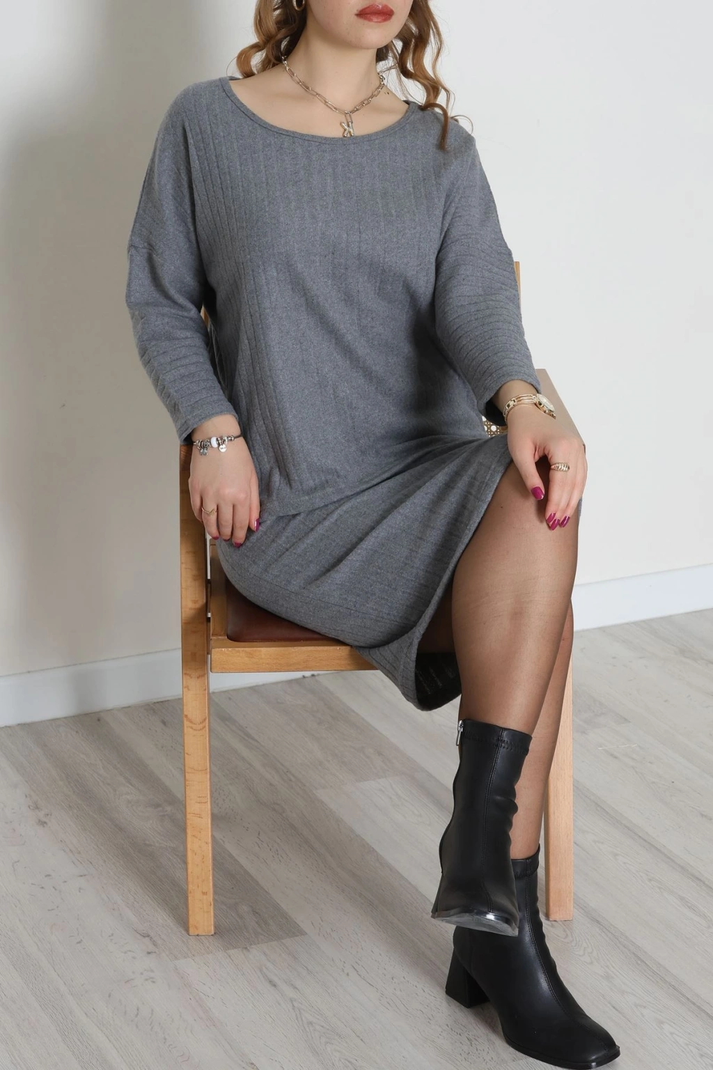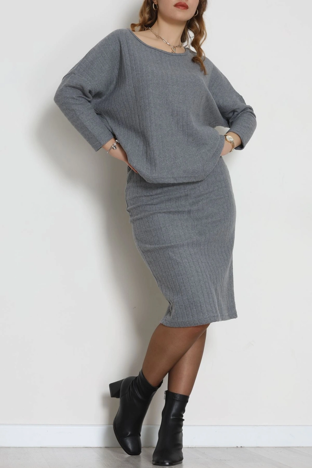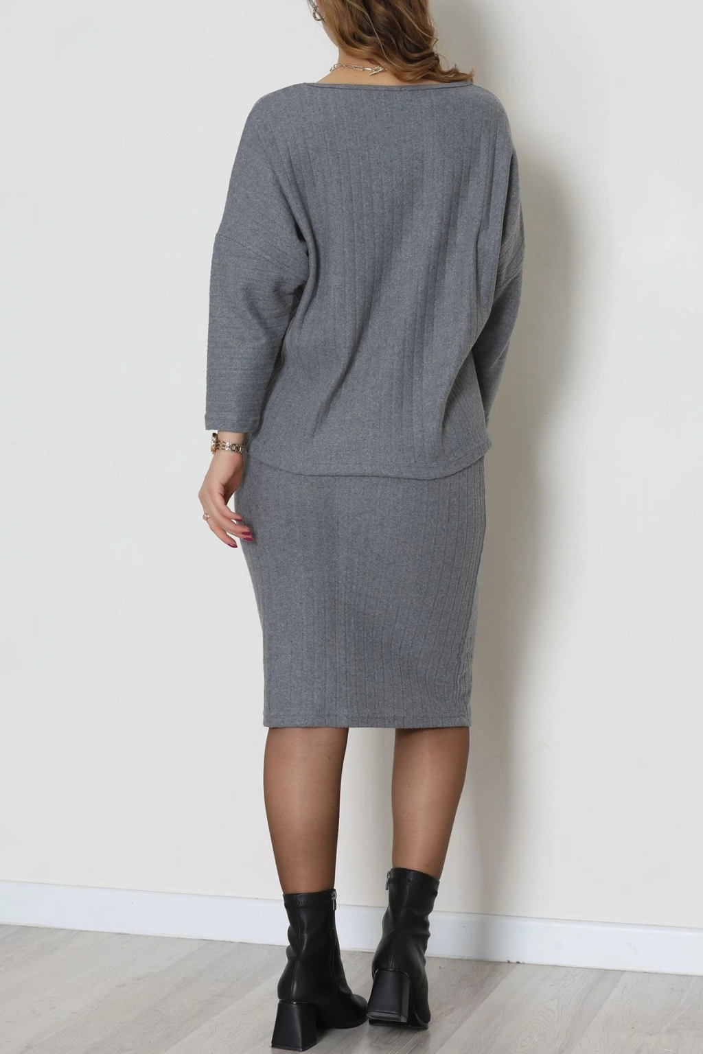 Kaşkorse Kumaş Omuz Düşümlü Midi Boy Etekli Takım Gri - 42800.1567.