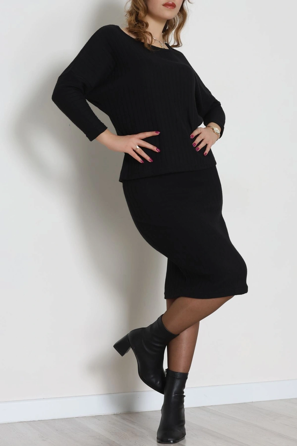 Kaşkorse Kumaş Omuz Düşümlü Midi Boy Etekli Takım Siyah - 42800.1567.