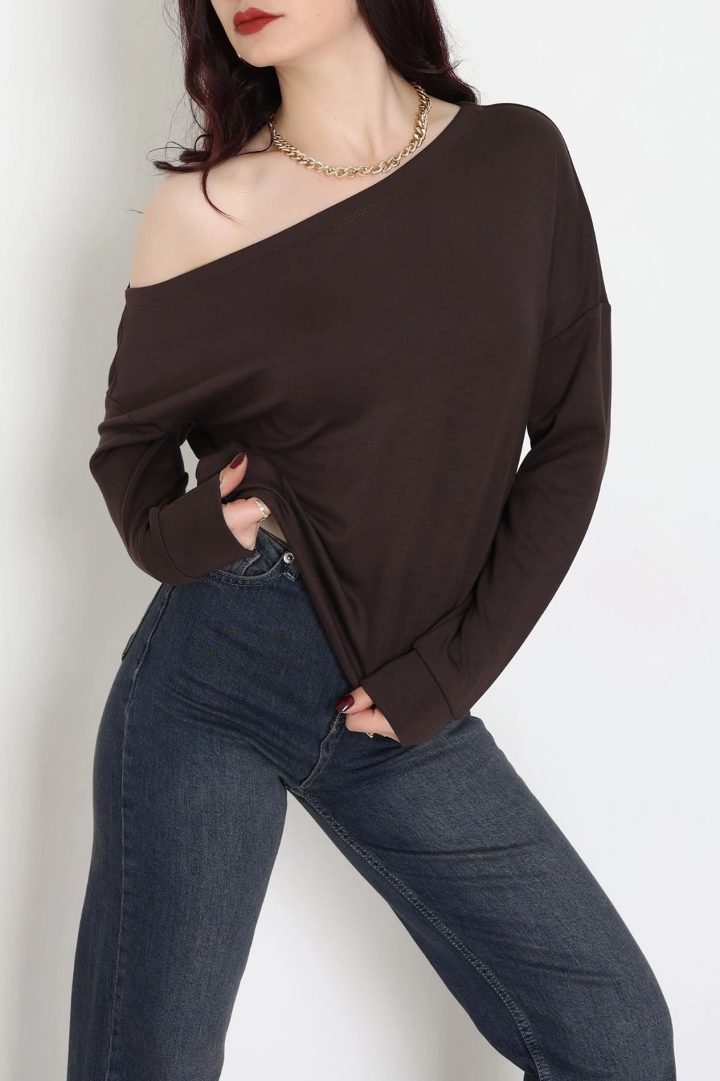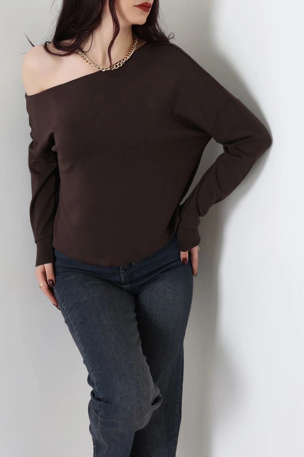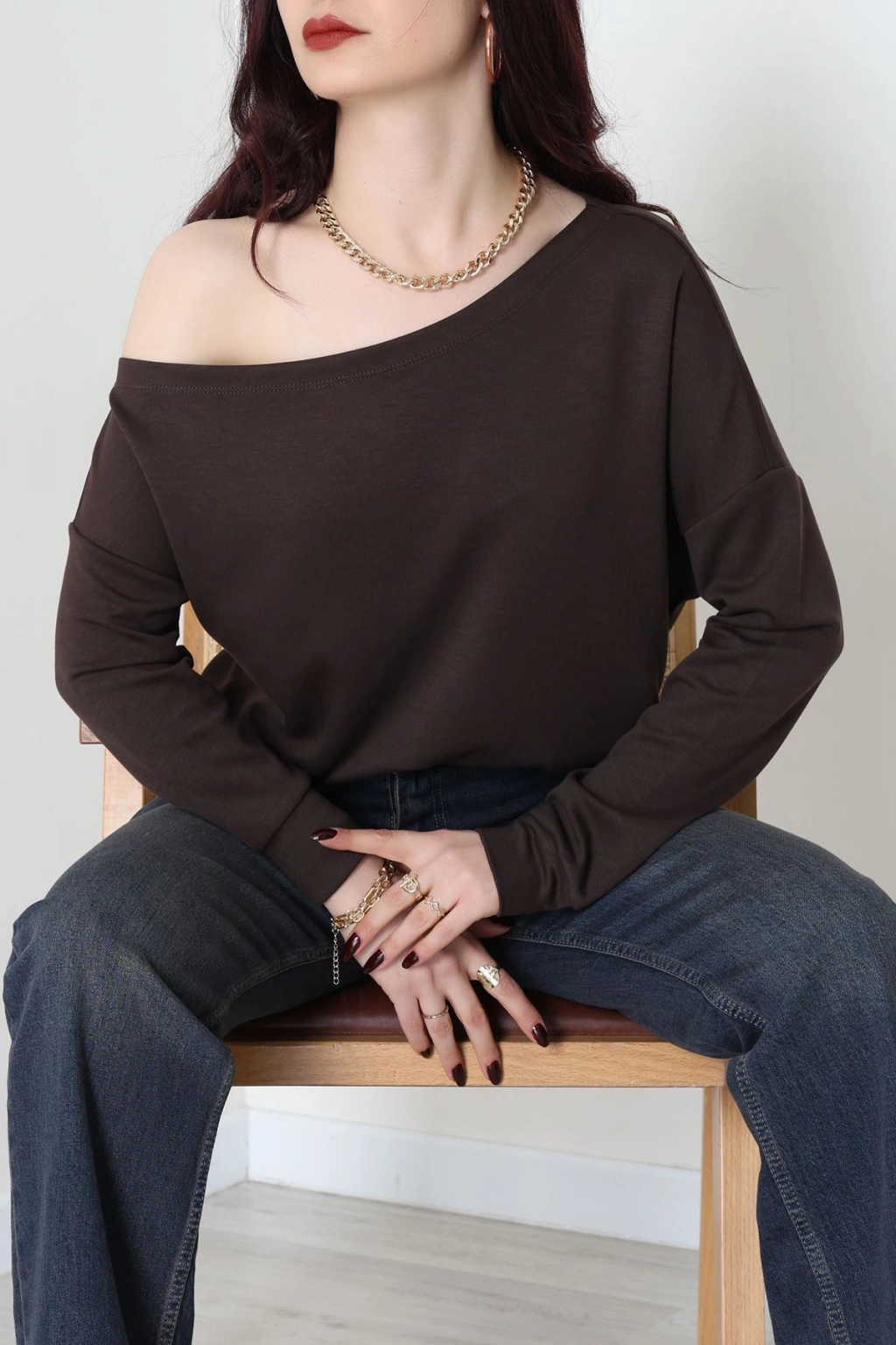 Kayık Yaka Omuz Düşümlü Double Face Kumaş Bluz Acıkahve - 22185.200.