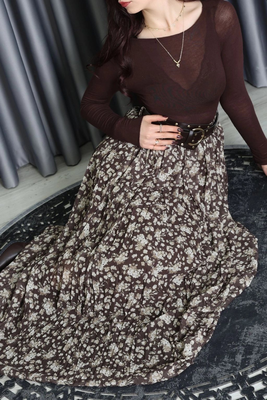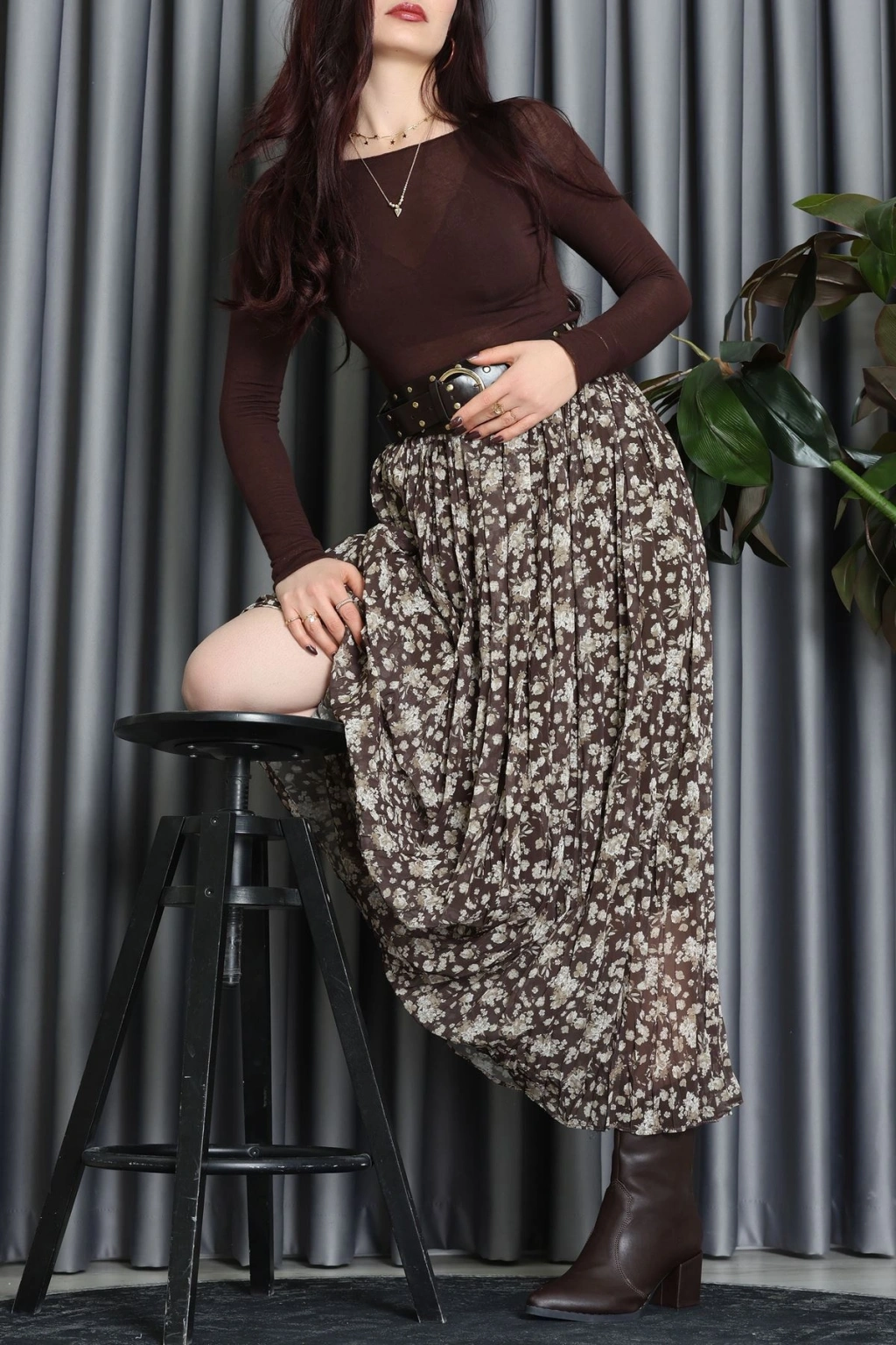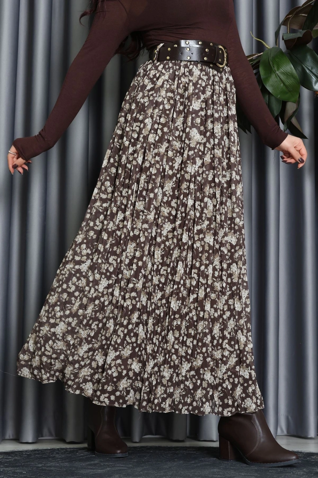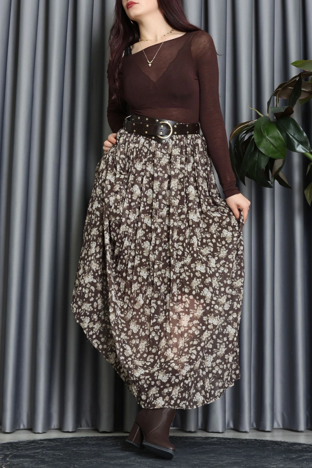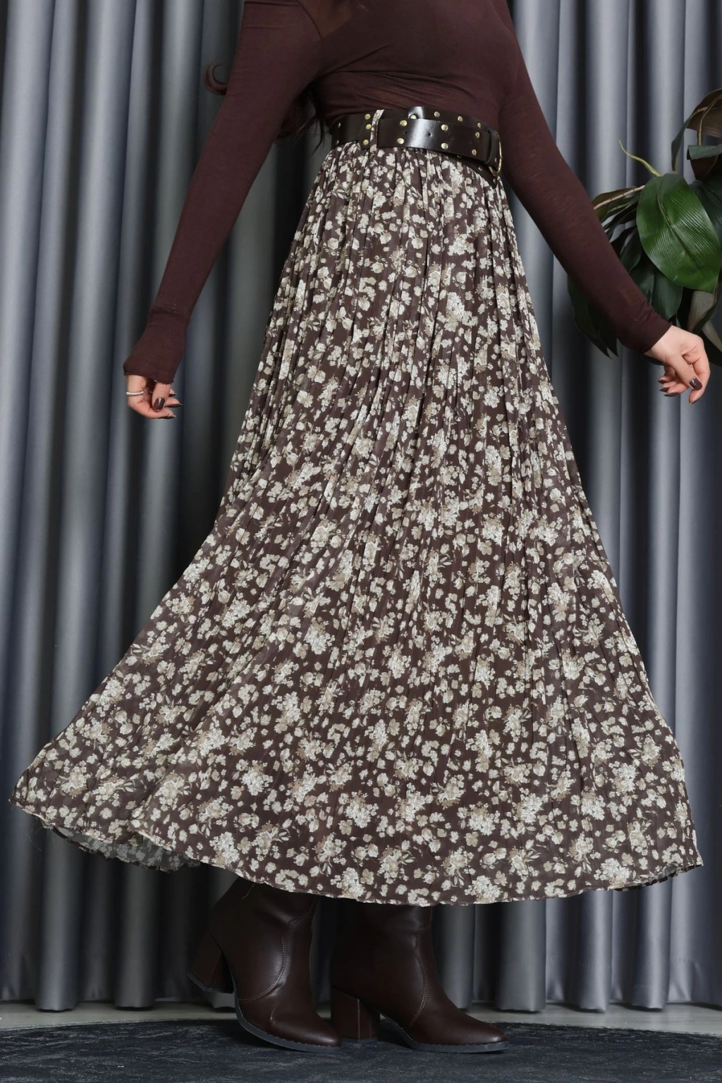 Kemerli Desenli Şifon Astarlı Etek Kahve - 71001.1934.
