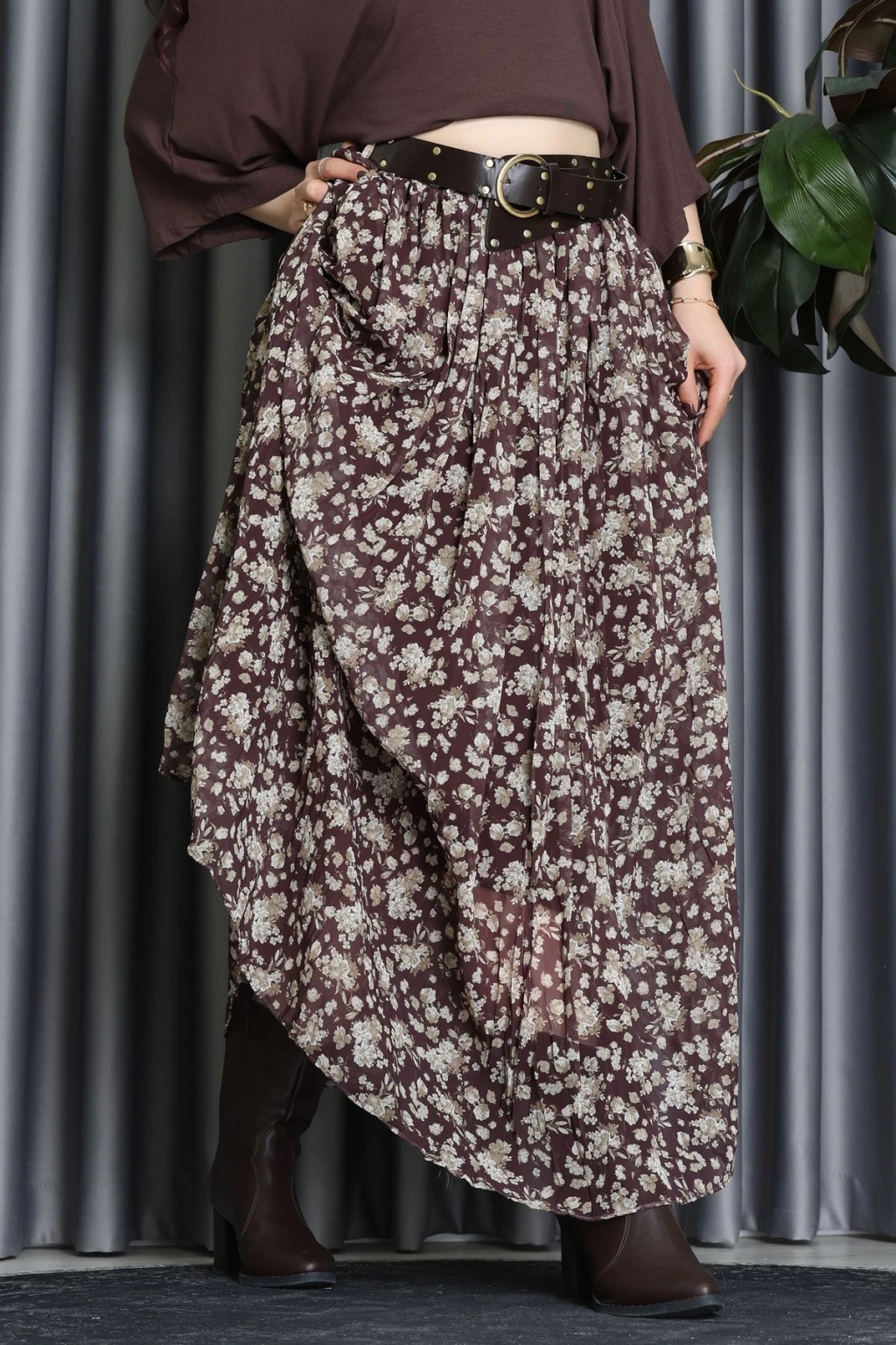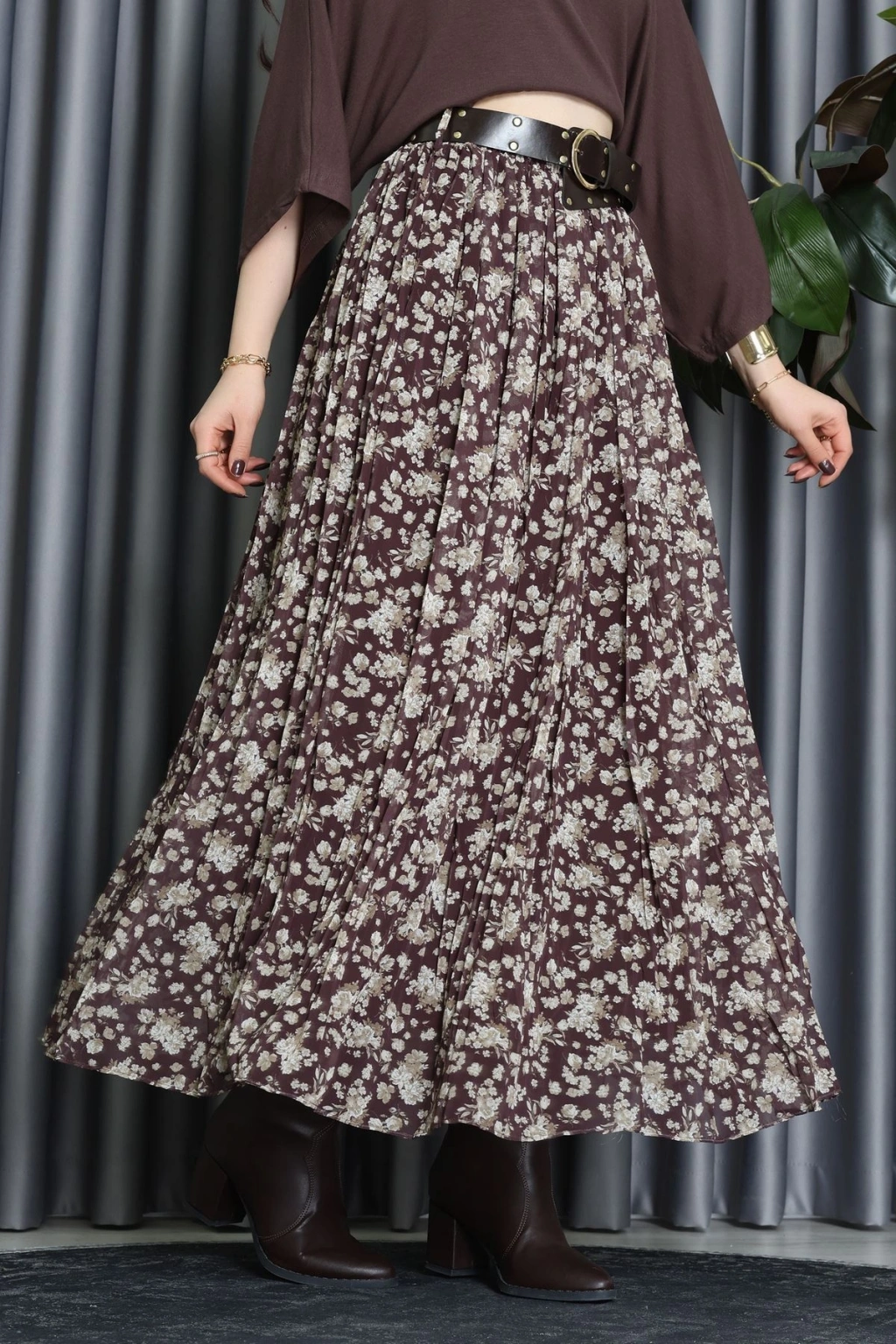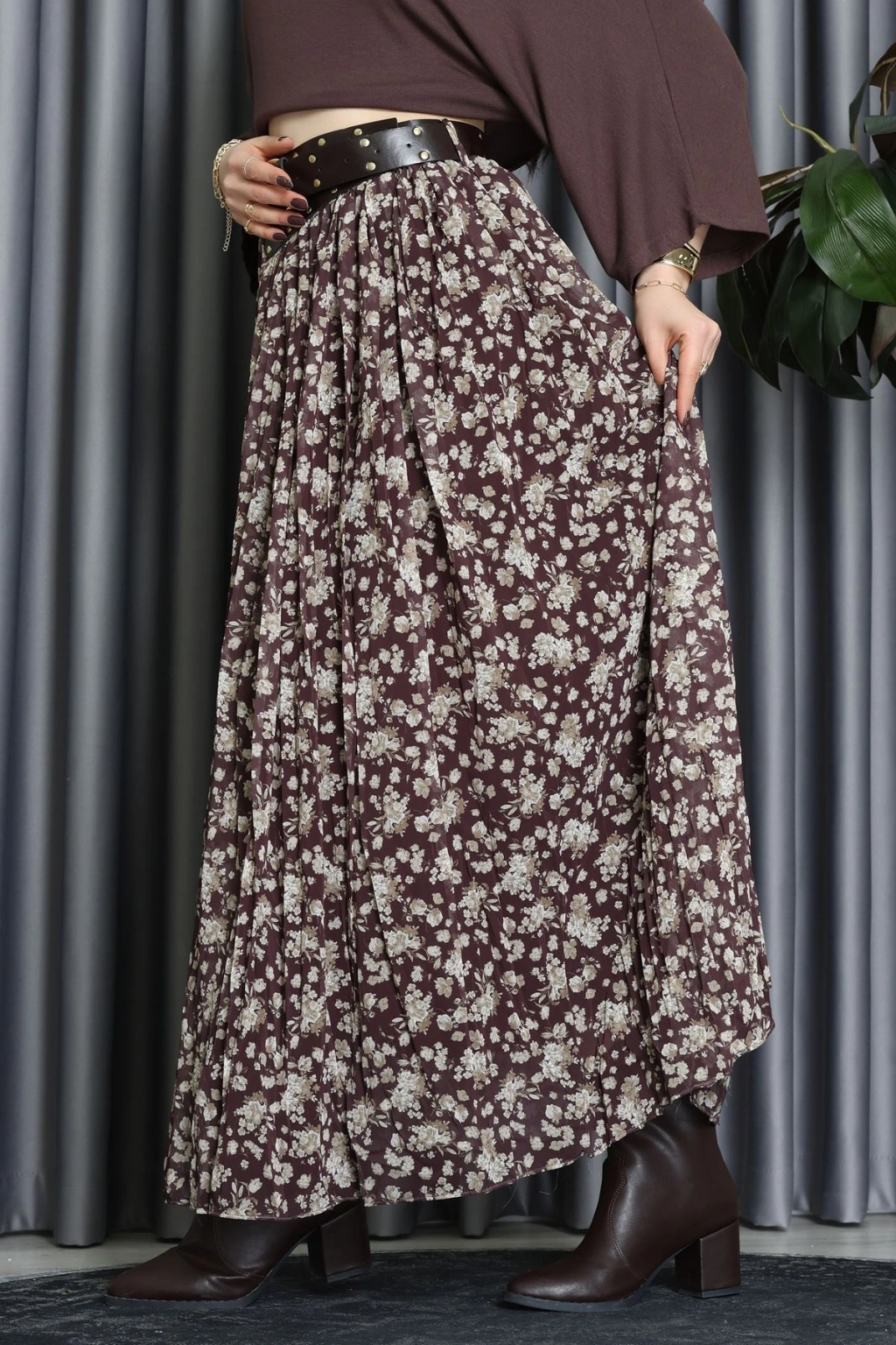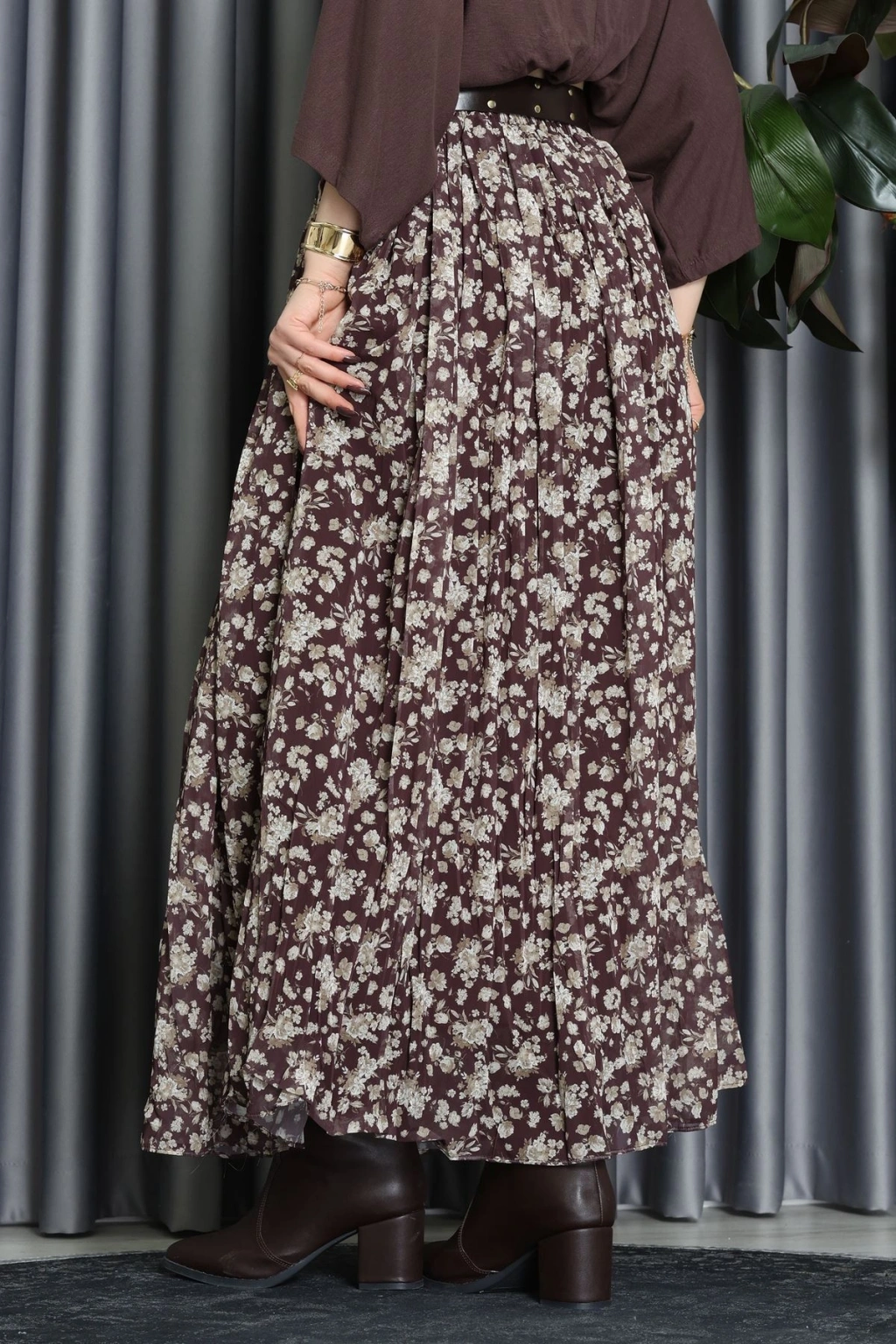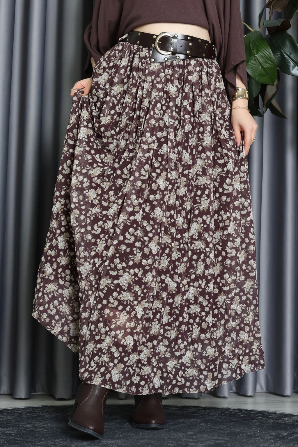 Kemerli Desenli Şifon Astarlı Etek Kahve - 71001.1934.