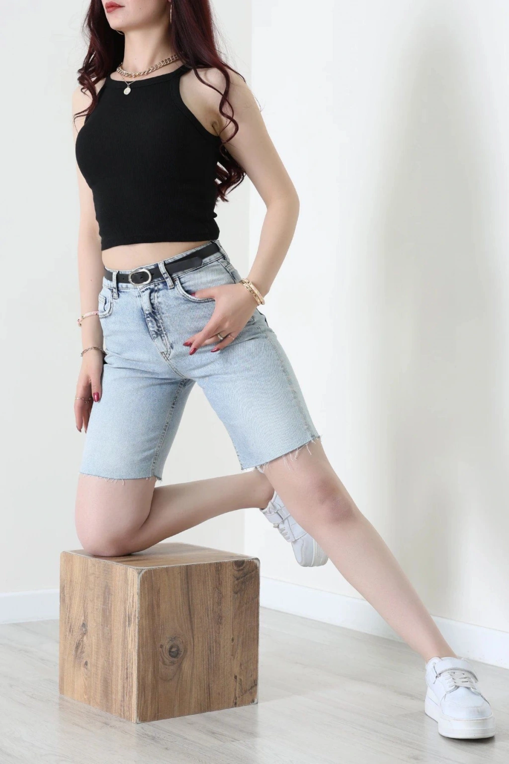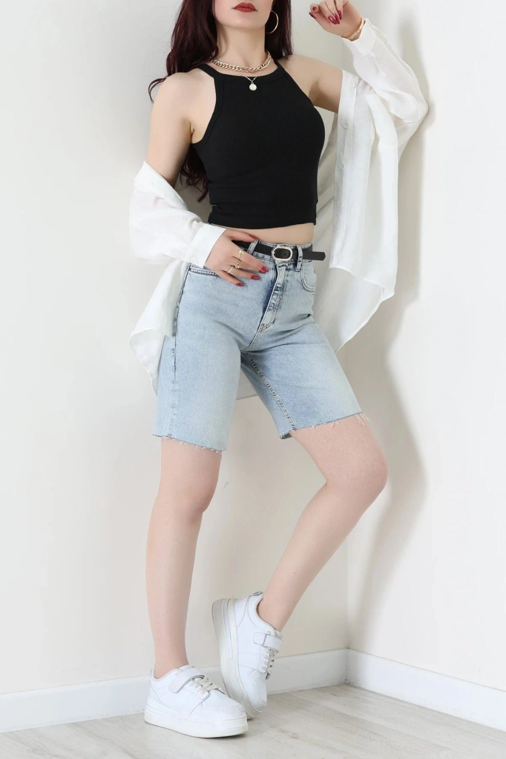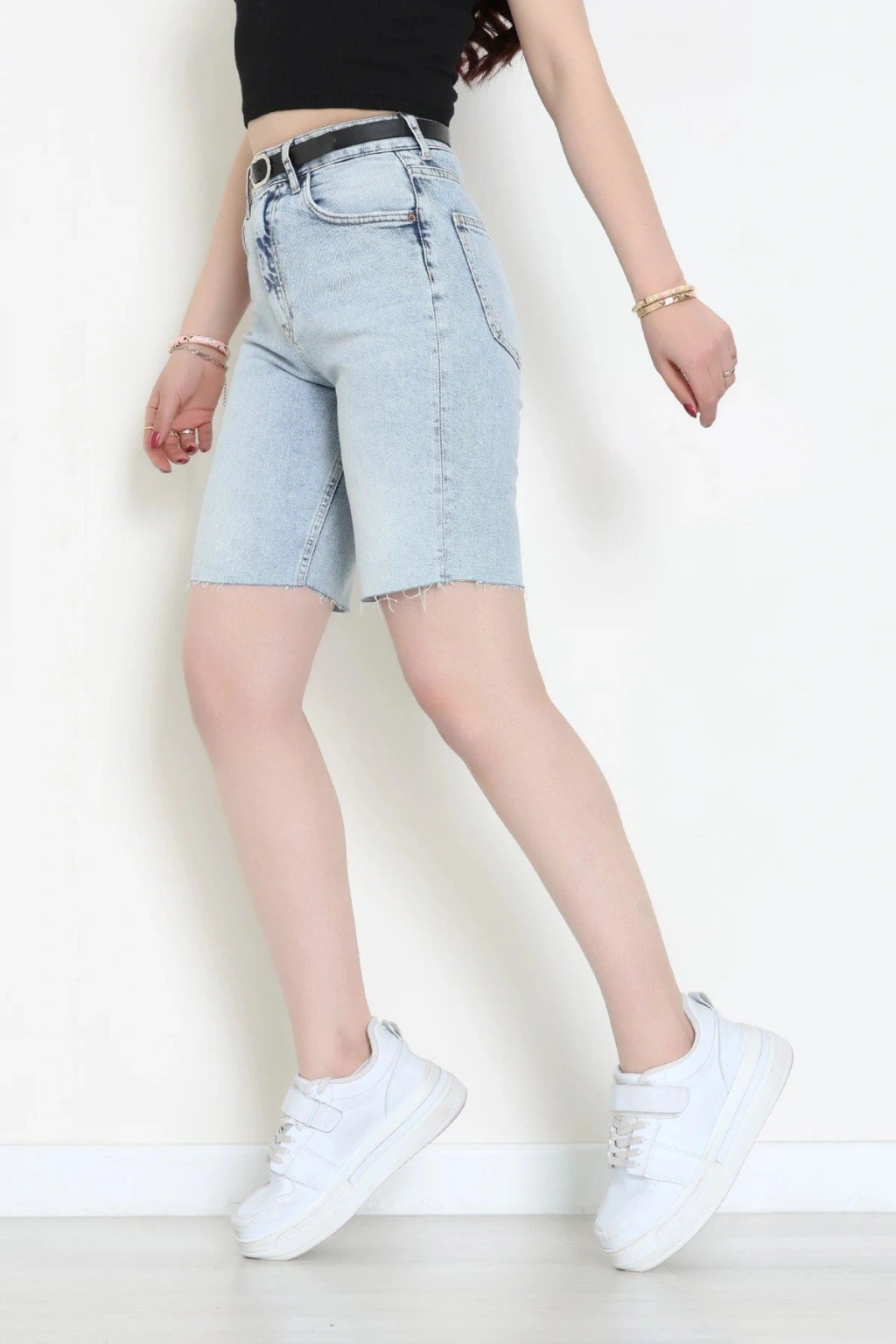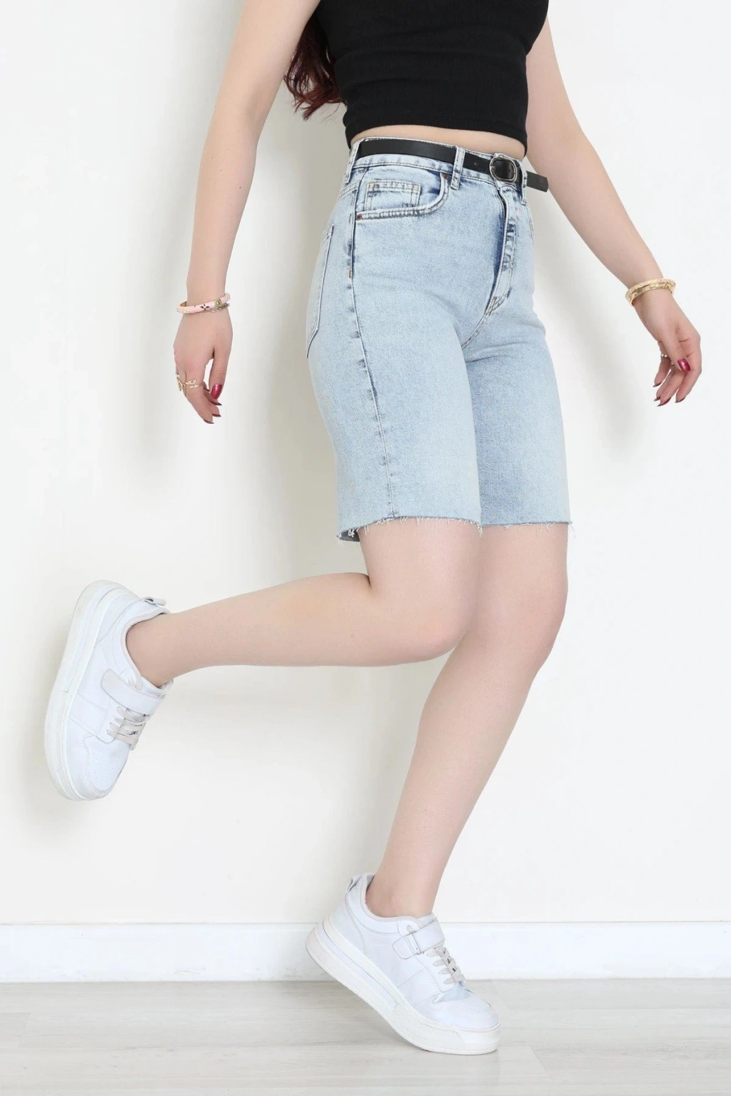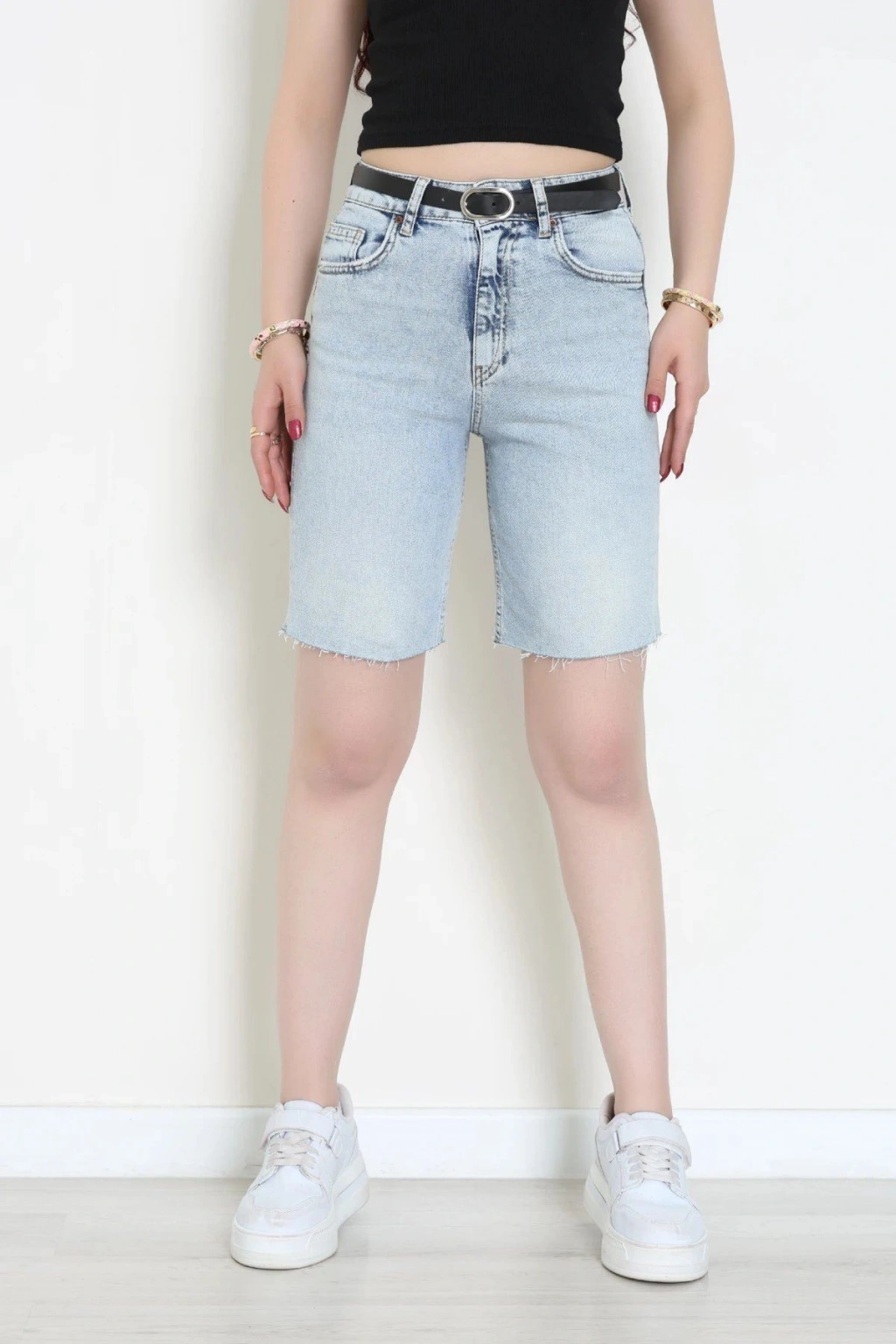 # Mavi Kot Şort ## Tasarım Detayları ve Rahat Kesim Bu açık mavi **kot şort**, hafif yapısı ve hareket özgürlüğü sunan kesimiyle sıcak günlerde konforu ön planda tutan kaliteli bir seçenektir. Modelimiz, bel bölgesini kavrayan formuyla vücut hatlarını zarifçe ortaya çıkarırken dayanıklı denim dokusuyla uzun süreli kullanım sunar. **Yüksek bel kot** arayanlar için ideal olan bu **kot şort** tasarımı, klasik cep detaylarıyla fonksiyonelliği ve şıklığı bir araya getirerek dinamik bir duruş sergiler. Diz üzerine kadar uzanan bermuda formu modern bir silüet çizerken, paça kısmındaki ham kesim detayları tasarıma doğal bir hava katar. Kemerli yapısı sayesinde vücuda tam oturan bu **mavi denim şort**, nefes alabilen pamuklu dokusuyla gün boyu serinlik hissi sağlar. Metal aksesuar detaylarıyla zenginleşen bu şık **kot şort**, bütçe dostu fiyatıyla dikkat çeken kaliteli bir fiyat performans ürünü ve ekonomik seçenektir. Satın almak için sepete ekleyin.