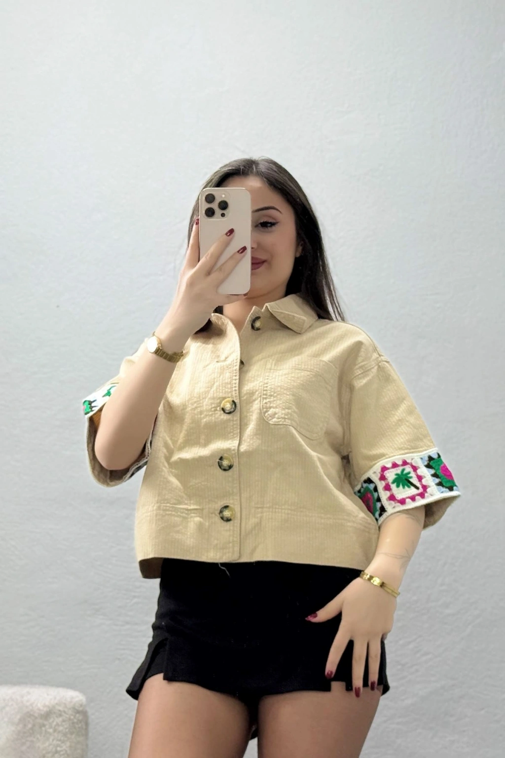 # Kroşe Detaylı Pamuklu Gömlek ## Tasarım Özellikleri ve Konfor Hafif ve nefes alan yapısıyla öne çıkan bu bej **pamuklu gömlek**, yaz aylarında serin ve ferah hissetmenizi sağlayan doğal bir dokuya sahiptir. %100 pamuk kumaştan üretilen bu tasarım, kollarındaki renkli kroşe motifleriyle özgün bir duruş sergiler. Salaş kesimi sayesinde hareket özgürlüğünü kısıtlamayan **pamuklu gömlek**, mat dokusuyla sade bir estetik sunar. Kısa kollu formu ve esnek yapısı, vücut hatlarını sıkıştırmadan gün boyu rahatça hareket etme imkanı tanır. Modelimiz, ön kısmındaki koyu düğmeleri ve göğüs üzerindeki tek cebiyle fonksiyonel bir kullanım alanı yaratır. Kollarında yer alan canlı renkli **nakışlı kollar**, bej rengin sadeliğiyle kontrast oluşturarak tasarıma hareket kazandırır. Terletmeyen doğal pamuk lifleri sayesinde cildin hava almasına olanak tanıyan bu ürün, dayanıklı dikişleriyle formunu uzun süre korur. %100 pamuklu gömlek arayanlar için ideal olan bu **bej kısa kol gömlek**, kalitesiyle öne çıkan ekonomik bir seçenektir. Satın almak için hemen sepete ekleyin.