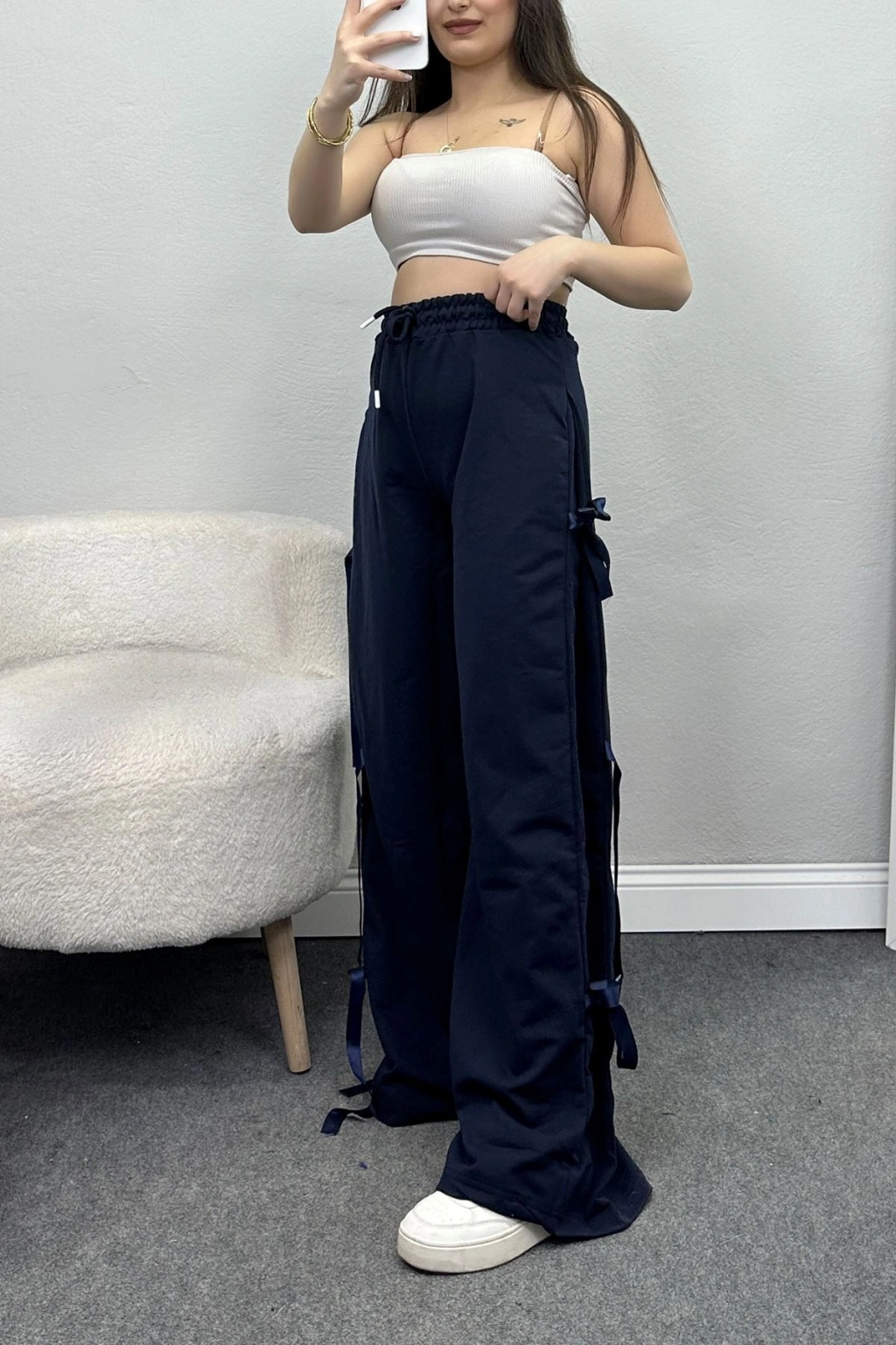 # Kurdele Detaylı Lacivert Eşofman Altı ## Tasarım Detayları ve Kumaş Özellikleri Rahatlık sunan **lacivert eşofman altı** modelimiz, yüksek bel kesimi ve özgün yan şerit detaylarıyla modern bir görünüm sergileyerek tam hareket özgürlüğü sağlar. Bu tasarım, esnek yapısı sayesinde gün boyu kesintisiz konfor vadeden oldukça kaliteli ve dayanıklı bir seçenektir. **Yüksek bel eşofman** arayanlar için ideal olan bu lacivert eşofman altı, bel bölgesindeki ayarlanabilir bağcığı ile farklı vücut tiplerine uyum gösterir. Koyu lacivert tonunun ağırlığıyla birleşen özel dokusu, yumuşaklığı sayesinde cildinizde pürüzsüz bir his bırakır. İki iplik kumaş teknolojisiyle üretilen modelimiz, nefes alabilen yapısıyla cildinize hassas bir dokunuş sunarken formunu uzun süre korur. Yan kısımlarda boylu boyunca uzanan zarif **kurdele detayları** ürüne feminen bir hava katarak standart sportif tasarımlardan ayrılmasını sağlar. Paça kısmındaki dökümlü ve geniş kesim, esnek dokuyla birleştiğinde adımlarınıza fark edilir bir hafiflik katar. Kalitesi ve estetik duruşuyla beklentileri karşılayan bu lacivert eşofman altı, bütçe dostu yaklaşımıyla öne çıkan oldukça ekonomik bir seçenektir. Satın almak için hemen sepete ekleyin.
