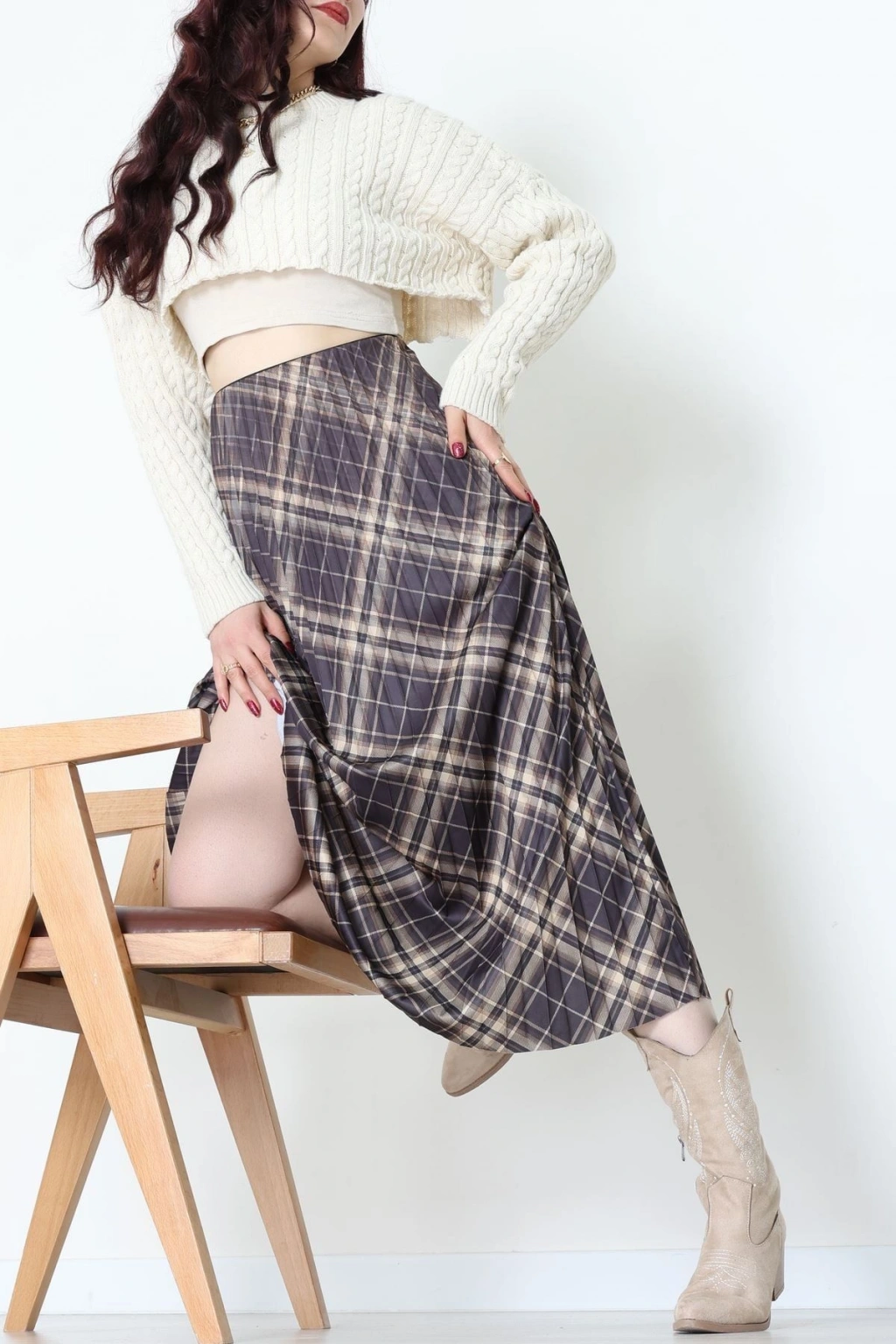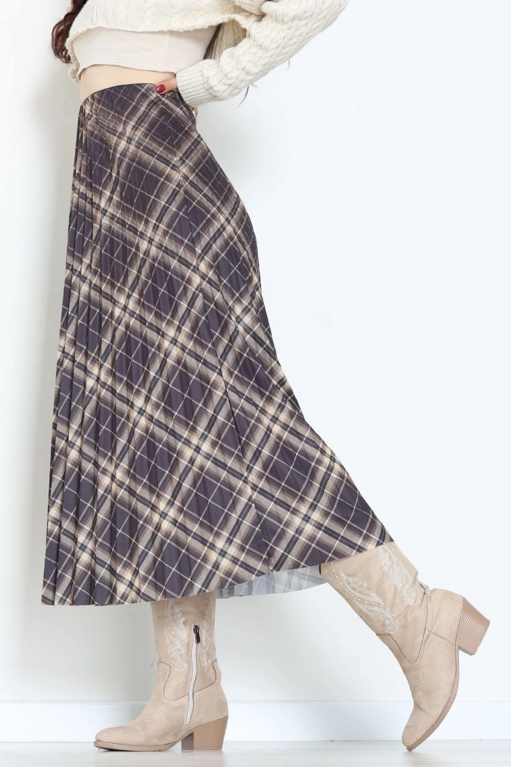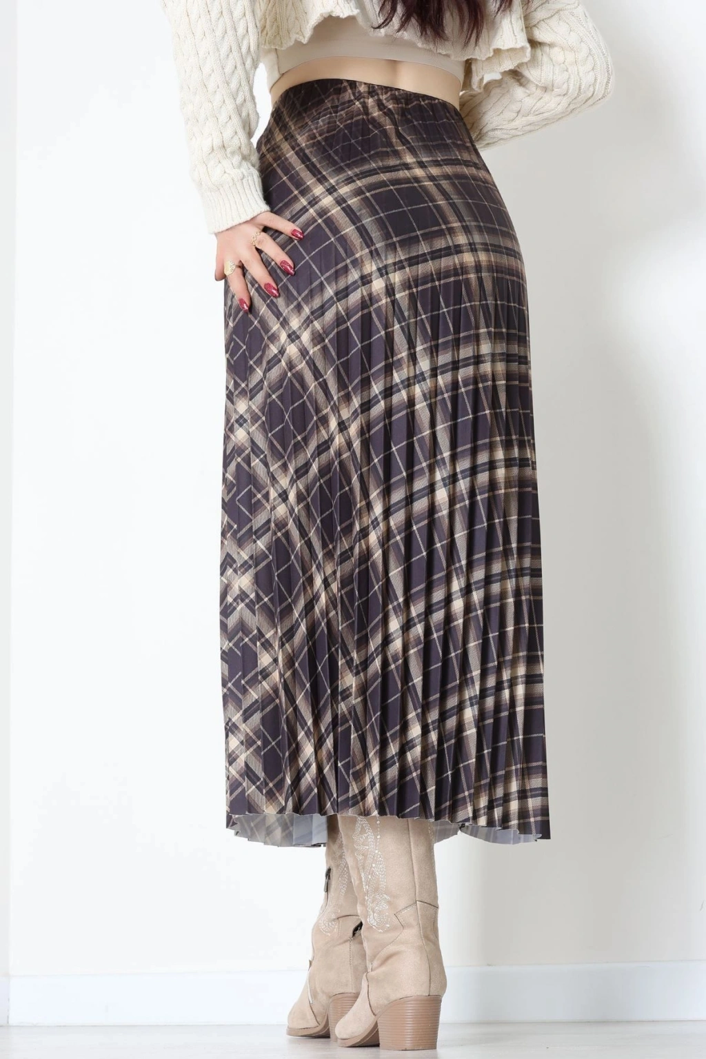 Laklı Denye Piliseli Ekose Etek Haki - 51252.2036.