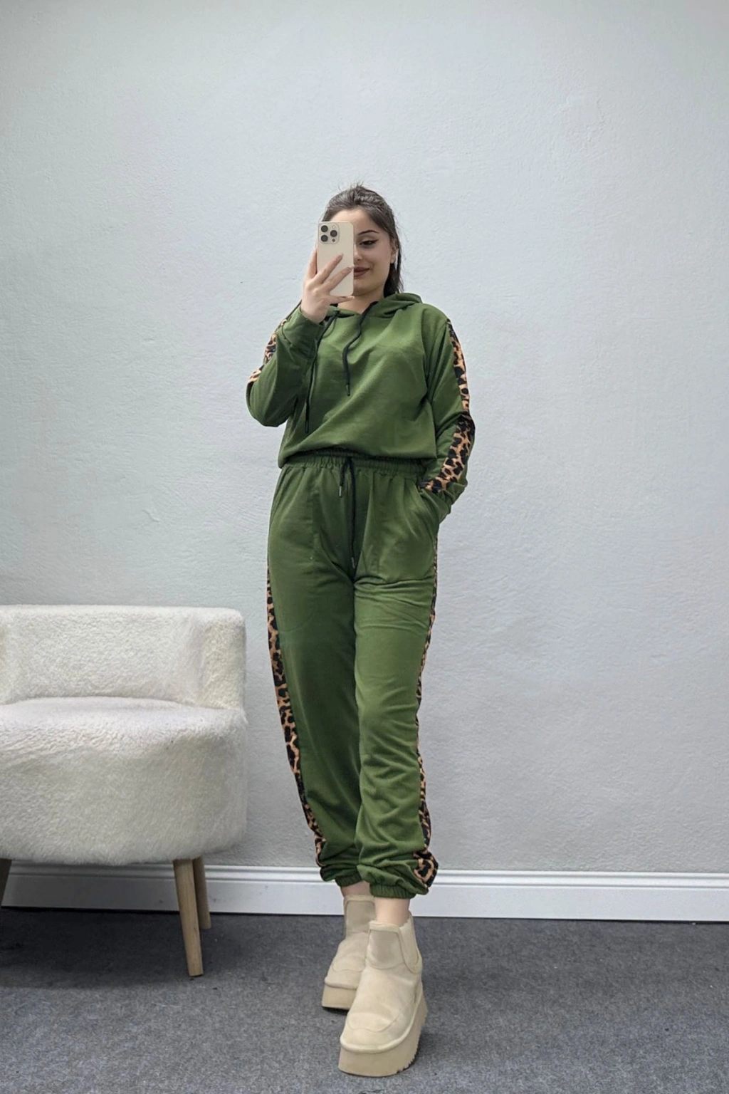 # Leopar Garnili Eşofman Takımı ## Konforlu ve Şık Tasarım Pamuklu kumaşıyla gün boyu rahatlık sunan bu **leopar garnili eşofman takımı**, haki rengi ve modern deseniyle öne çıkıyor. Worteks kumaş içeriği sayesinde esnek yapısıyla hareket özgürlüğü sağlayan bu model, günlük kullanım için ideal **haki eşofman** arayanlar için konforlu bir seçenektir. Kapüşonlu üst ve manşetli alt kısmı, modern bir siluet oluşturur. Bu **pamuklu eşofman takımı**, kolda ve yan paçalarda yer alan leopar detaylarıyla sportif şıklığı bir araya getiriyor. Normal kalıbı sayesinde her vücut tipine uyum sağlarken, esneme payı ile gün boyu konfor sunar. Hem evde hem dışarıda rahatlıkla kullanabileceğiniz bu tasarım, kalitesi ve estetiğiyle bir fiyat performans ürünüdür. Hemen sepete ekleyin.