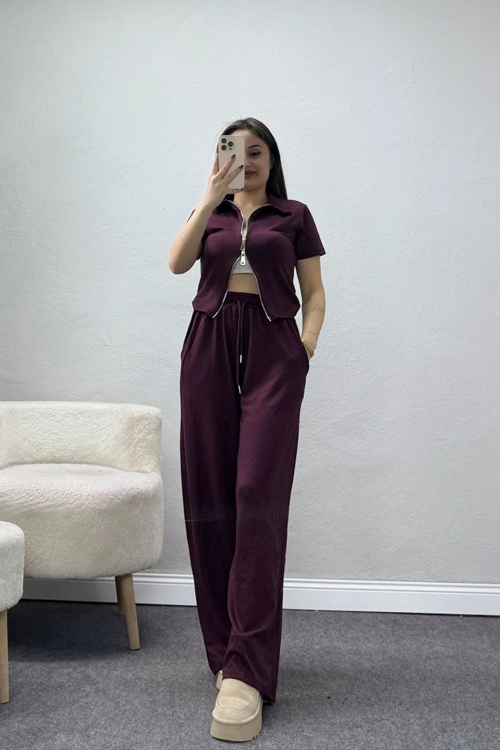 # Modal Fermuarlı Kadın Eşofman Takımı ## Bordo Renkli ve Geniş Paça Detaylı Tasarım Yumuşak dokusuyla yüksek konfor sunan bordo **kadın eşofman takımı**, modal kumaşın nefes alan doğal yapısı sayesinde cildinizi gün boyu ferah tutar. Bu parça, fonksiyonel fermuarlı üst tasarımı ve esnek lastikli bel yapısıyla hareket özgürlüğünü kısıtlamadan vücudunuza uyum sağlamaktadır. **Modal eşofman takımı arayanlar için** titizlikle hazırlanan modelimiz, modern kesimi ve kaliteli dikim detaylarıyla sportif bir görünümün kapılarını aralar. Üst kısımdaki metal fermuar detayı pratik kullanım sağlarken alt parçadaki dökümlü duruş estetik bir bütünlük oluşturur. Bordo rengin asaletini yansıtan bu tasarım, geniş paça kesimiyle modern bir silüet oluştururken modal liflerinin pürüzsüz dokusunu her adımda hissettirir. Üst modülün kısa kol formu ve alt modülün ayarlanabilir kordonlu beli, kişiselleştirilebilir bir rahatlık ve dengeli bir oturuş sergiler. **Geniş paça eşofman** altı ile tamamlanan bu set, dayanıklı kumaş yapısı sayesinde rengini ve formunu defalarca yıkamadan sonra bile korumayı başarır. Yan kısımlarda bulunan derin cepler ve dökümlü kumaş bitişi ile bu **kadın eşofman takımı**, kalitesine göre oldukça uygun fiyatlı bir seçenektir. Siparişi tamamlamak için hemen sepete ekleyin.