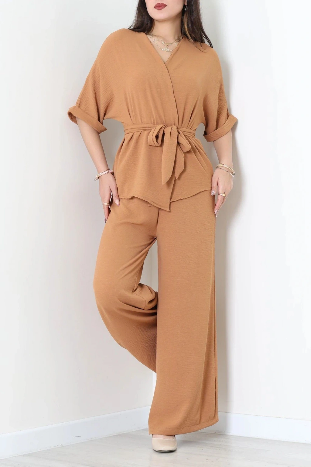 # Karamel Modal Kimono Takım ## Rahat Kesim ve Estetik Detaylar Hafif dokusu ve sofistike duruşuyla bu **modal kimono takım**, gün boyu konfor sunarken karamel tonunun sıcaklığını stilinize yansıtmanıza yardımcı oluyor. Bu parça, akışkan kumaşı sayesinde hareket özgürlüğü tanıyarak cildinizin nefes almasını destekler. Modelimiz, kimono kesim üst tasarımıyla modern bir silüet oluştururken ikili takım konseptini şık bir duruşla sunuyor. Rahat ve şık takım arayanlar için hazırlanan bu tasarım, dökümlü yapısıyla zarif görünür. Tasarımın belindeki kuşak detayı, vücut hatlarını belirginleştirerek **kuşaklı ceket** formundaki üst bölüme estetik bir hava katıyor. **Geniş paça pantolon** kesimi, adımlara akıcılık kazandırırken kumaşın yumuşak dokusu kullanım süresince konforlu bir his uyandırıyor. Bu **kadın ikili takım** seçeneğinde bulunan V yaka kesimi, dekolte bölgesine duru bir zarafet ekliyor. Kaliteli materyal seçimiyle öne çıkan bu modal kimono takım, ekonomik bir seçenek olarak dikkat çekiyor. Beğendiyseniz hemen sepete ekleyin.