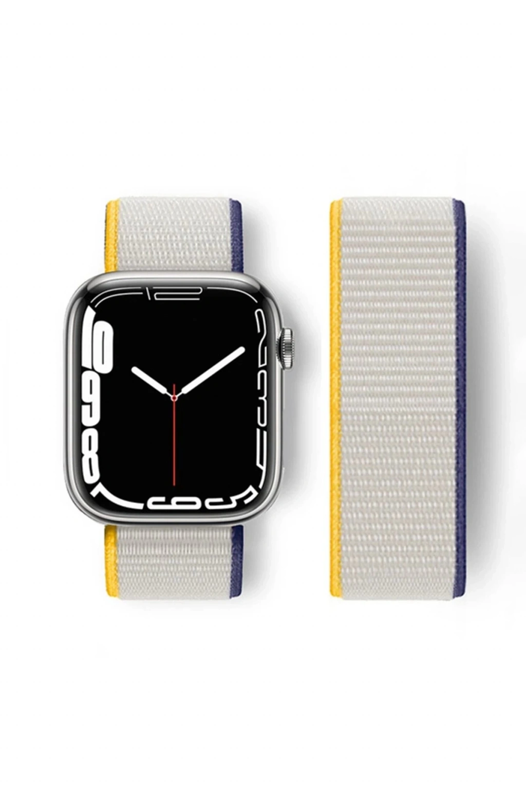 Newface Apple Watch 38mm Hasırlı Cırtcırtlı Kordon - Sarı-Beyaz