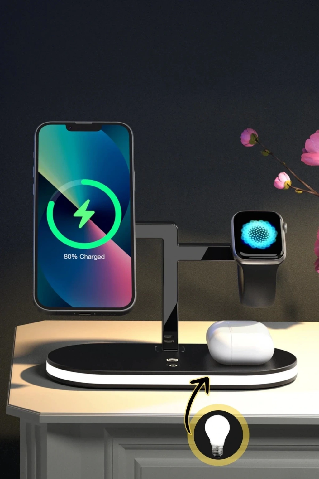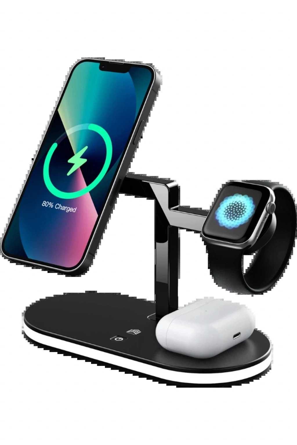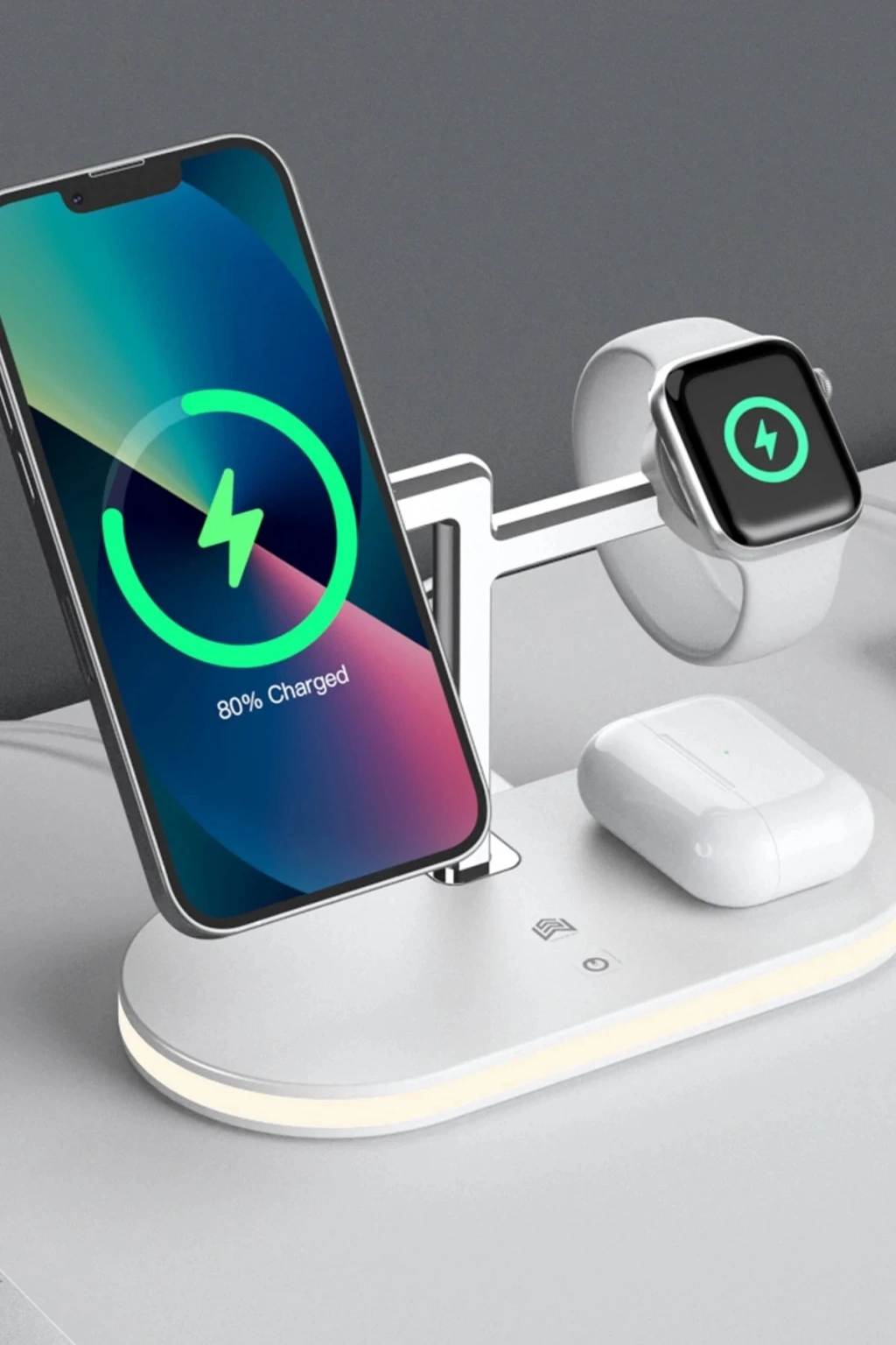 Telefon, kablosuz kulaklık ve akıllı saat gibi farklı cihazları aynı anda şarj ederken şık ve düzenli bir kullanım sunar.