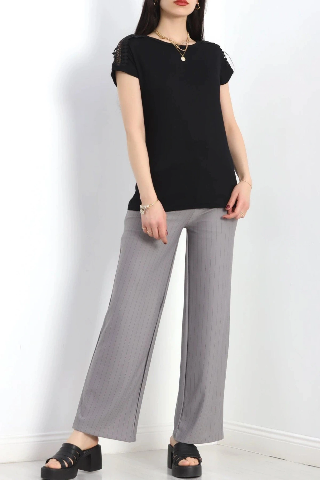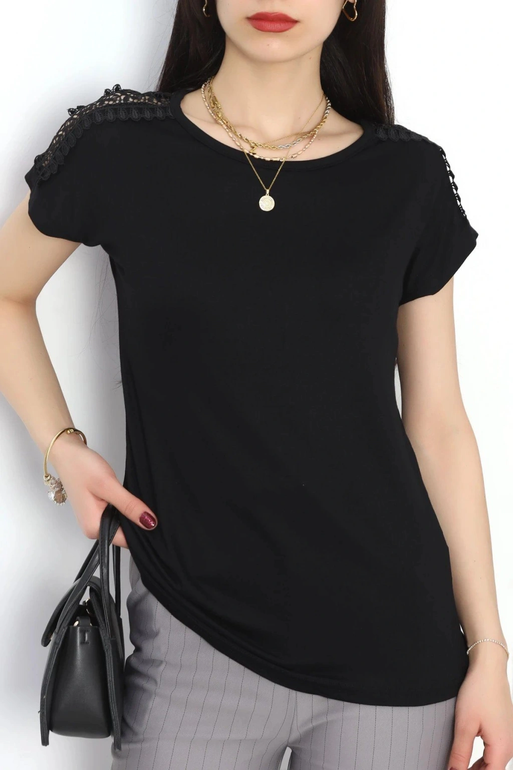 # Omuz Dantelli Siyah Bluz ## Tasarım Özellikleri ve Konfor Zarif detaylarla hareketlendirilen bu **omuz dantelli bluz**, yumuşak dokusuyla cildinize nefes aldıran bir konfor sunarken şıklığı ön plana çıkarıyor. Siyah rengin asaletini taşıyan modelimiz, omuz bölgesindeki ince işlemeleriyle dikkat çekici bir estetik görünüme sahip. Hafif yapısı sayesinde gün boyu ağırlık yapmadan üzerinizde kalır ve teninize tam uyum sağlar. **Şık bir omuz dantelli bluz arayanlar için** hazırlanan bu özel tasarım, viskon içeriğiyle terlemeyi önlerken esnek yapısıyla her ortamda sınırsız hareket özgürlüğü sunar. Kısa kollu kesimi ve klasik yuvarlak yaka formuyla öne çıkan bu **siyah viskon bluz**, omuz kısmındaki transparan dantel ve file geçişleriyle sofistike bir dokunuş kazanıyor. Kumaşın dökümlü duruşu vücut hatlarını zarifçe sarmalar ve doğal bir silüet oluşturur. Omuzlardaki **dantel detaylı üst** tasarımı, kıyafete görsel bir derinlik katarak doku zenginliğini vurgular. Bu omuz dantelli bluz, kaliteli dikiş teknikleri ve solmaya karşı dirençli boyasıyla uzun ömürlü kullanım imkanı sağlayan oldukça ekonomik bir seçenektir. Sepete ekleyerek hemen satın alın.