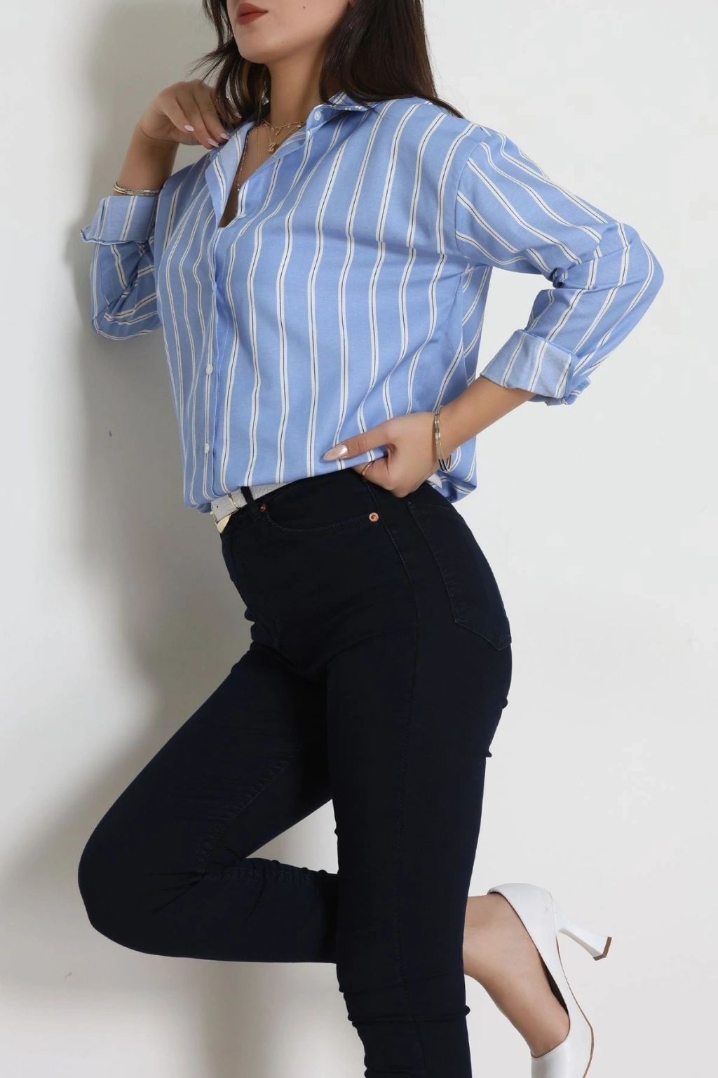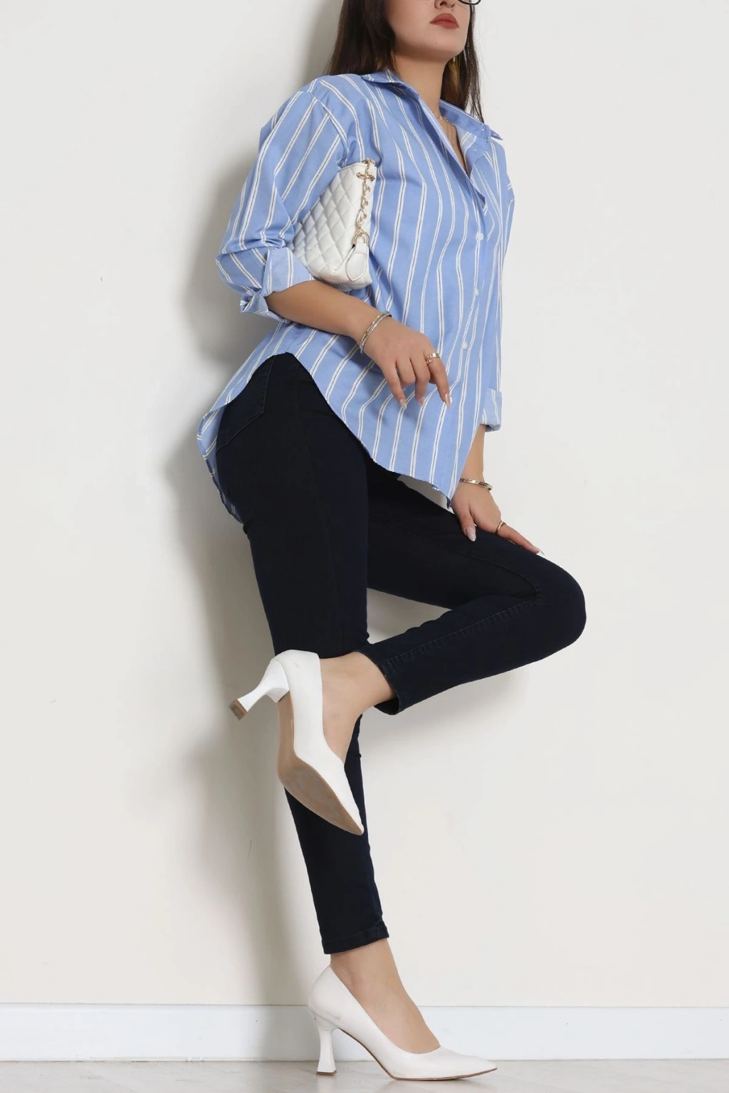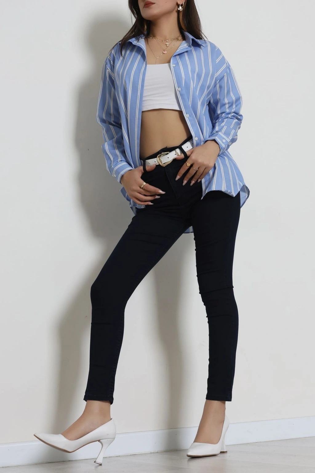 Pamuk Polyester Çizgili Oversize Gömlek Mavibeyaz - 51052.147.