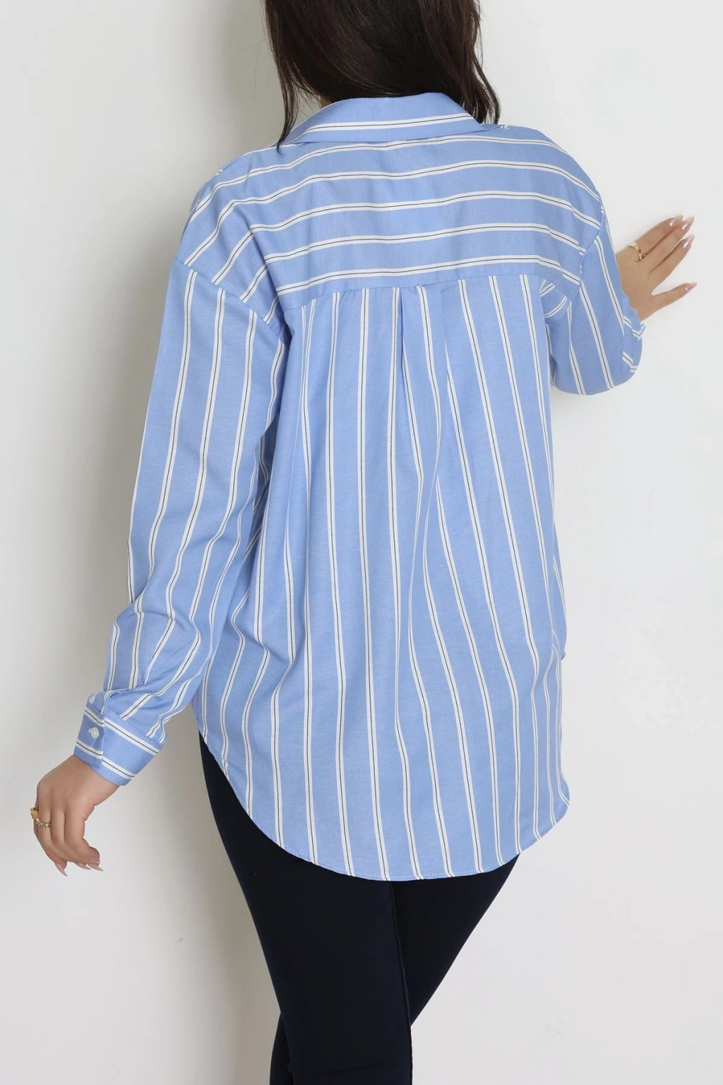 Pamuk Polyester Çizgili Oversize Gömlek Açıkmavi - 51052.147.