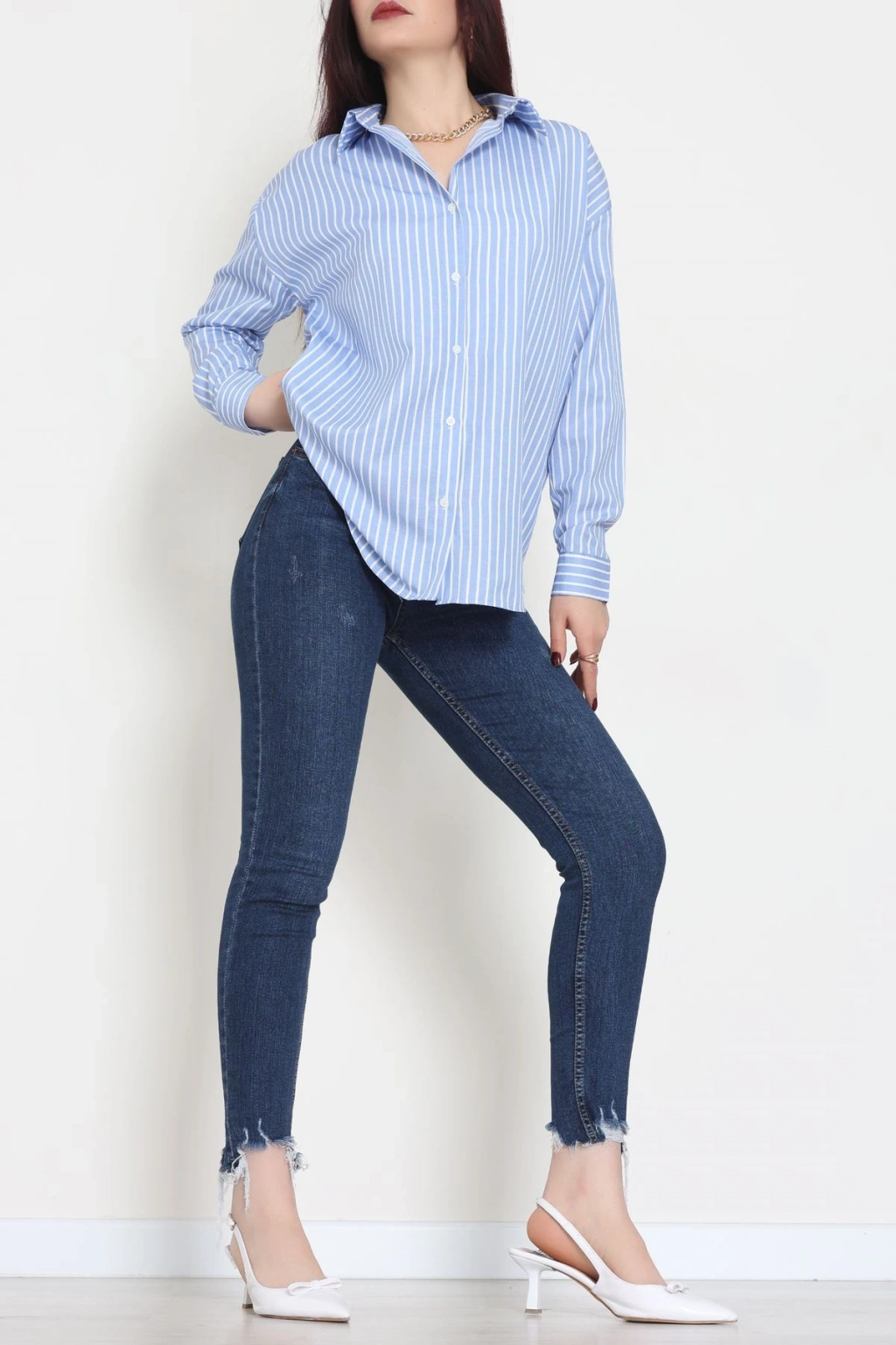 Pamuk Polyester Çizgili Oversize Gömlek Açıkmavi - 51052.147.