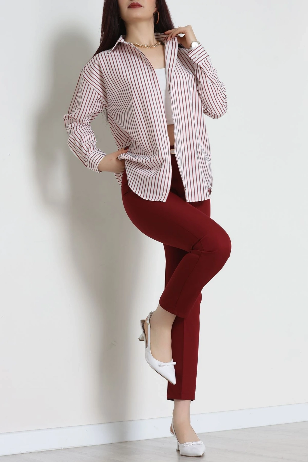 Pamuk Polyester Çizgili Oversize Gömlek Bordobeyaz - 51052.147.