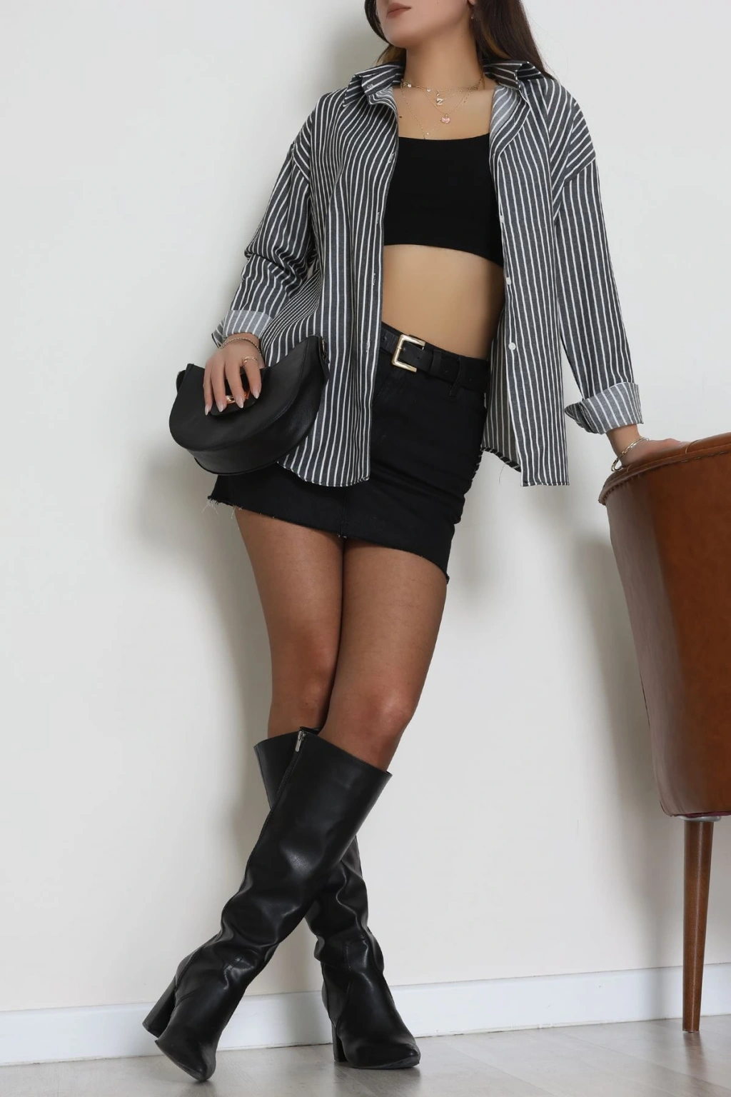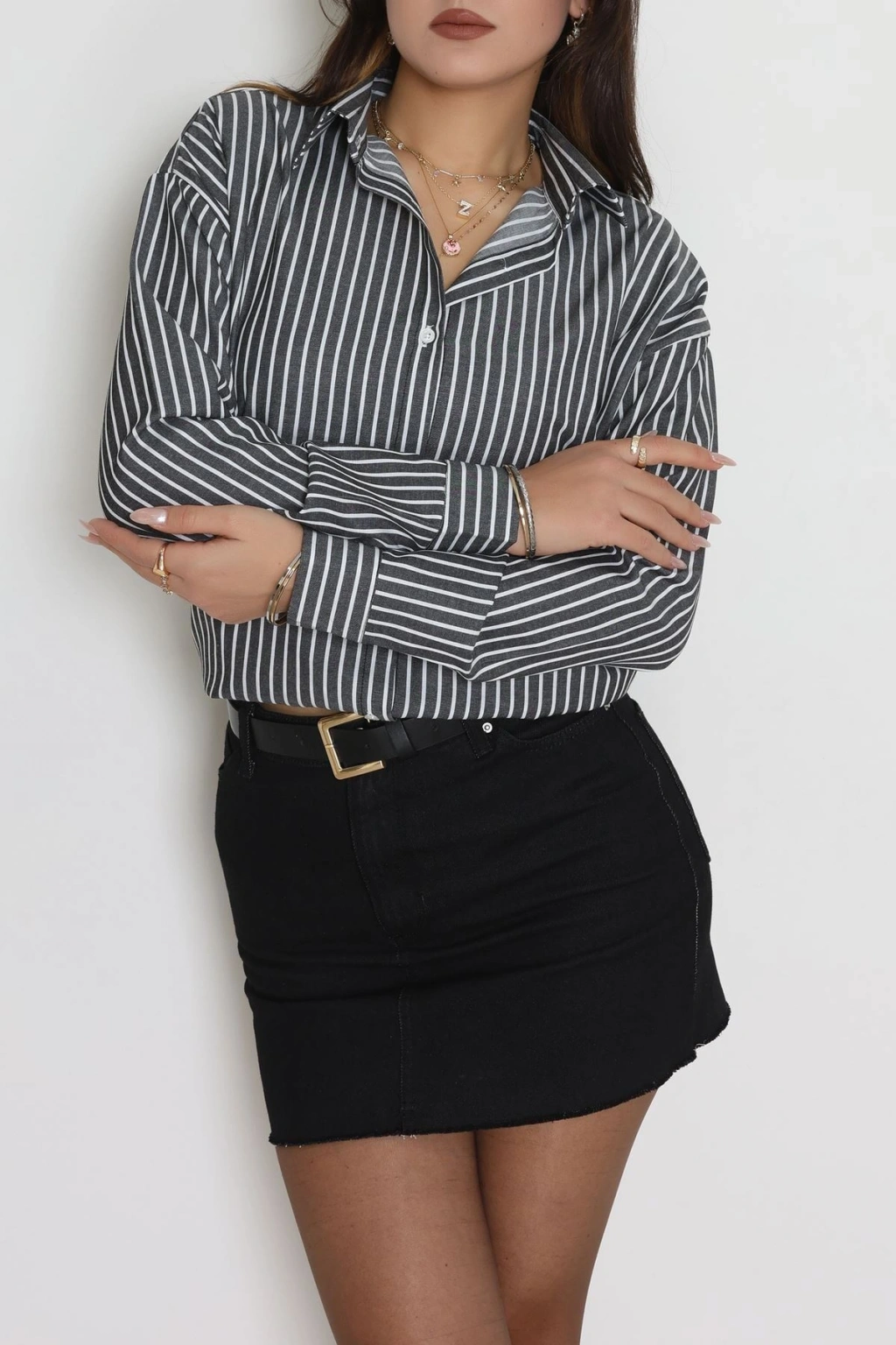 Pamuk Polyester Çizgili Oversize Gömlek Füme - 51052.147.