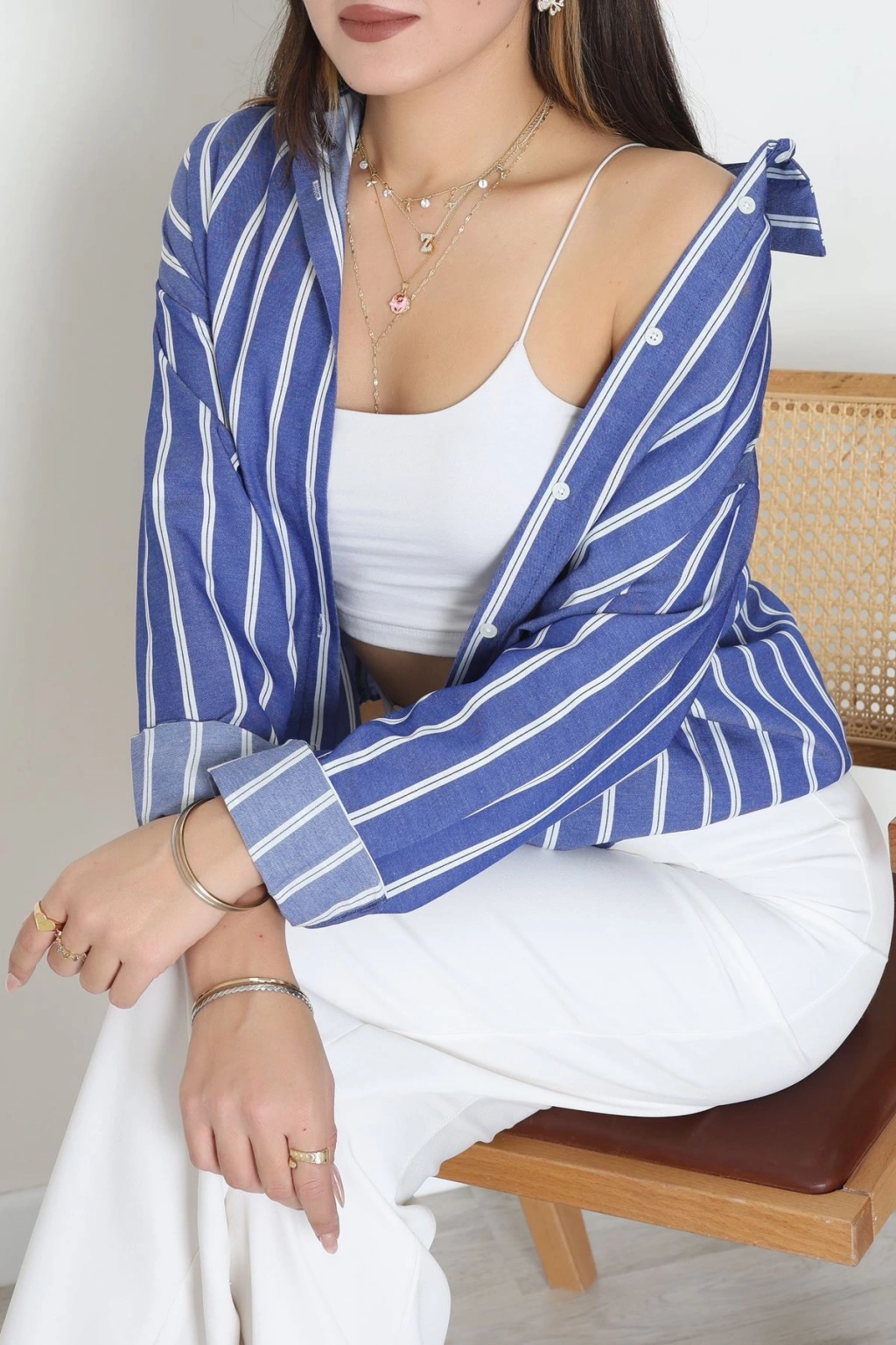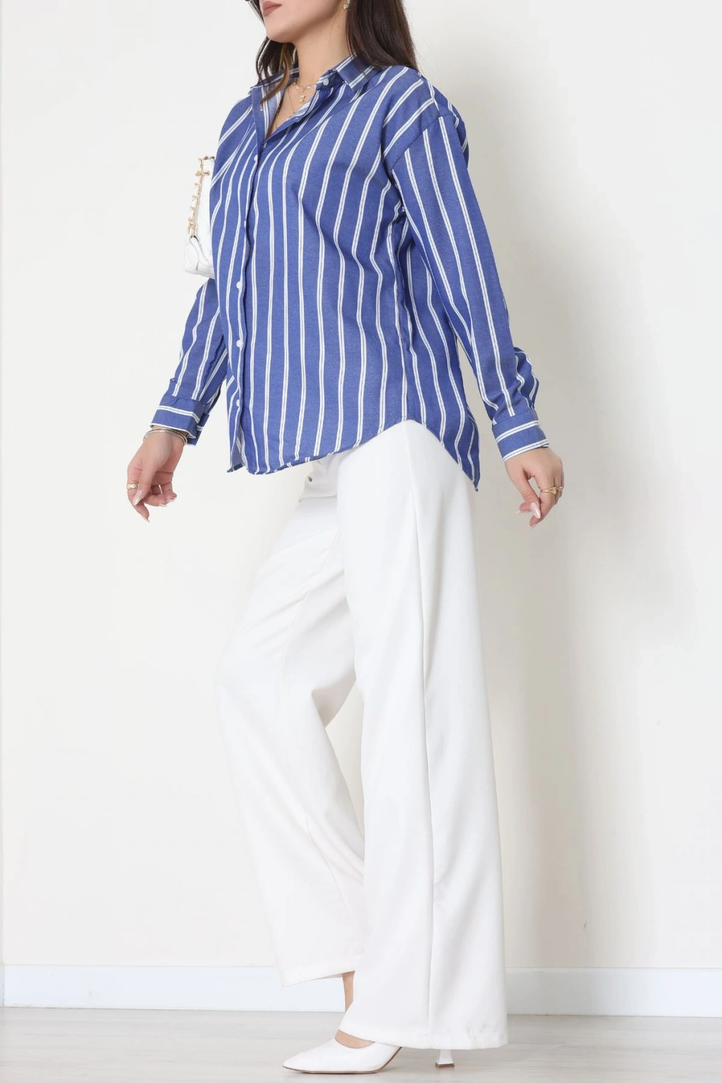 Pamuk Polyester Çizgili Oversize Gömlek Mavibeyaz1 - 51052.147.