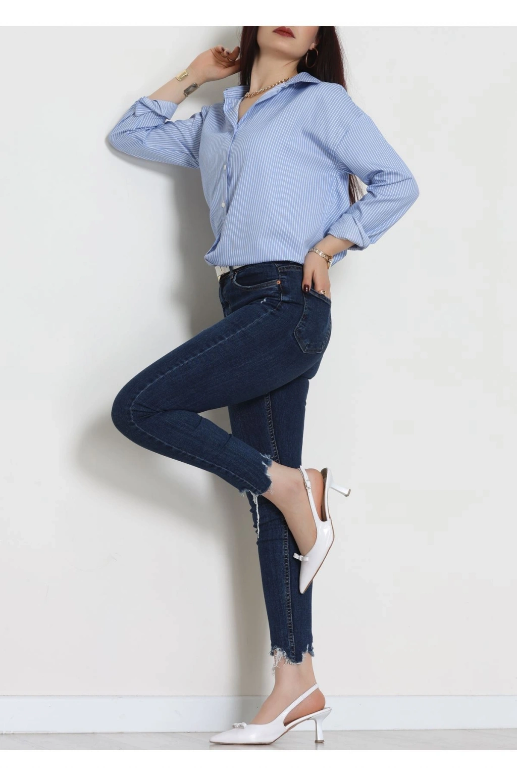 Pamuk Polyester Çizgili Oversize Gömlek Beyazmavi - 51052.147.