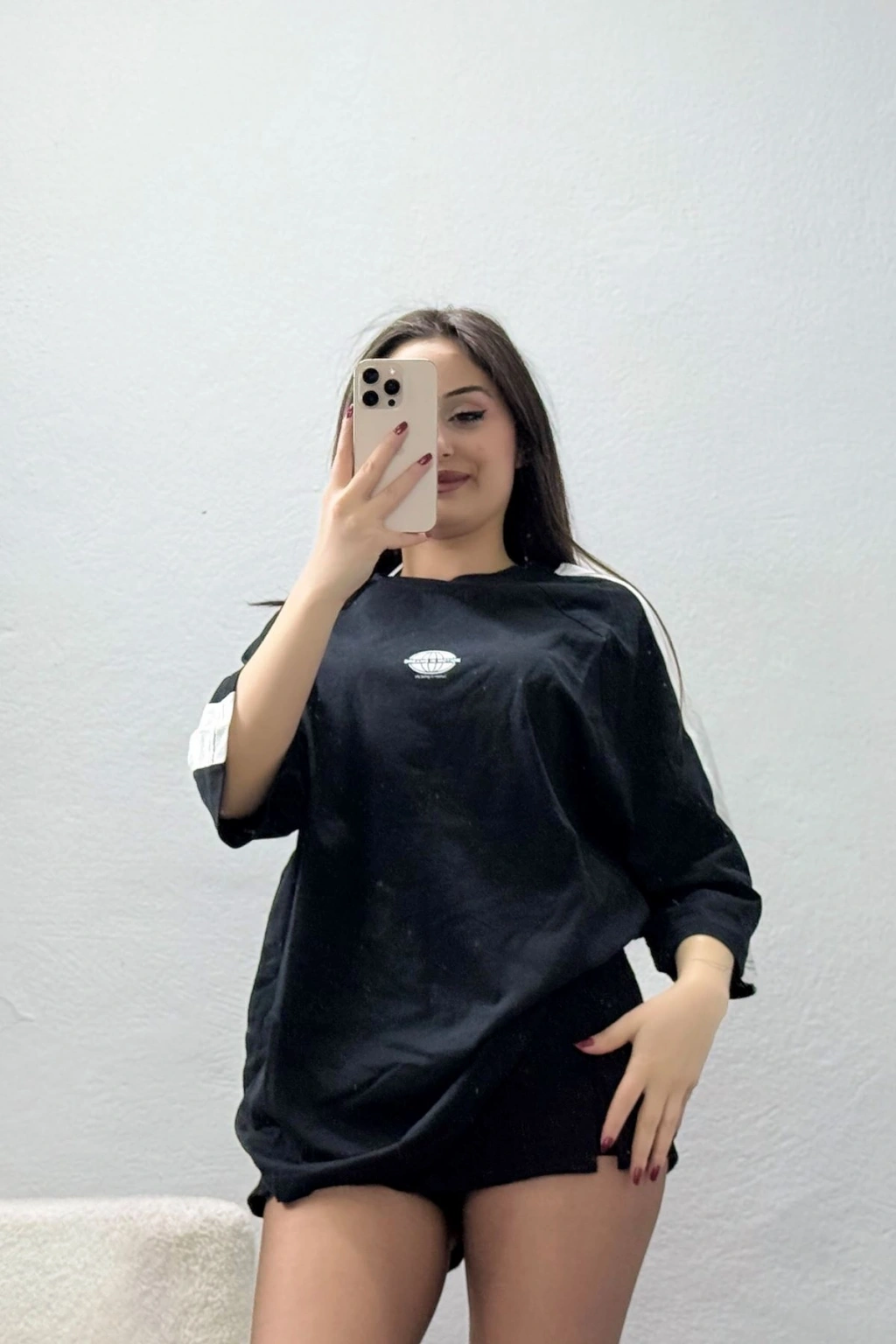 # Reglan Kol Garnili Oversize Tişört ## Rahat Kesim ve Esnek Tasarım Siyah rengin asaletiyle birleşen **reglan kol garnili oversize tişört** modeli, gün boyu süren konforu ve modern sokak stilini estetik bir çizgide bir araya getiriyor. Bu parça, terletmeyen süprem kumaşın yumuşaklığı ve esnek dokusuyla hareket özgürlüğünüzü en üst seviyeye taşımayı hedefliyor. Likralı yapısı sayesinde formunu uzun süre başarıyla koruyan modelimiz, siyah zemin üzerindeki kontrast beyaz garni detaylarıyla dinamik bir görünüm sunuyor. **Oversize tişört arayanlar için** özel olarak hazırlanan bu tasarım, salaş kesimiyle her vücut tipine ve ihtiyaca kolayca uyum sağlıyor. Omuzlardan aşağı doğru uzanan beyaz şerit garnileri ve göğüs kısmındaki minimal amblem detayı, tasarıma sportif ve enerjik bir karakter kazandırıyor. Süprem dokusunun sunduğu doğal yumuşaklık cildinizde pürüzsüz bir his bırakırken, **likralı tişört** özelliği esneklik ve kullanım kolaylığı sağlıyor. Dirsek hizasına kadar inen geniş kesimli kolları, sıcak havalarda vücudun hava almasına yardımcı olarak gün boyu ferahlık hissini destekliyor. Kaliteli dikiş yapıları ve dayanıklı **siyah kadın tişört** formuyla uzun süreli bir kullanım deneyimi sunan bu model, fiyat performans odaklı ekonomik bir seçenektir. Satın almak için sepete ekleyin.