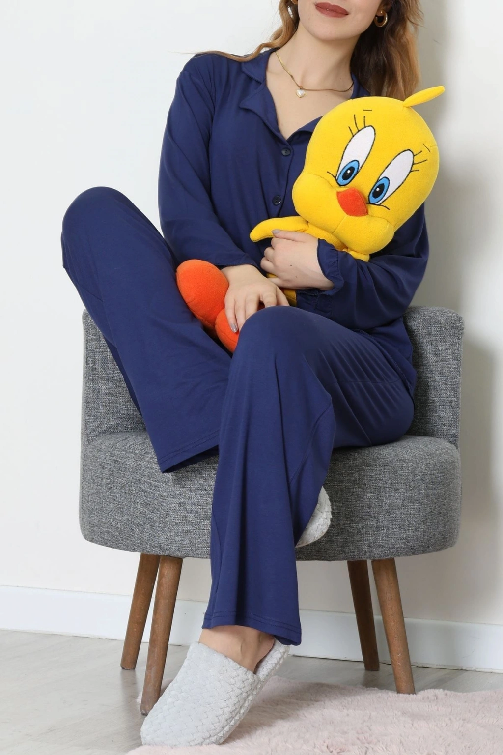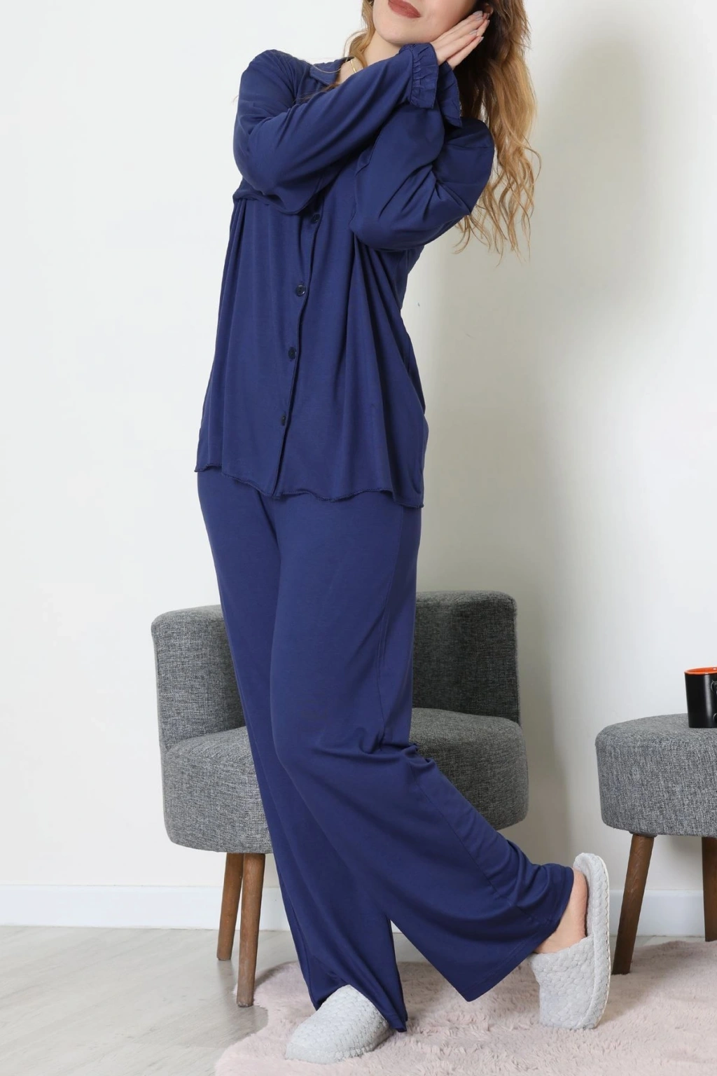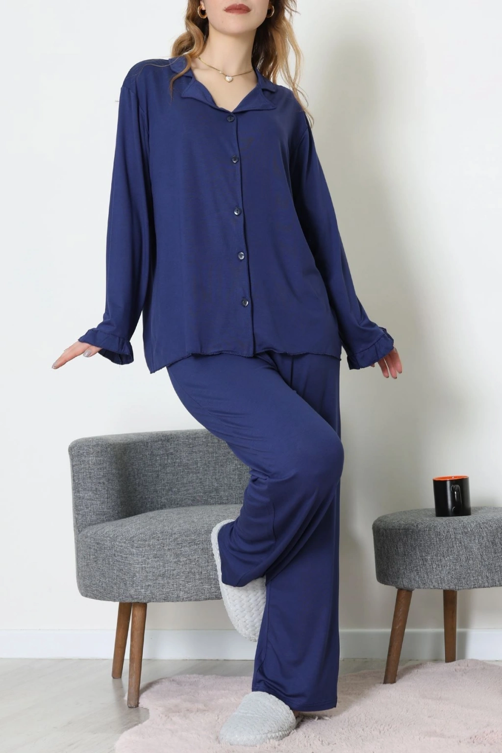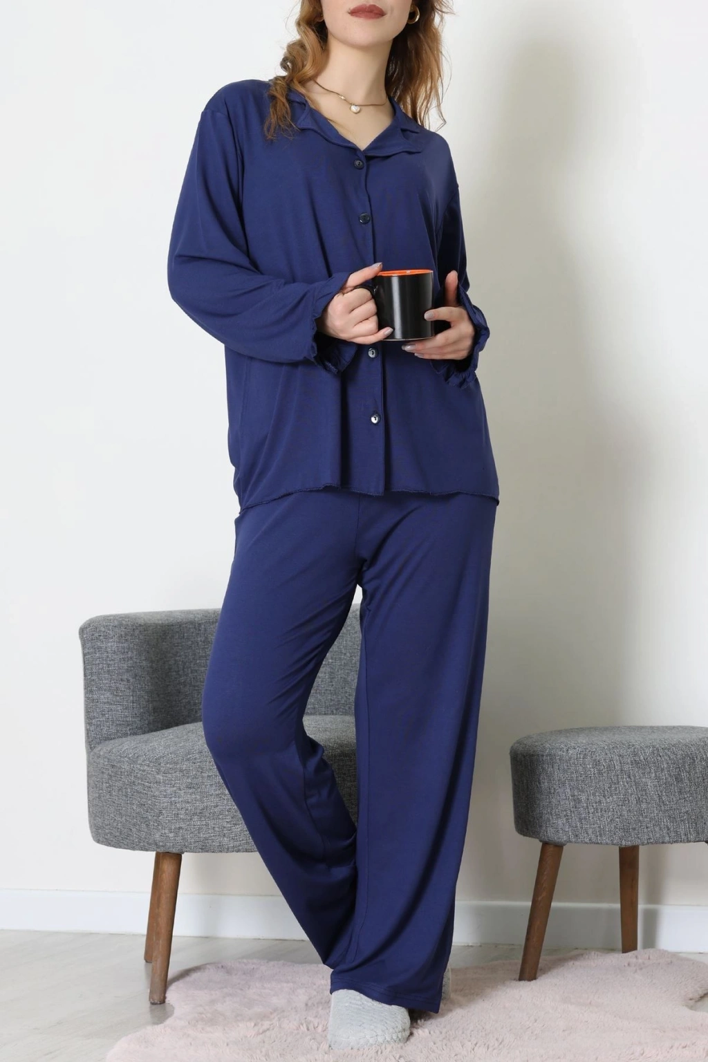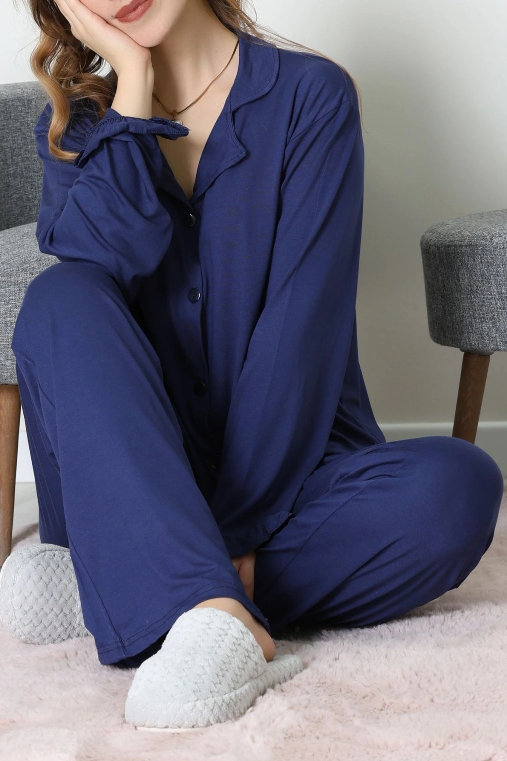 Ring Viskon Düğmeli Pijama Takımı Lacivert - 52201.1961.