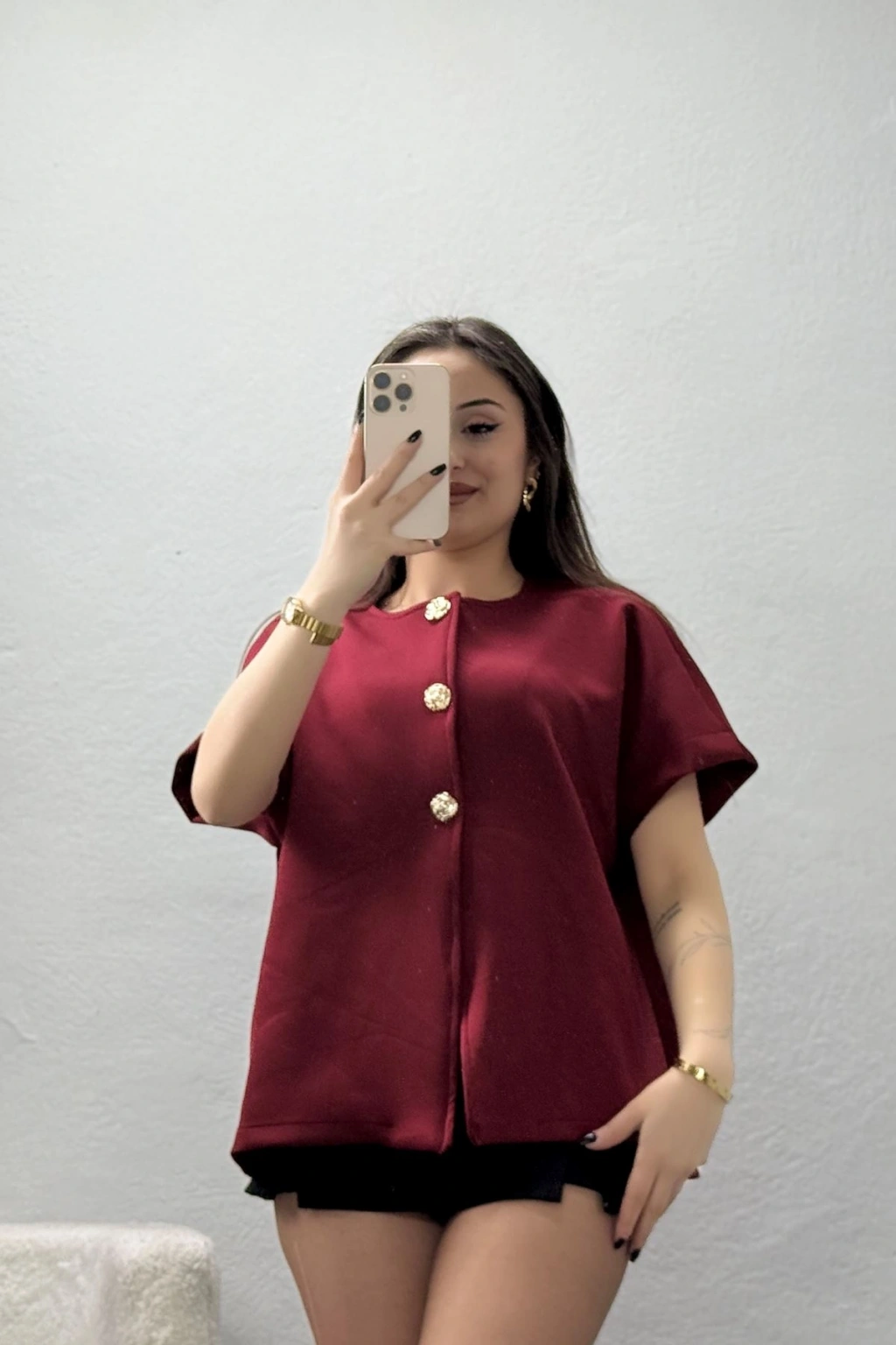 # Bordo Scuba Kumaş Ceket ## Şık Detaylar ve Konforlu Kesim Bordo scuba ceket modelimiz, pürüzsüz dokusuyla modern bir duruş sergilerken gün boyu hareket özgürlüğü sunan esnek bir yapıya sahiptir. Bu tasarım, tok duruşu sayesinde formunu uzun süre koruyan kaliteli bir kumaş teknolojisi ile üretilmiştir. **Gold düğmeli ceket** arayışında olanlar için ön kısımdaki iri metal detaylar zarif bir parıltı katar. Modelimiz, omuzlardan aşağı dökülen rahat kesimiyle vücut hatlarını yumuşatırken bordo rengin derinliğini vurgular. Kaliteli bordo scuba ceket kumaşın esnek lifleri sayesinde konforu ön planda tutar. Bu tasarımın göze çarpan fiziksel detayı, ön panelde dikey olarak konumlandırılan üç adet büyük altın renkli düğmesidir. **Kısa kollu ceket** yapısı hareket kabiliyetini artırırken scuba kumaşın pürüzsüz yüzeyi cilde yumuşak bir temas sunar. Yuvarlak yaka kesimi ve temiz dikiş bitişleri, modelin üretim kalitesini her ayrıntıda ön plana çıkarır. Gold düğmeli bordo ceket arayanlar için ideal bir tercih olan **bordo kadın ceket**, dökümlü duruşuyla şık bir silüet oluşturur. Kalitesiyle uzun süre kullanım imkanı tanıyan bu model, fiyat performans ürünü olarak öne çıkan ekonomik bir seçenektir. Satın almak için hemen sepete ekleyin.