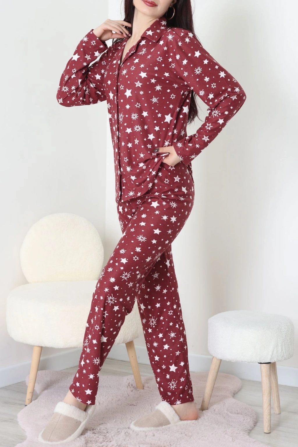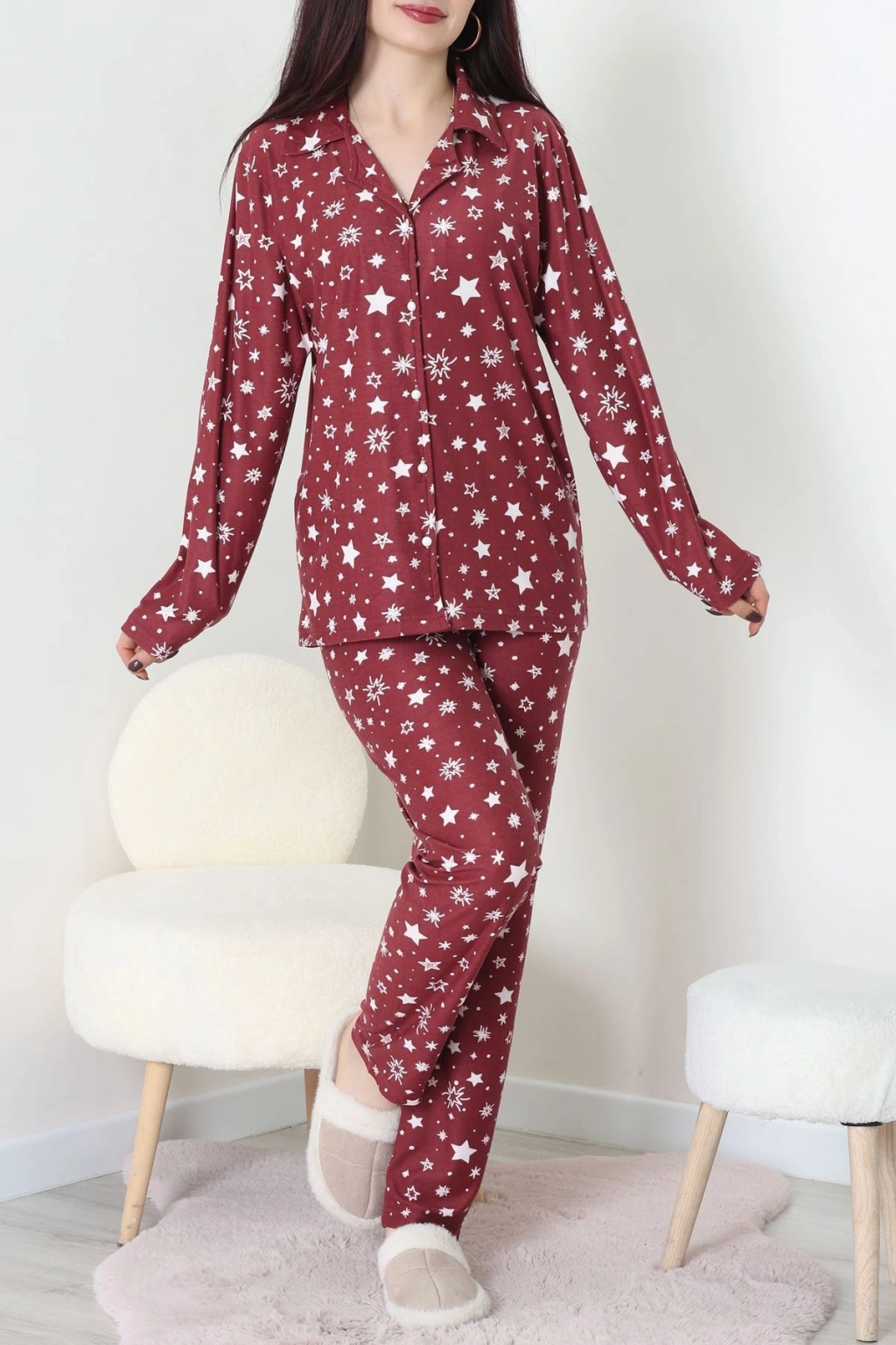 Süet Düğmeli Pijama Takımı Bordo - 31876.1049.