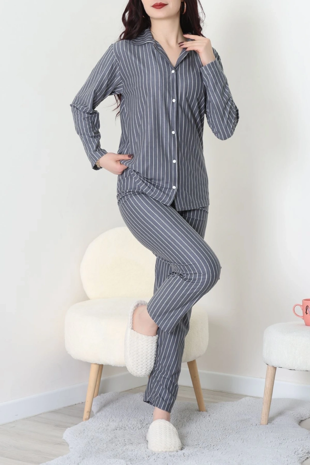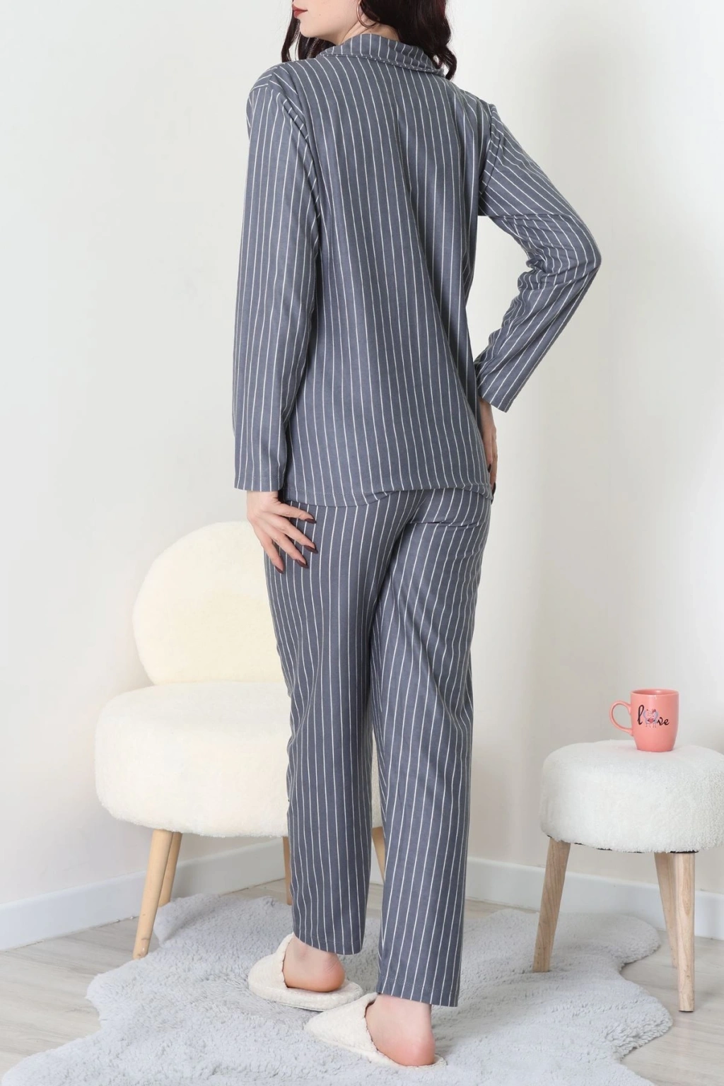 Süet Düğmeli Pijama Takımı Griçizgili - 52199.1783.