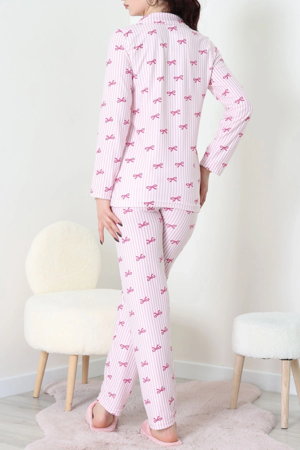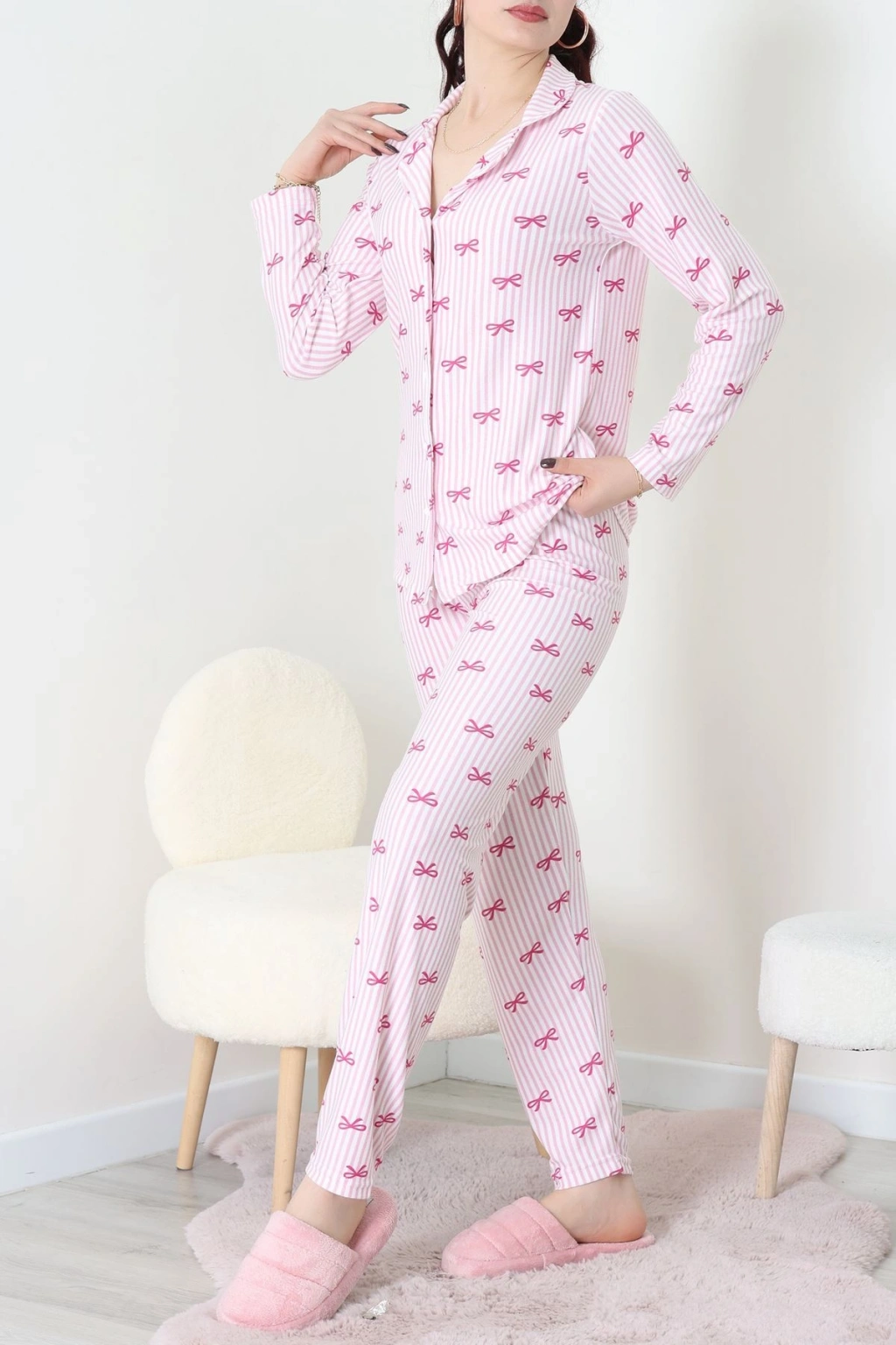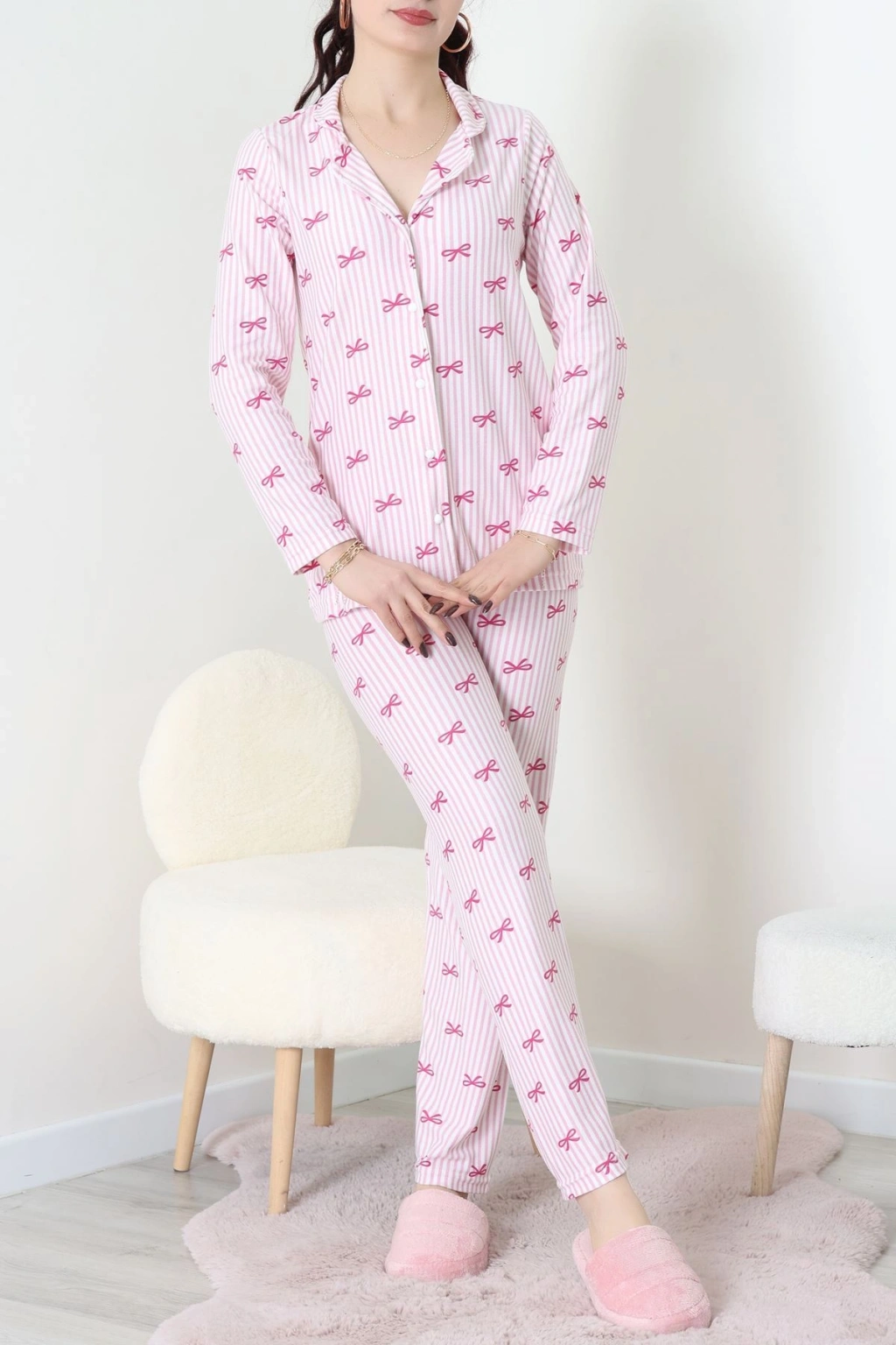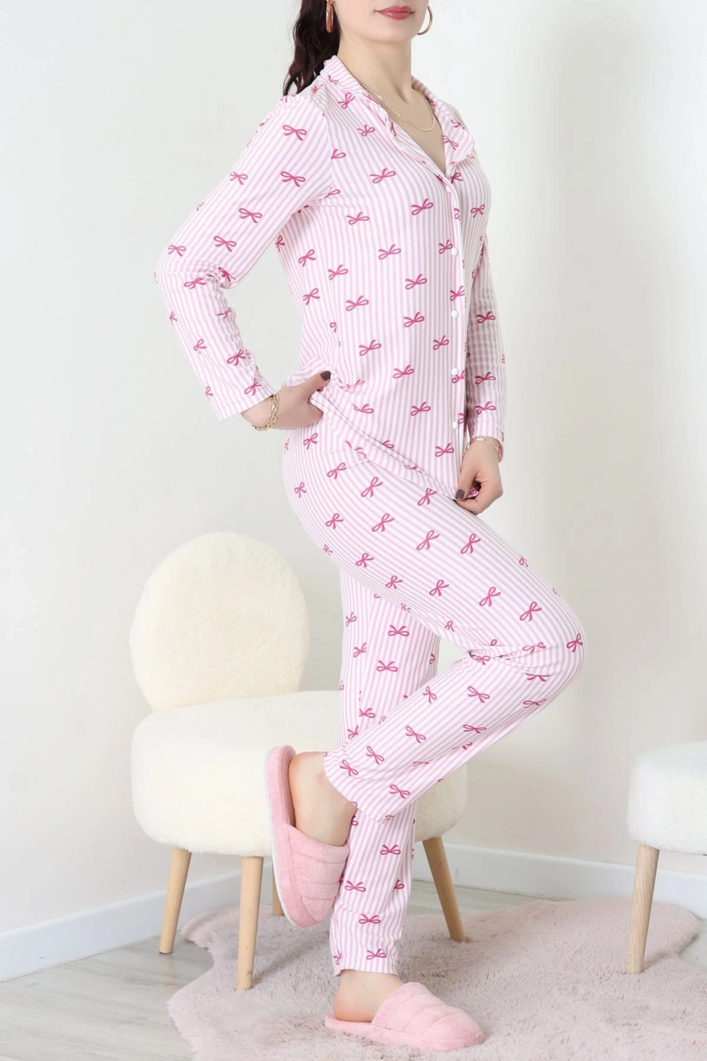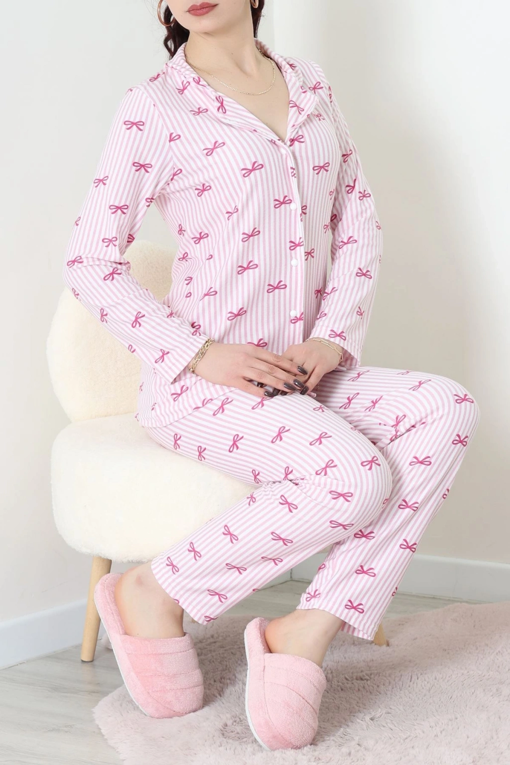 Süet Düğmeli Pijama Takımı Pembeçizgili - 52199.1783.