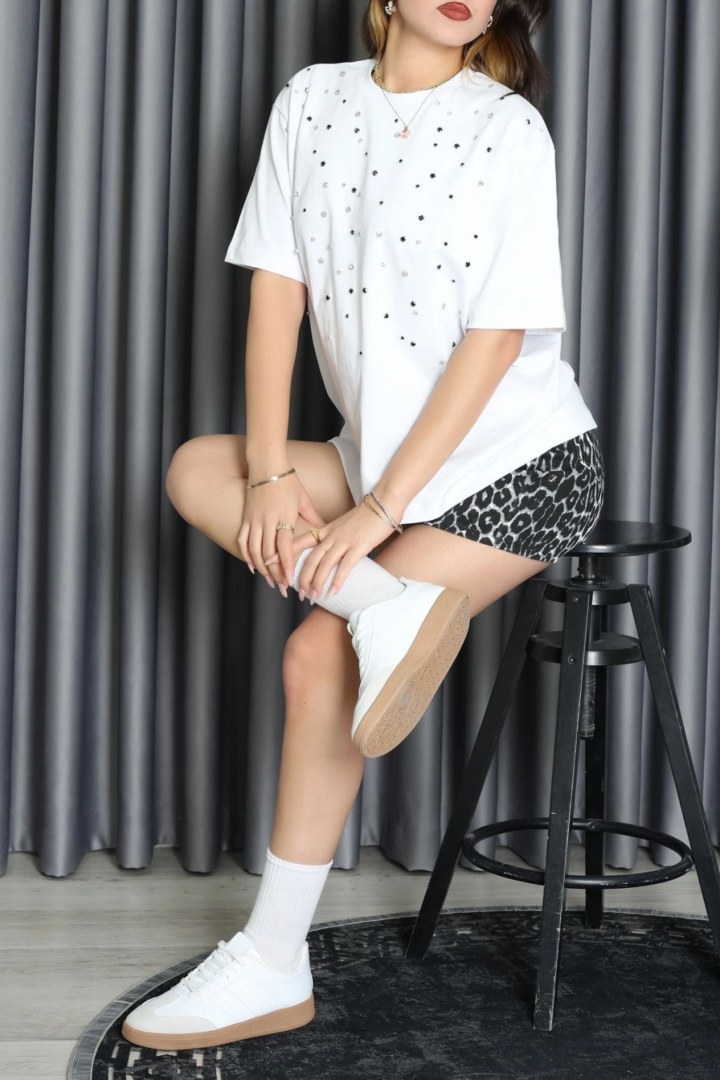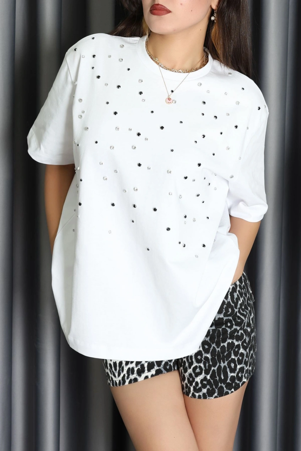 Taşlı Örme Oversize Tişört Beyaz - 50551.444.