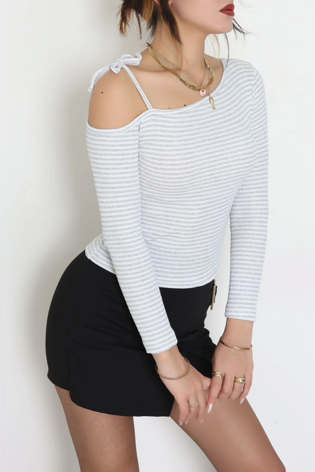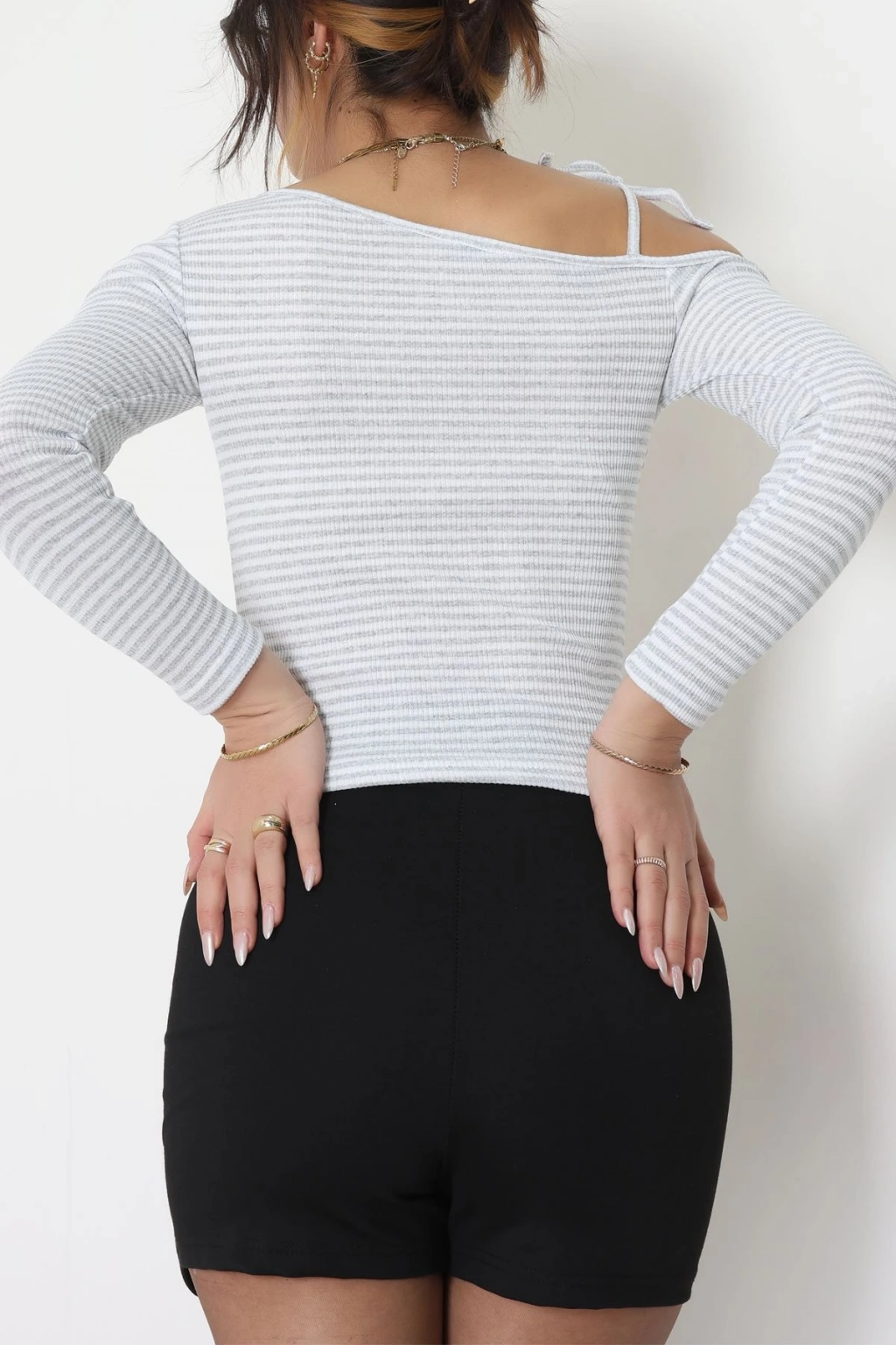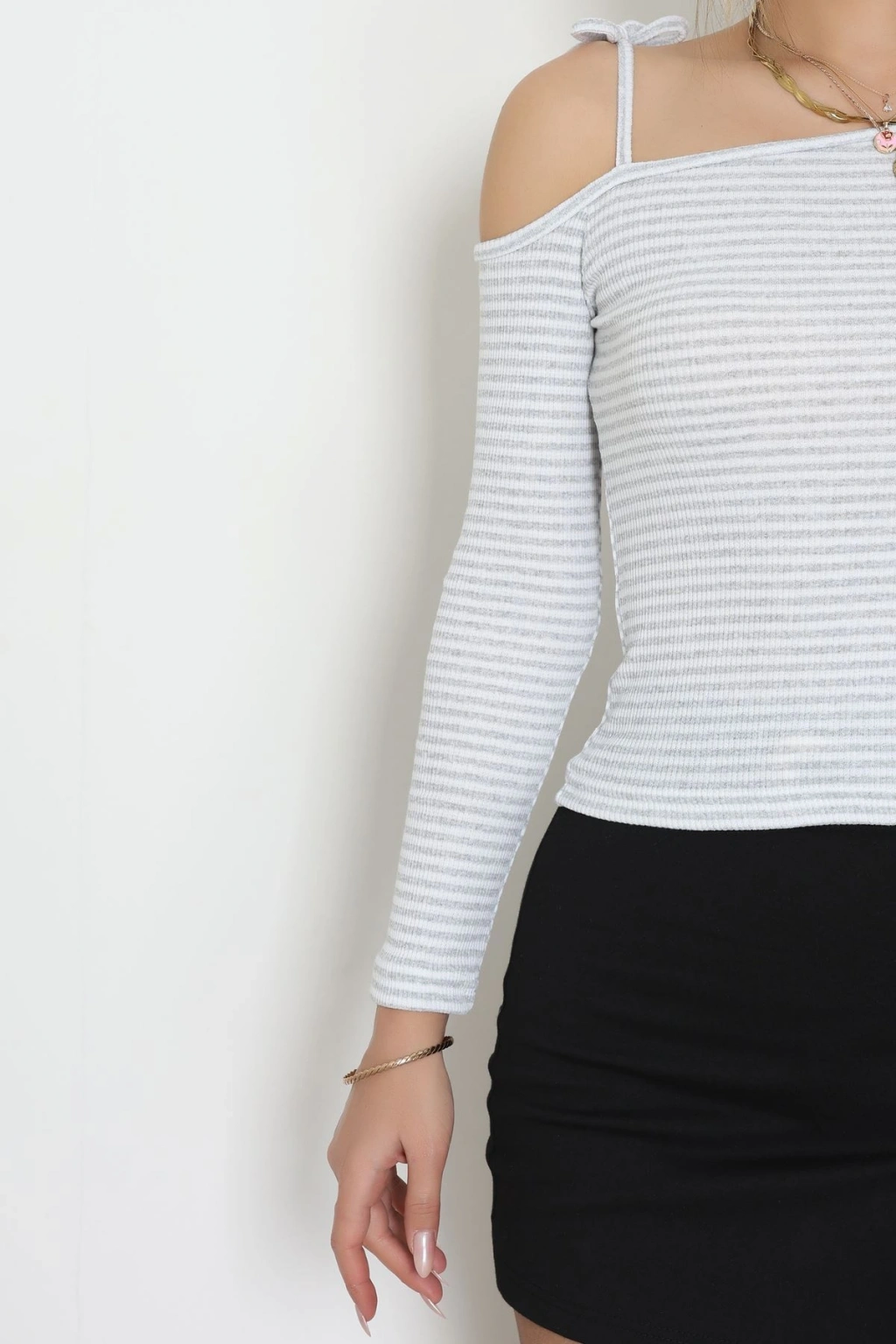 Tek Omuz Detaylı Likralı Kaşkorse Bluz Gribeyaz - 51091.1567.