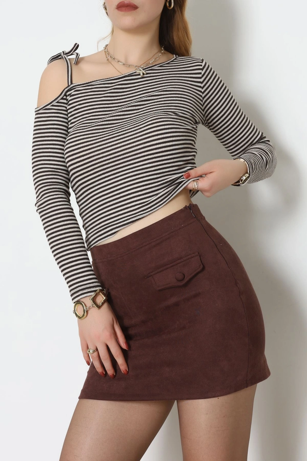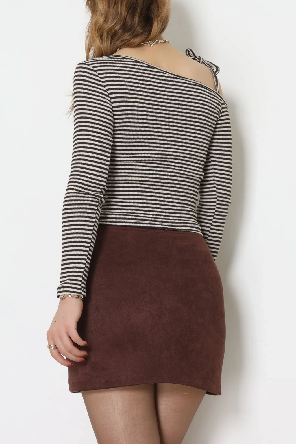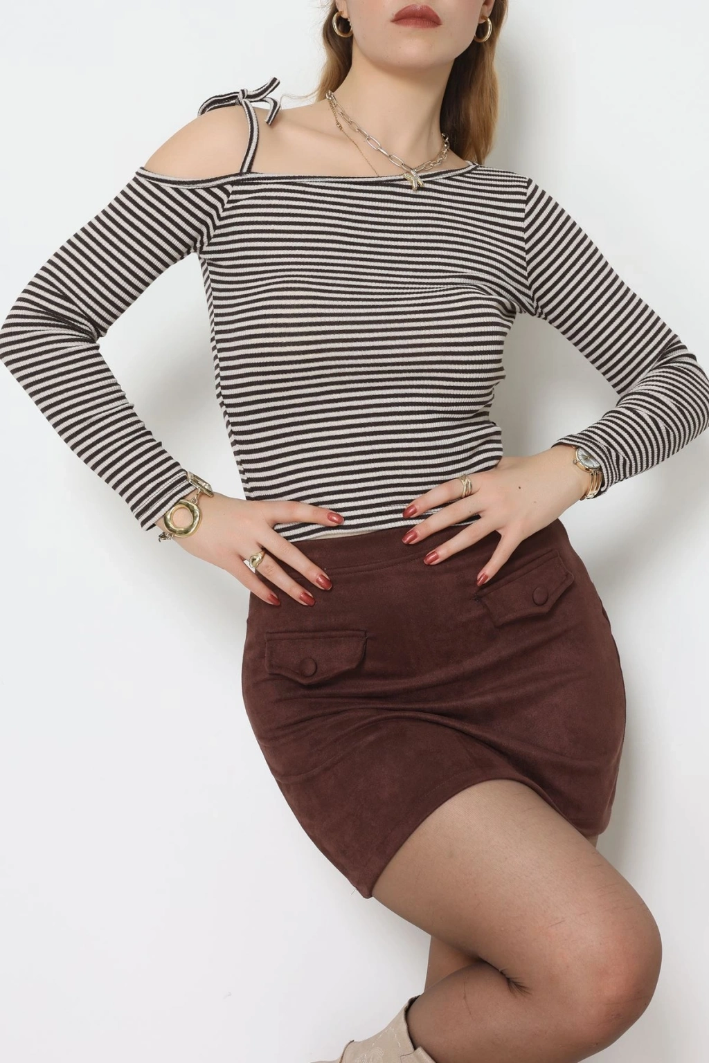 Tek Omuz Detaylı Likralı Kaşkorse Bluz Kahvelatte - 51091.1567.