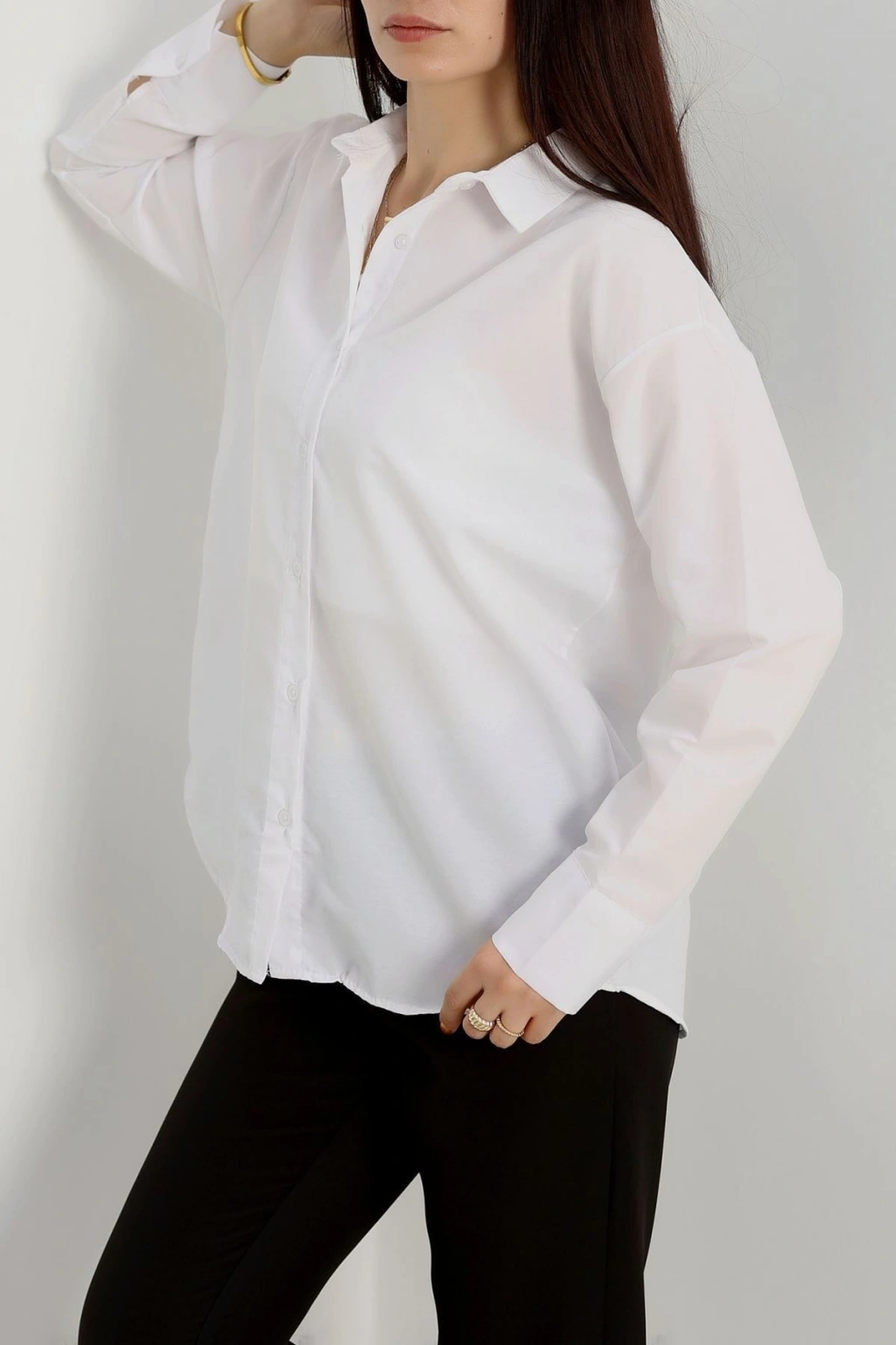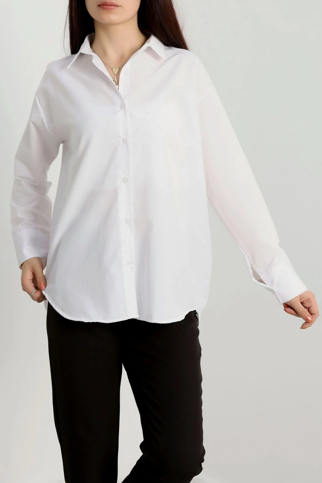 # Terikoton Oversize Gömlek ## Özellikler ve Kullanım Gün boyu süren rahatlığı ve modern şıklığı bir arada arayanlar için bu **terikoton oversize gömlek**, beklentilerinizi fazlasıyla karşılayacak. Esnekliği olmayan, hafif ve nefes alabilen terikoton kumaşı sayesinde cildinize nazik bir dokunuş sunan bu parça, sıcak havalarda bile ferah bir kullanım sağlar. Geniş ve **salaş kesim** kalıbı, hareket özgürlüğünüzü kısıtlamazken, stilinize rahat bir hava katıyor. Bu **beyaz gömlek**, bol duruşuyla çağdaş bir silüet yaratır ve minimal detaylarıyla dikkat çeker. Görselde belirgin olan yakalı tasarımı ve ön kısmındaki düğmeleri, klasik bir dokunuş sunarken, sade rengiyle kolayca kombinlenebilir. Yüksek kaliteli terikoton dokusuyla uzun ömürlü kullanım vaat eden bu özel **kadın gömlek**, fiyat performans açısından oldukça cazip bir seçenektir. Hemen sepete ekleyin.