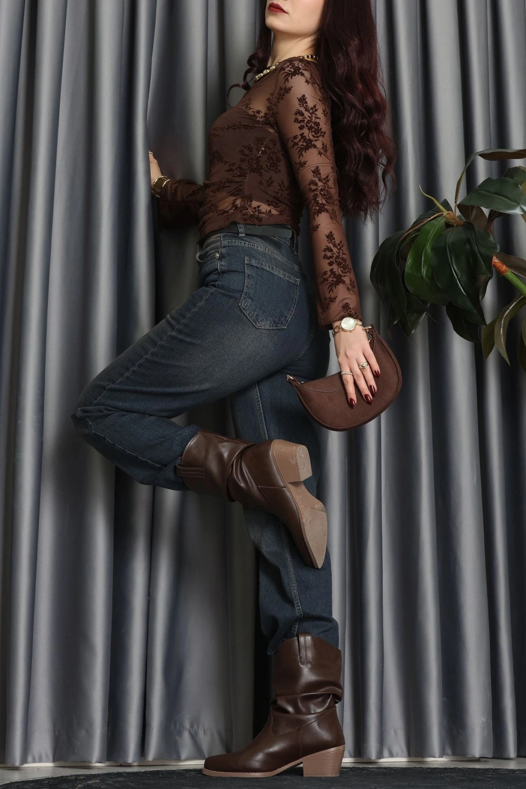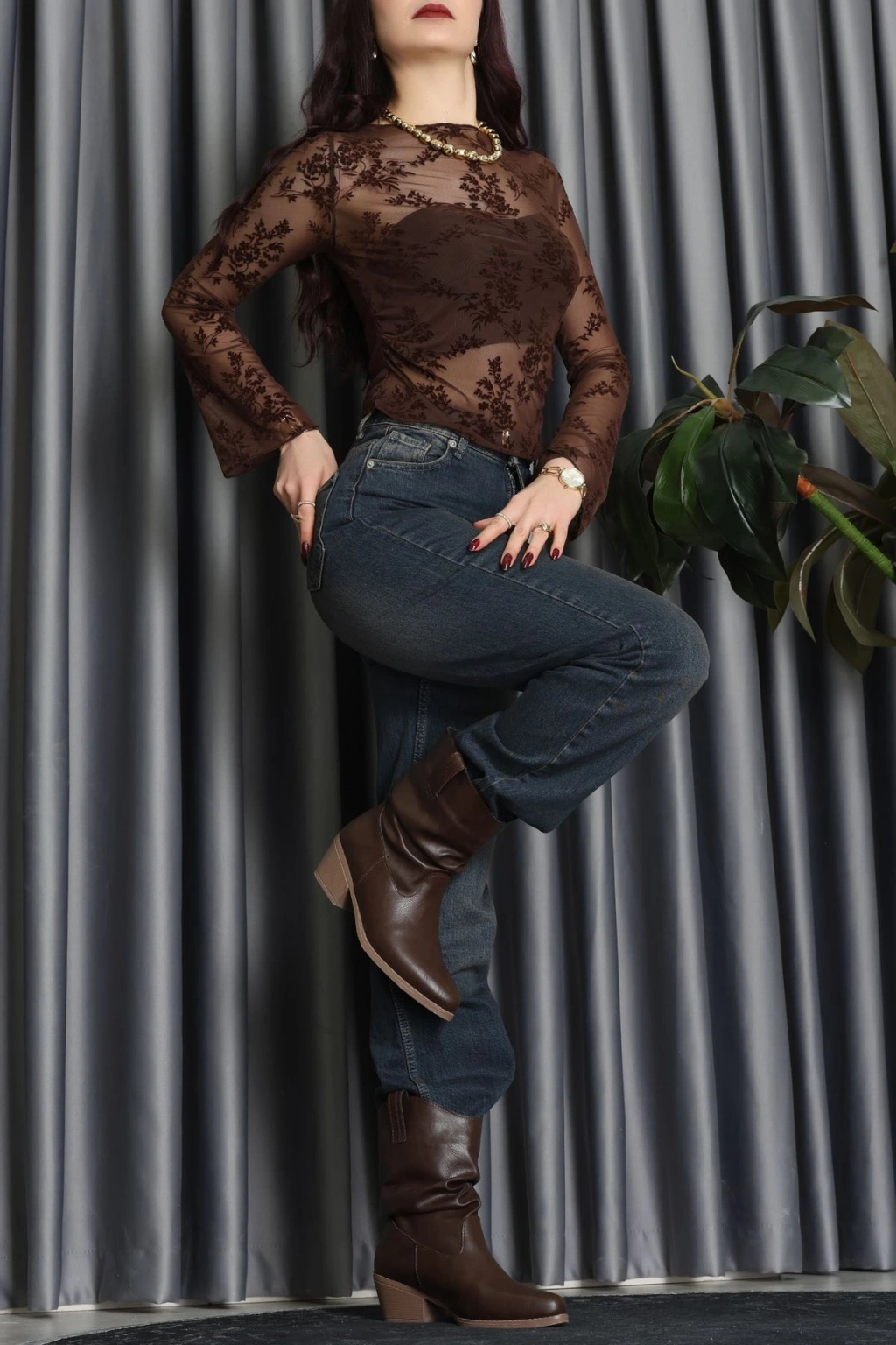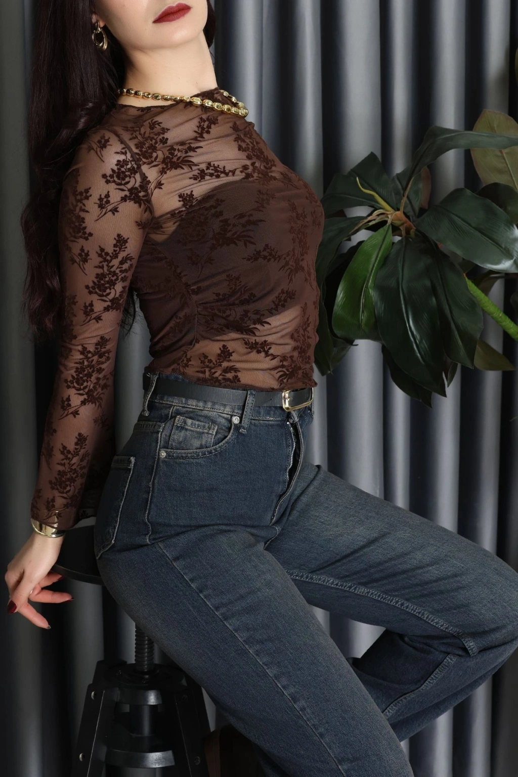 Transparan Şifon Kayık Yaka Bluz Kahve - 70847.2078.