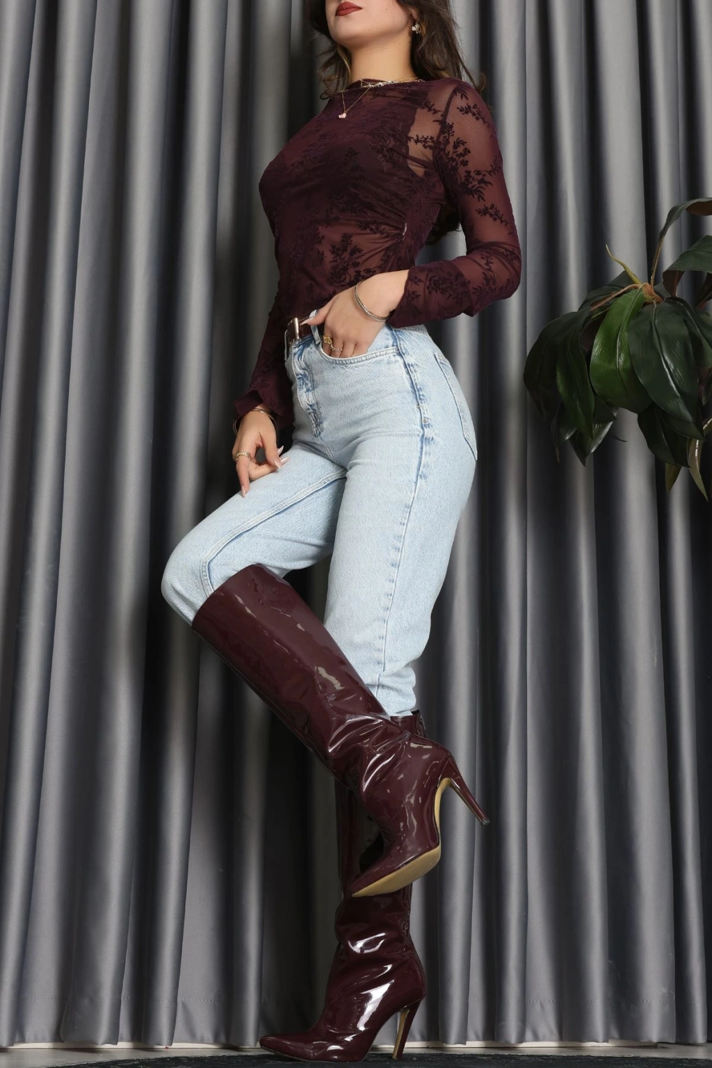 Transparan Şifon Kayık Yaka Bluz Mürdüm - 70847.2078.