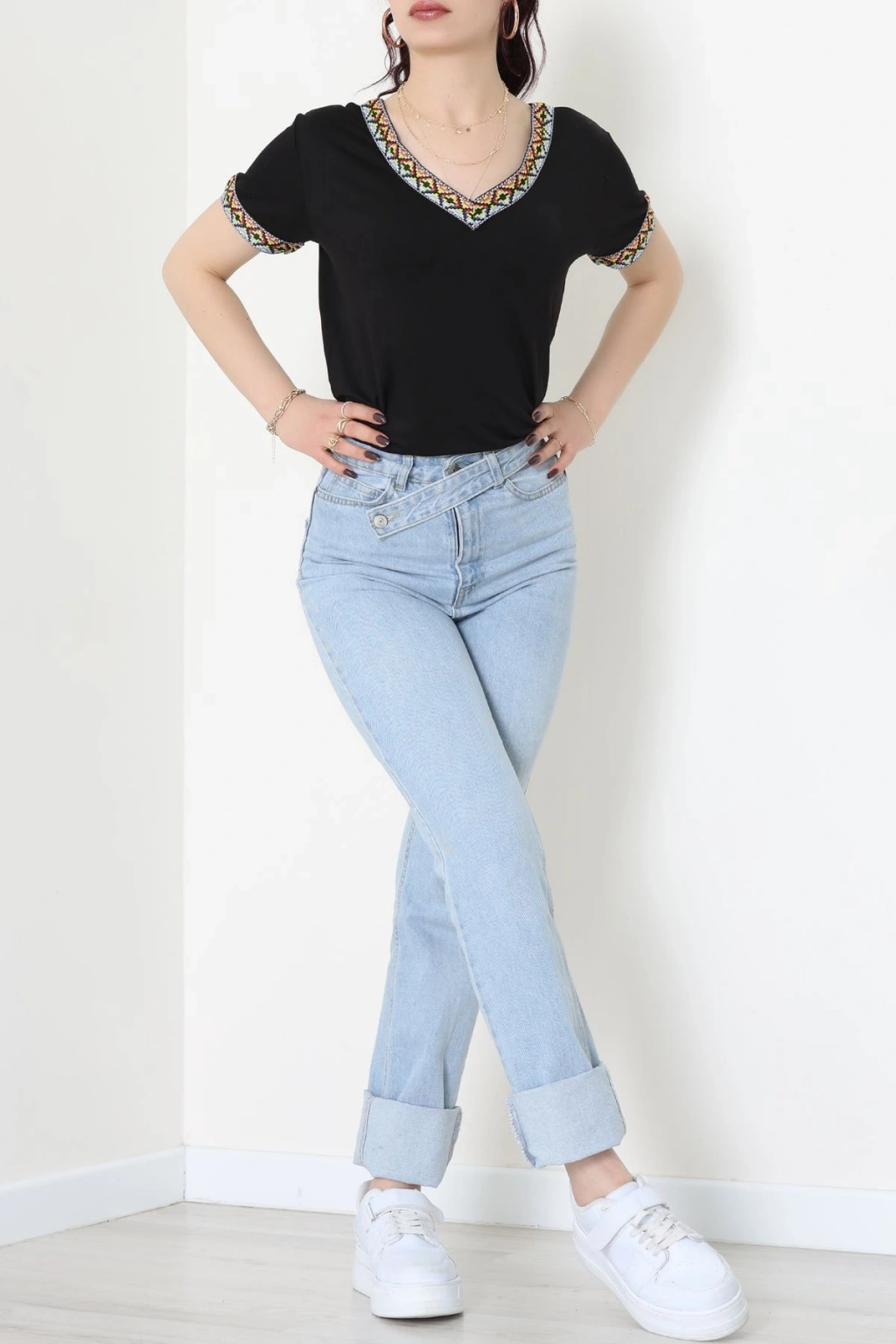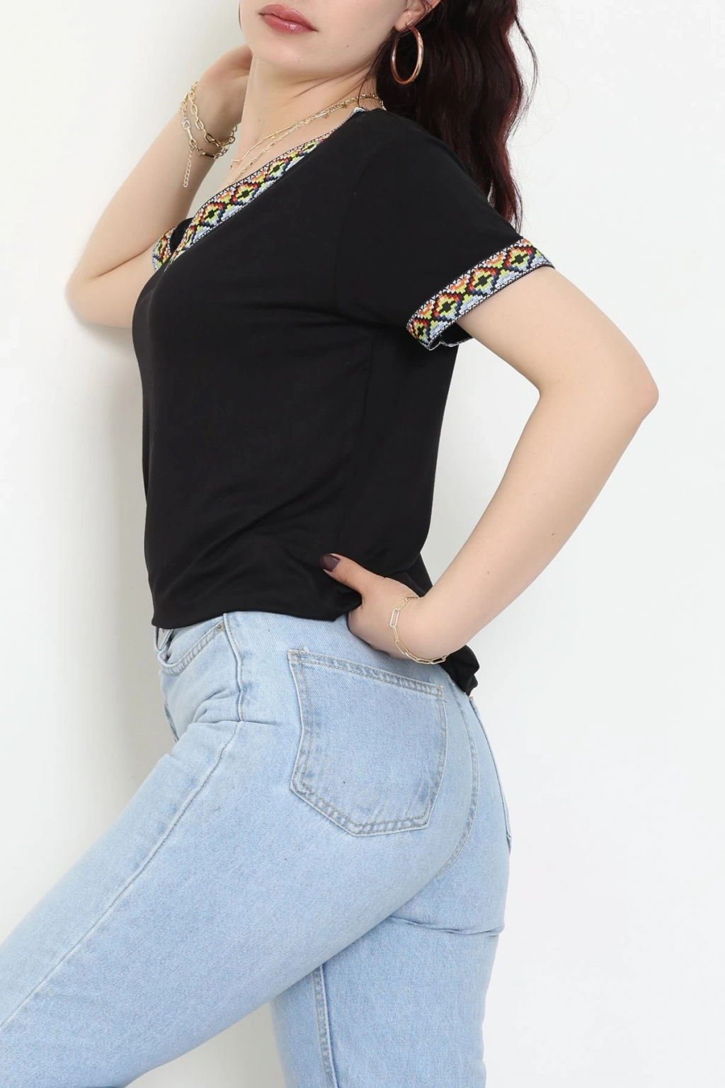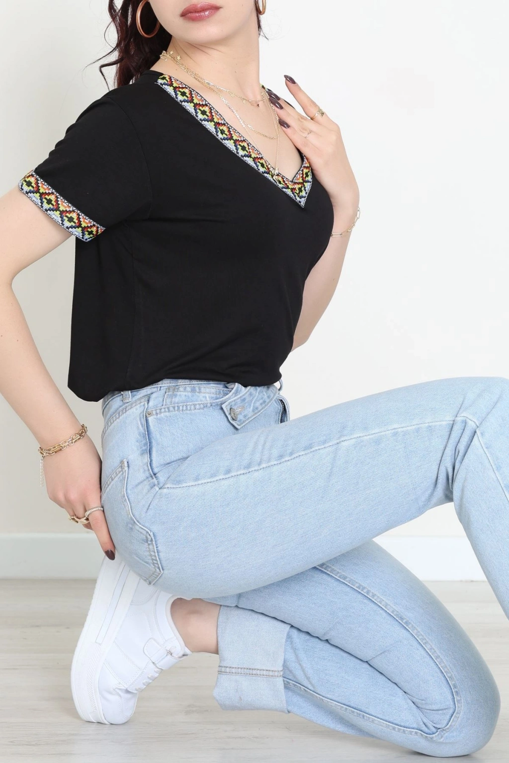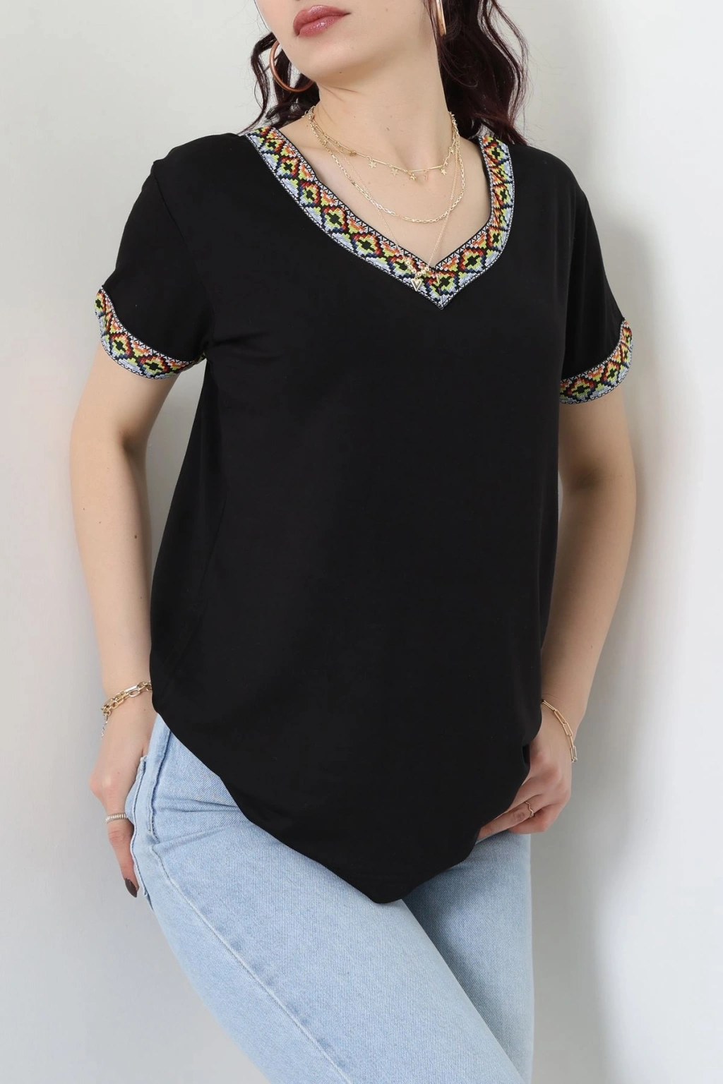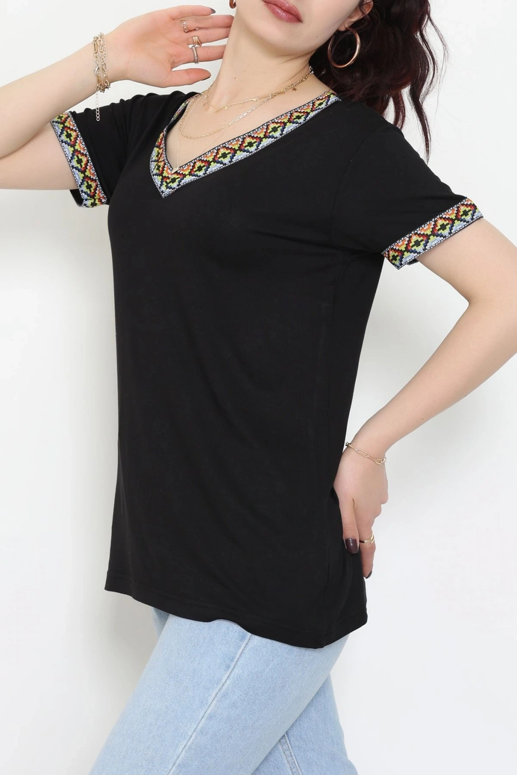 V Şerit Etnik Desen Yakalı Viskon Bluz Siyah - 43000.1256.
