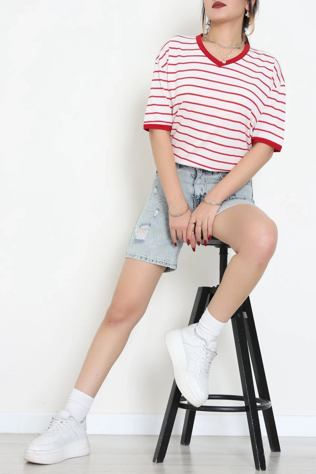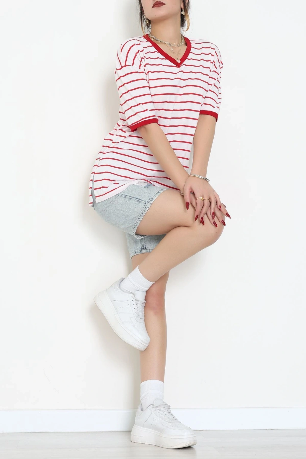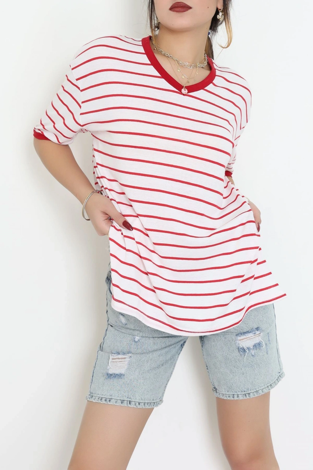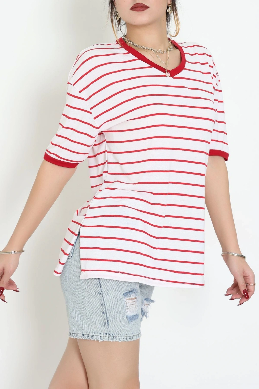V Yaka Çizgili Rejenere Süprem Tişört Ekrukırmızı - 602.1567.