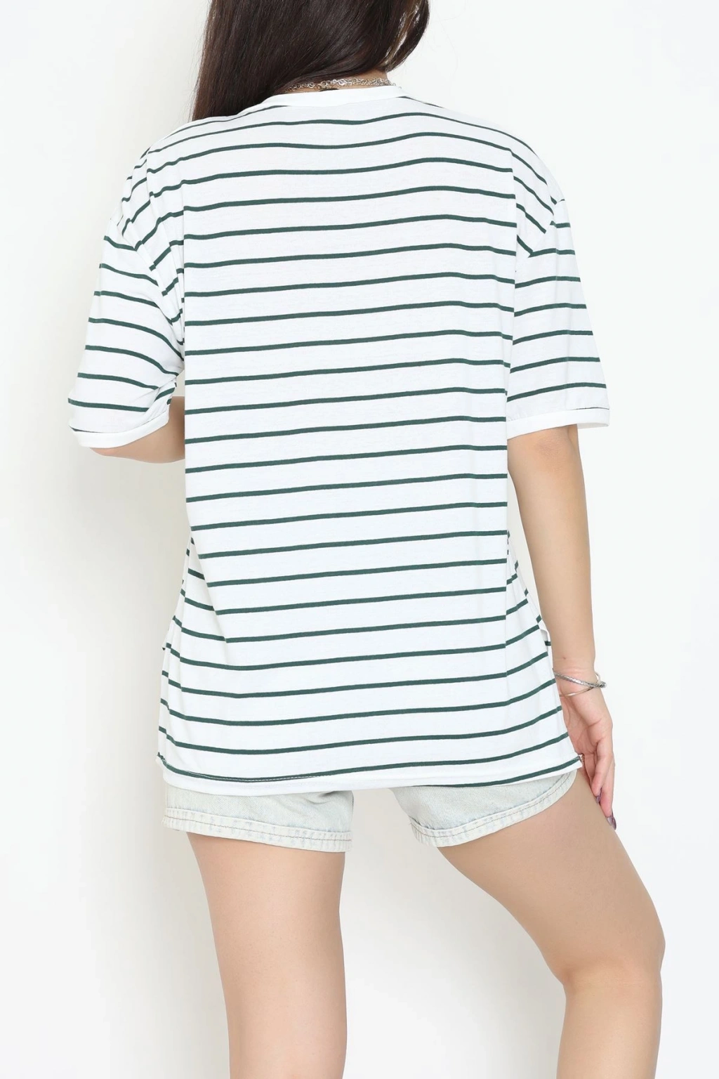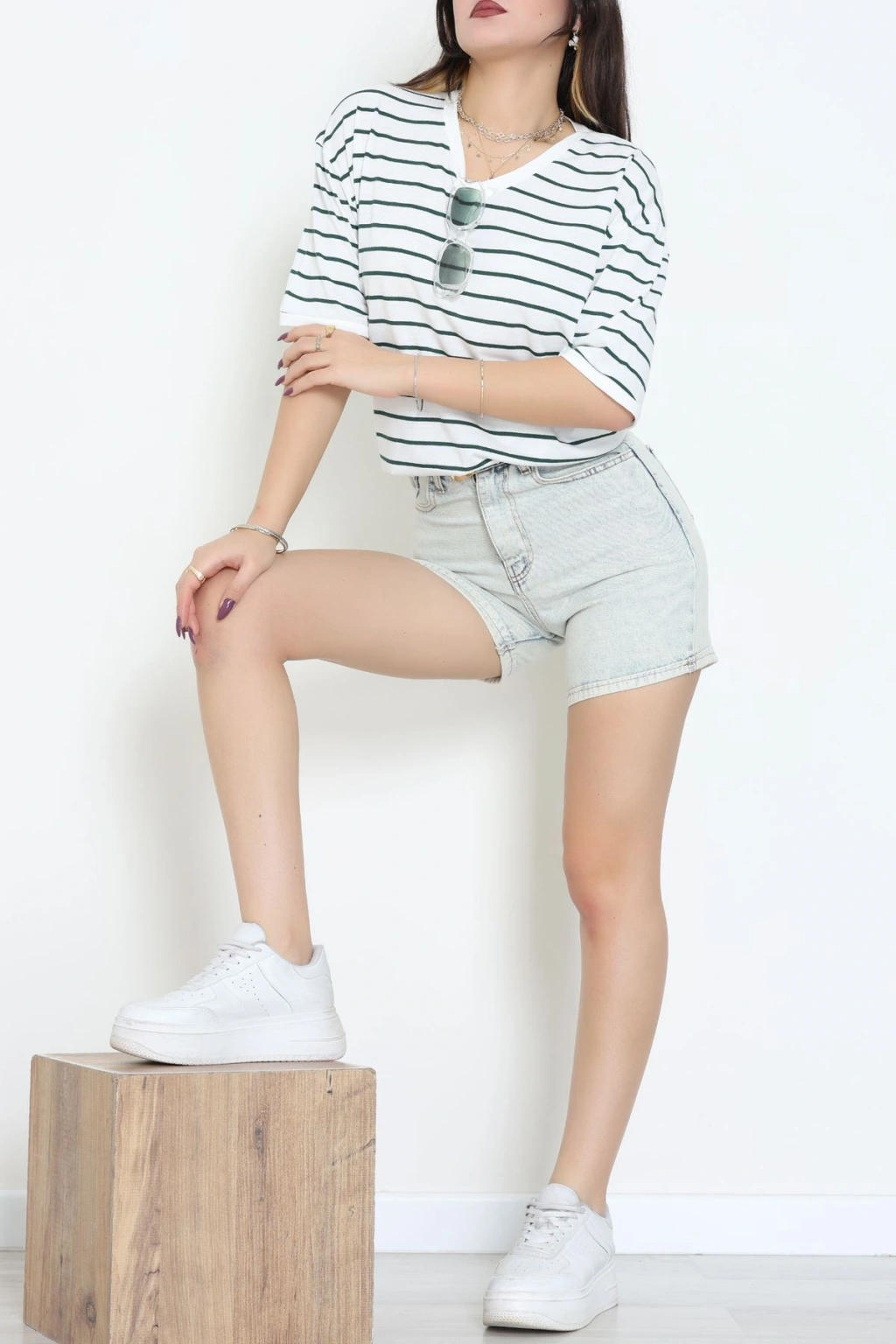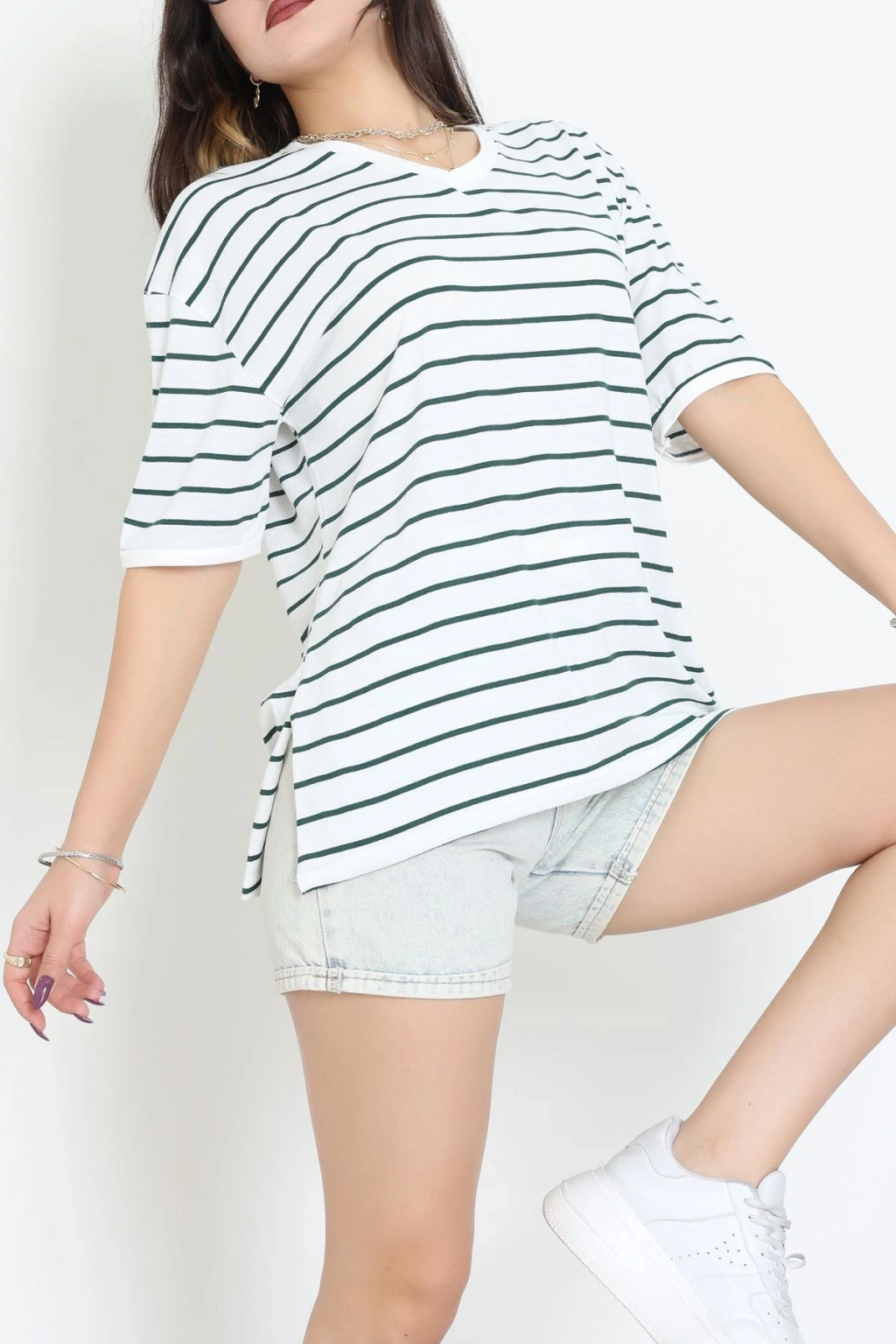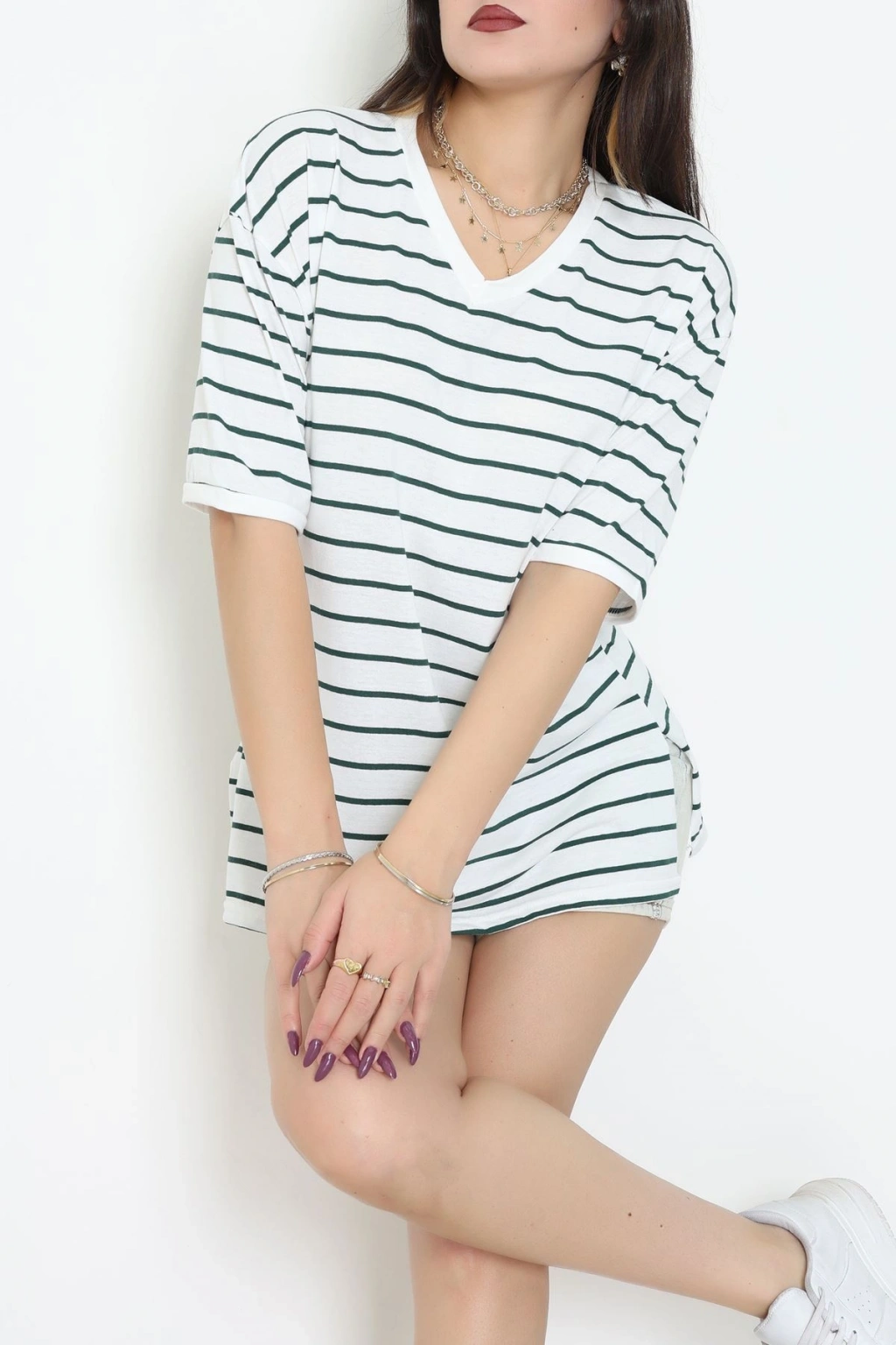 V Yaka Çizgili Rejenere Süprem Tişört Ekruzümrüt - 602.1567.