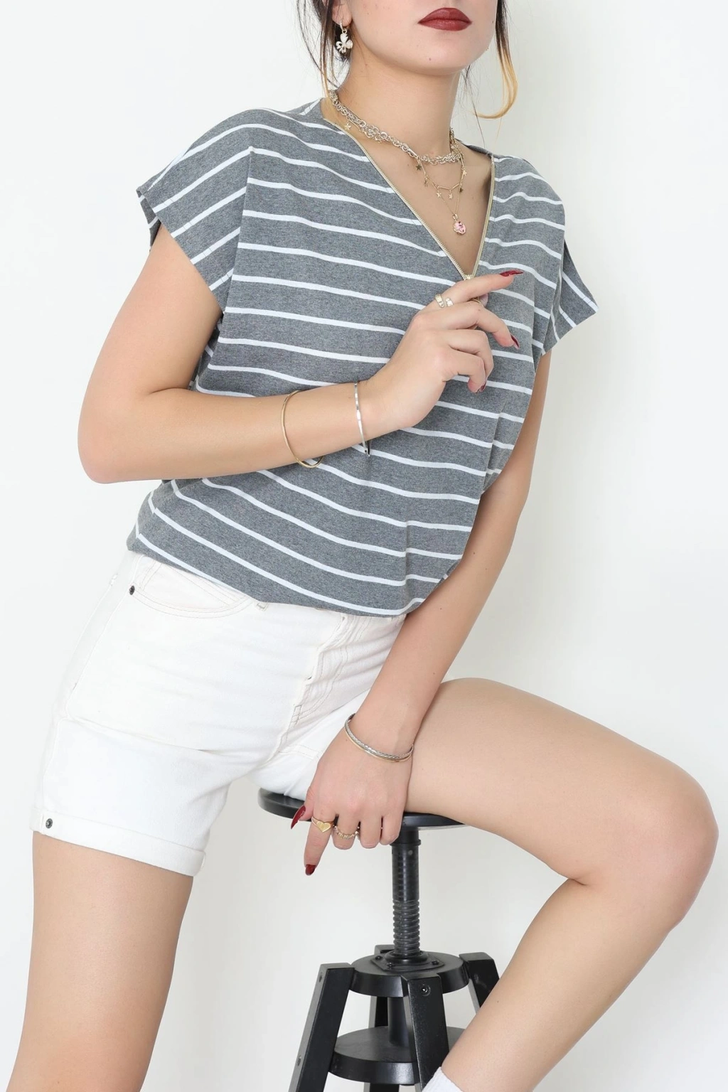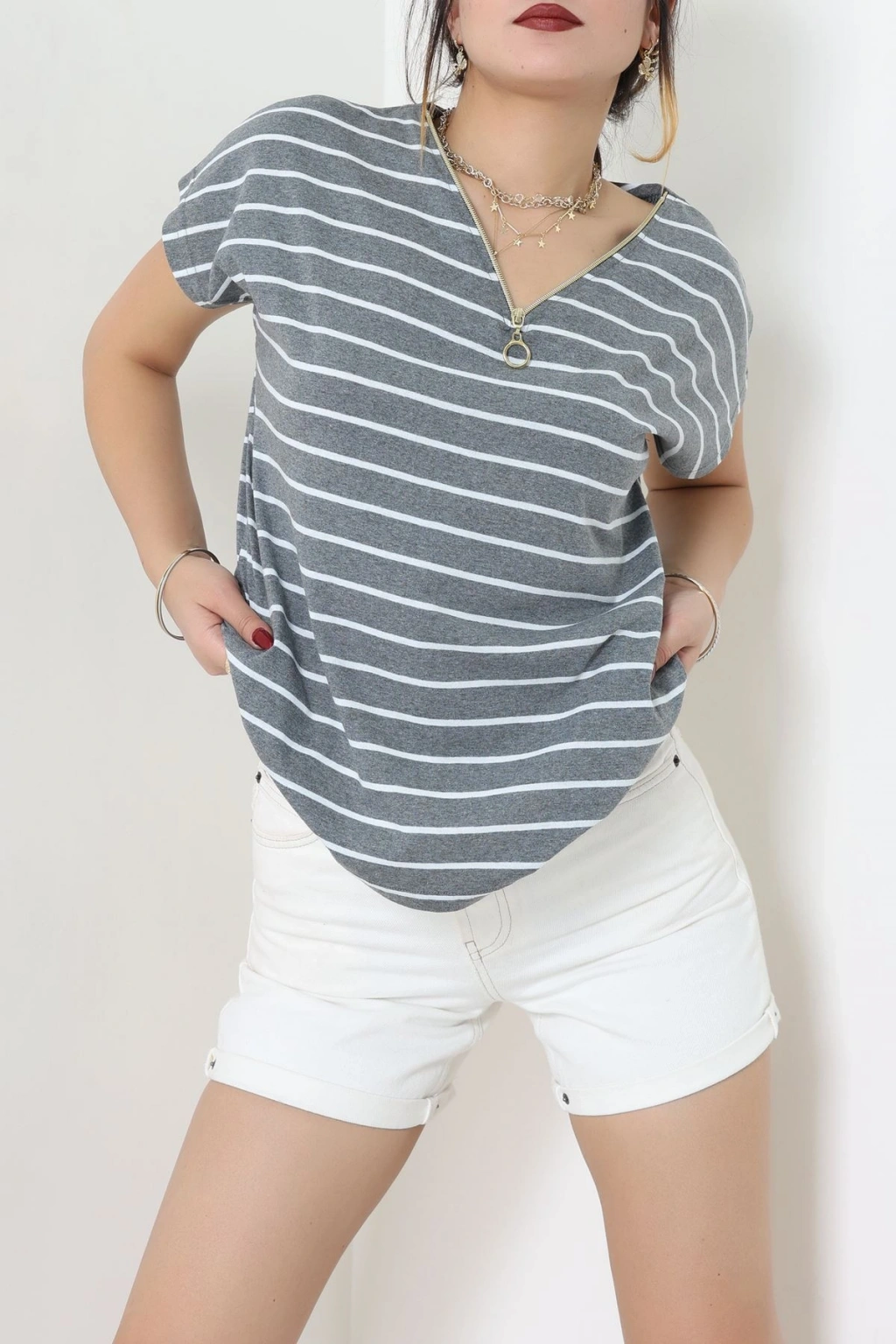 V Yaka Fermuarlı Rejenere Süprem Tişört Antrasitbeyaz - 600.1567.