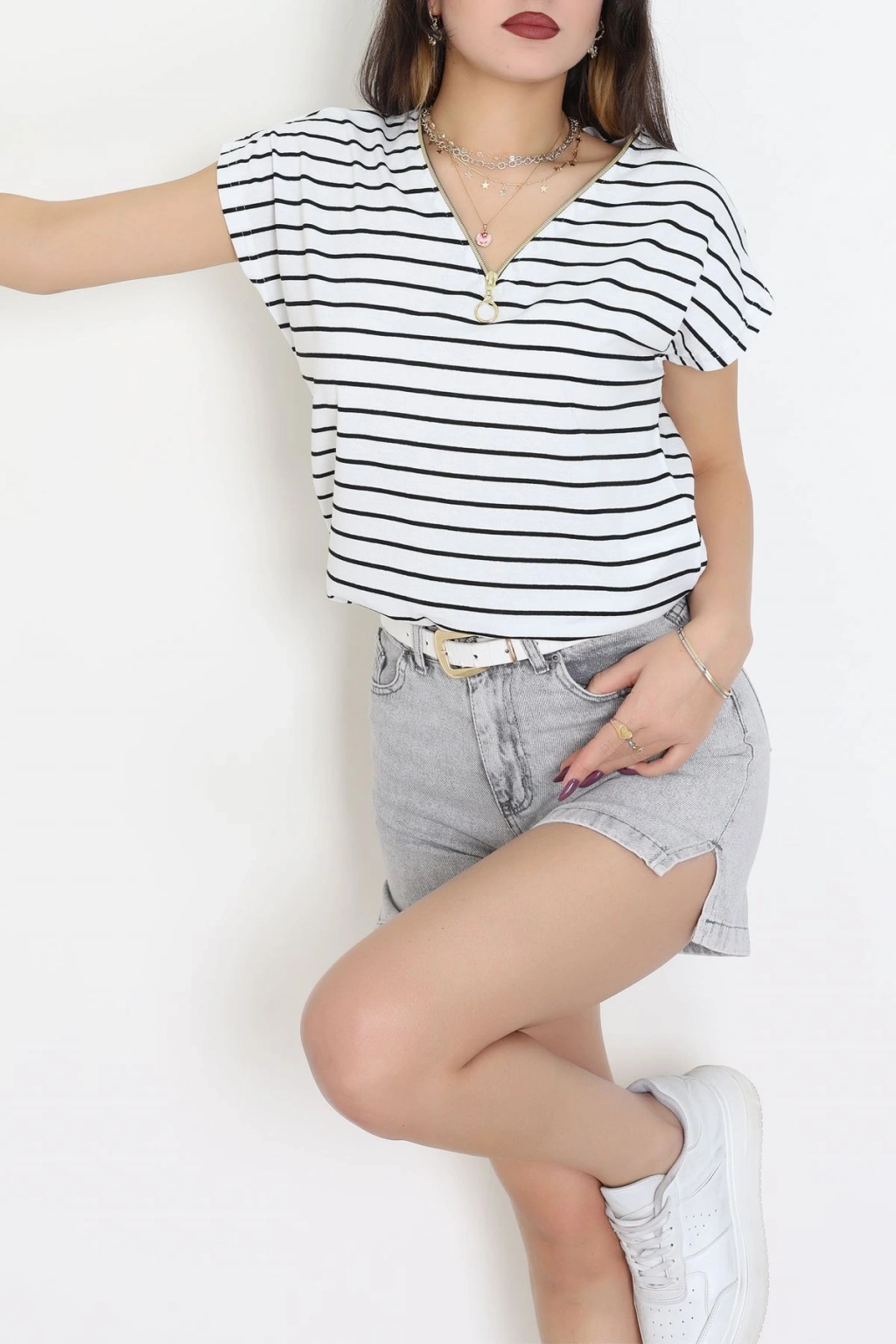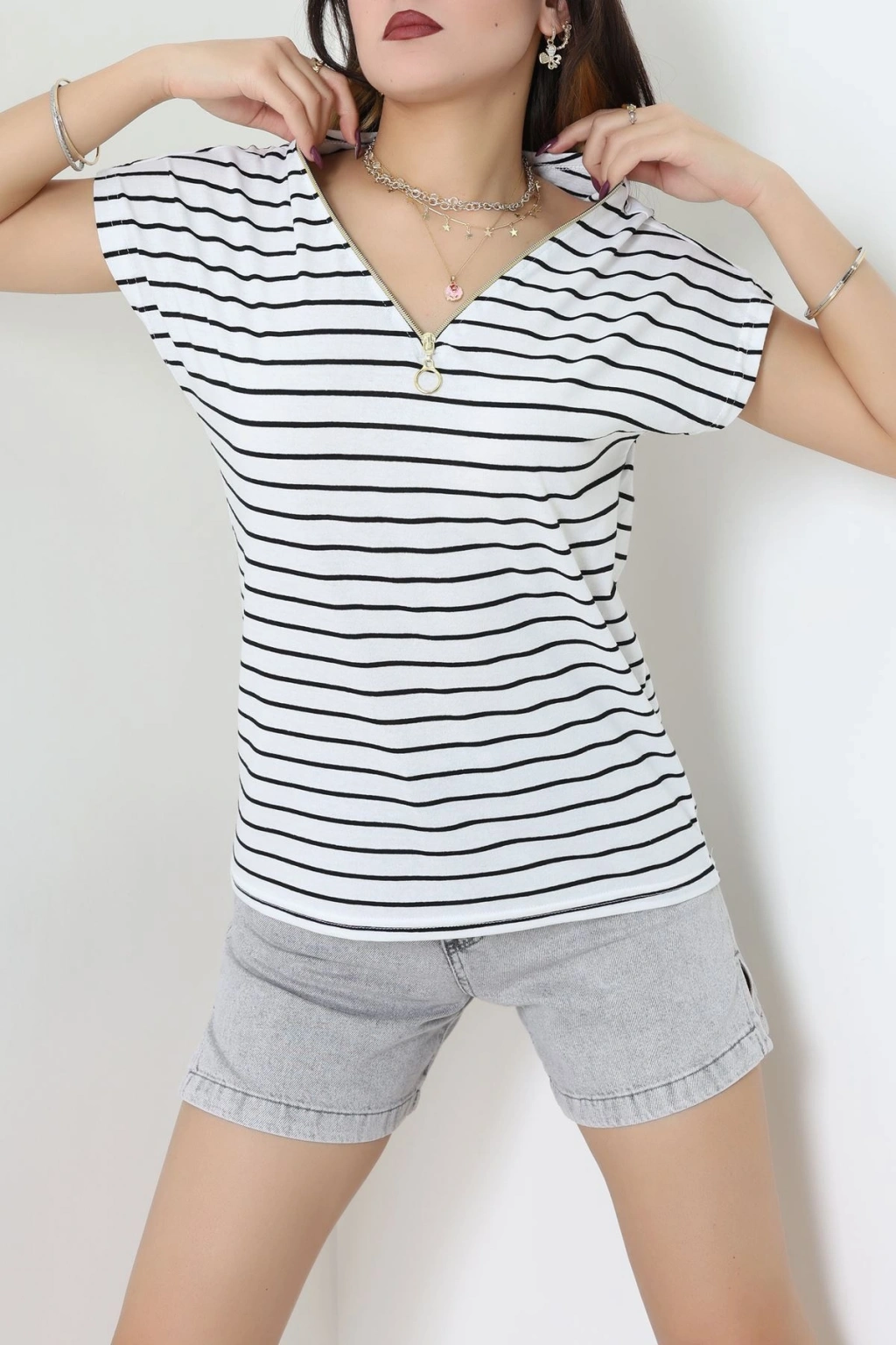 V Yaka Fermuarlı Rejenere Süprem Tişört Beyazsiyah - 600.1567.