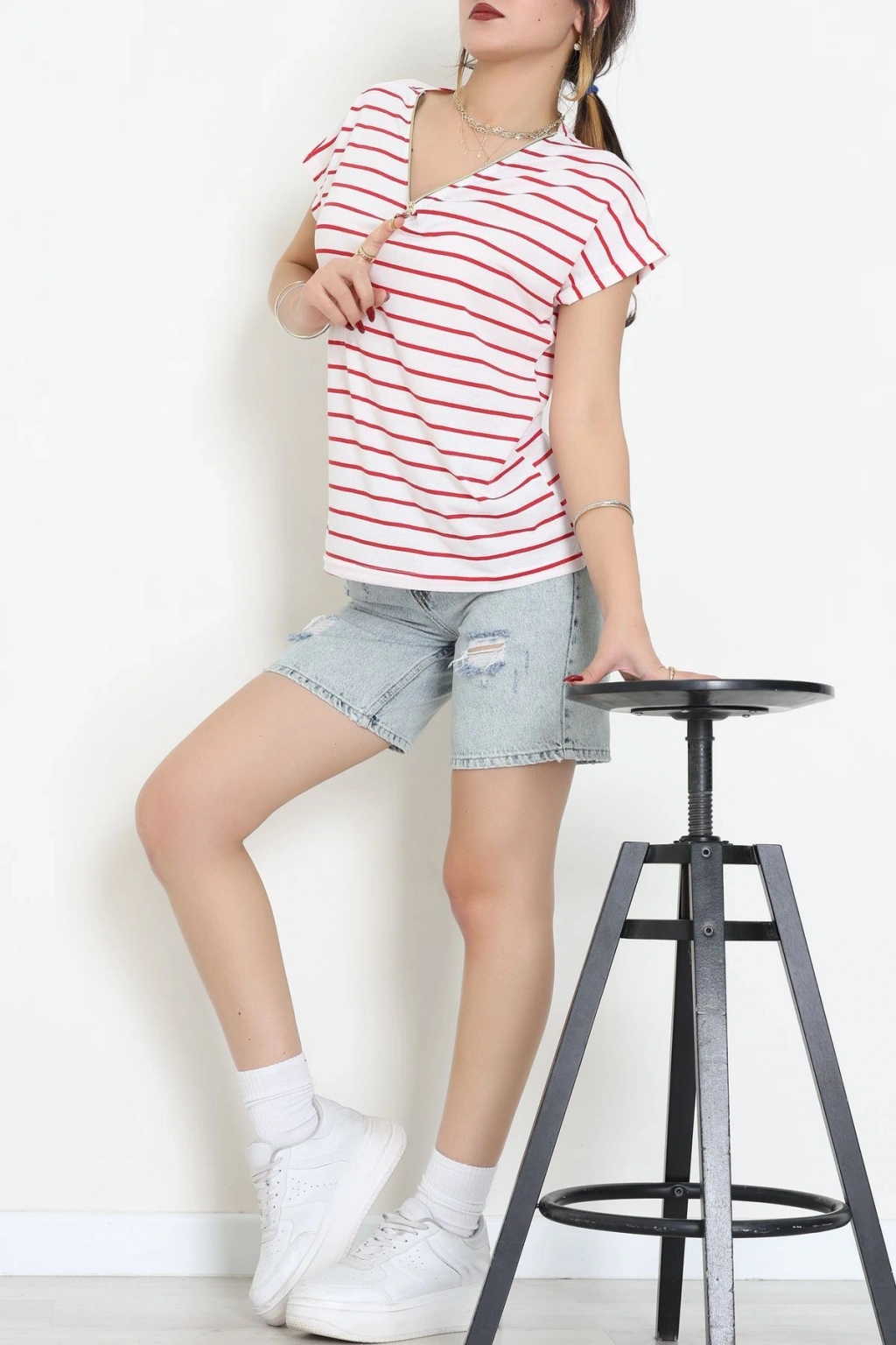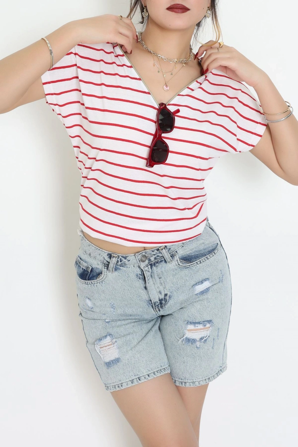 V Yaka Fermuarlı Rejenere Süprem Tişört Ekrukırmızı - 600.1567.