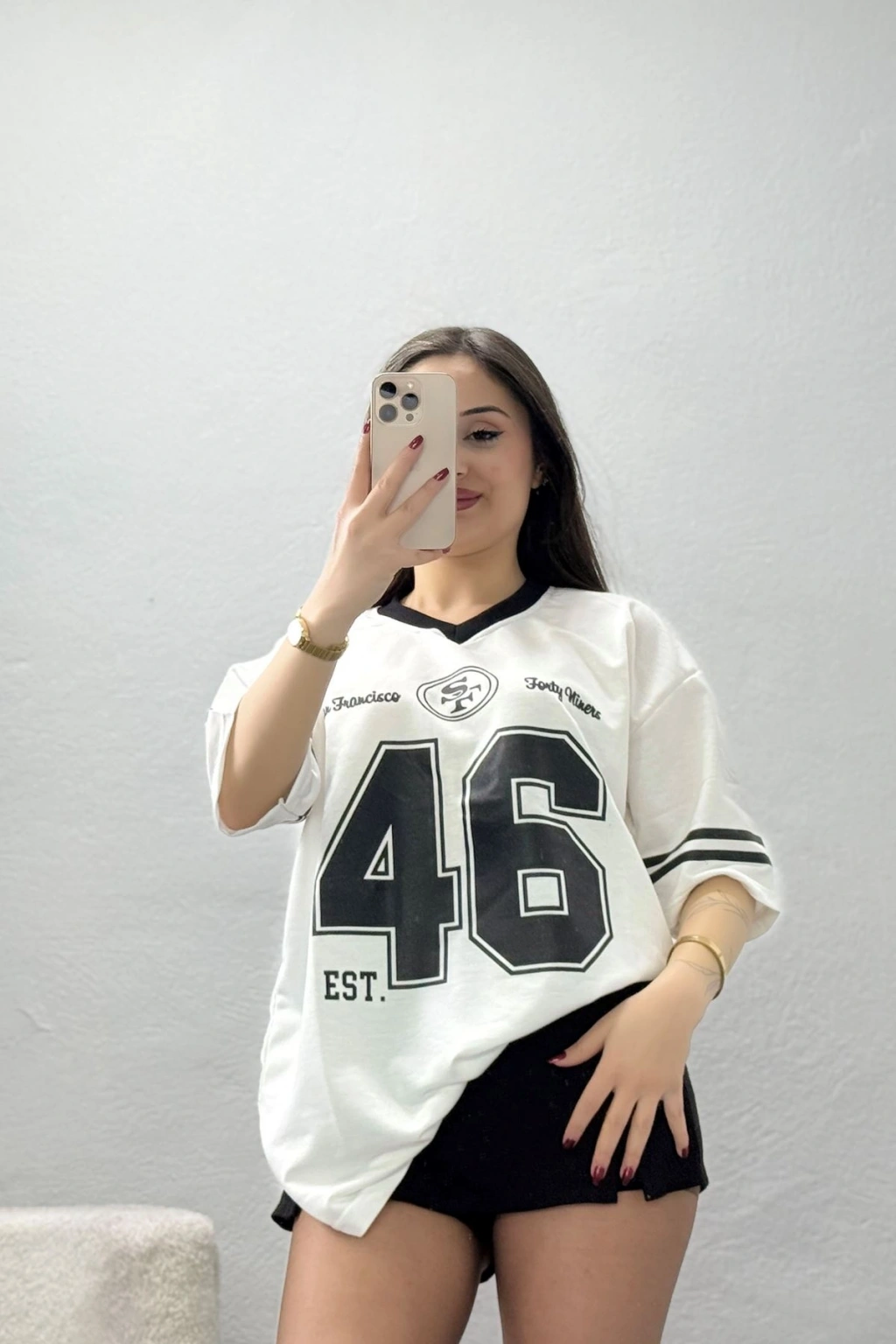 # V Yaka Oversize Forma Tişört ## Kaliteli Kumaş ve Sportif Tasarım Rahatlık sunan bu **V yaka forma tişört** modeli, hafif yapısı ve nefes alan özel dokusuyla hareket özgürlüğünü en üst seviyeye taşımayı başarır. Beyaz zemin üzerine yerleştirilen belirgin siyah numara baskısı ve kontrast yaka şeritleri, modelin dinamik sportif kimliğini ön plana çıkarır. Bu tasarım, geniş kalıbı sayesinde vücut hatlarını belli etmeden modern ve dökümlü bir duruş sergiler. **Oversize kesim** avantajıyla gün boyu konfor sağlayan bu parça, dayanıklı dikiş yapısı ve kaliteli baskı teknikleriyle uzun süreli kullanım vadeder. Tok ve dayanıklı bir yapıya sahip olan **2 iplik kumaş** teknolojisi, ürünün orijinal formunu uzun süre korumasına yardımcı olurken tene yumuşak bir temas hissi sunar. Kollarındaki yatay çift çizgili şerit detayları, geleneksel Amerikan futbolu forması estetiğini modern ve sade bir **beyaz tişört** tasarımıyla başarılı bir şekilde birleştirir. Rahatlığı ve sportif şıklığı bir arada deneyimlemek isteyen kullanıcılar için bu model, kaliteli tekstil malzemeleriyle üretilmiş tam bir fiyat performans ürünüdür. Özellikle sportif bir görünüm sunan **V yaka forma tişört** arayanlar için ideal bir tercih olan bu tasarım, bütçe dostu yapısıyla öne çıkan ekonomik bir seçenektir. Hemen siparişinizi oluşturun.