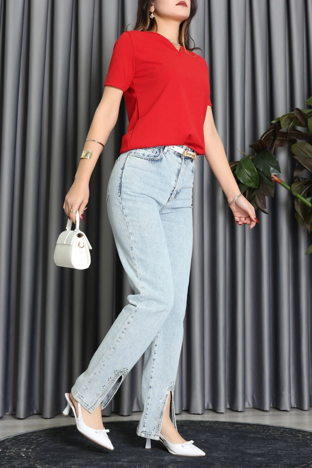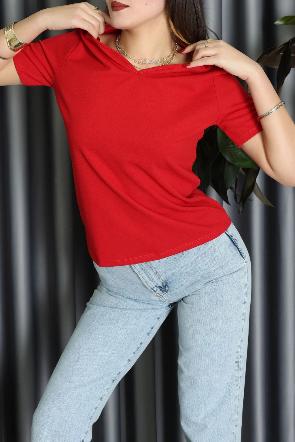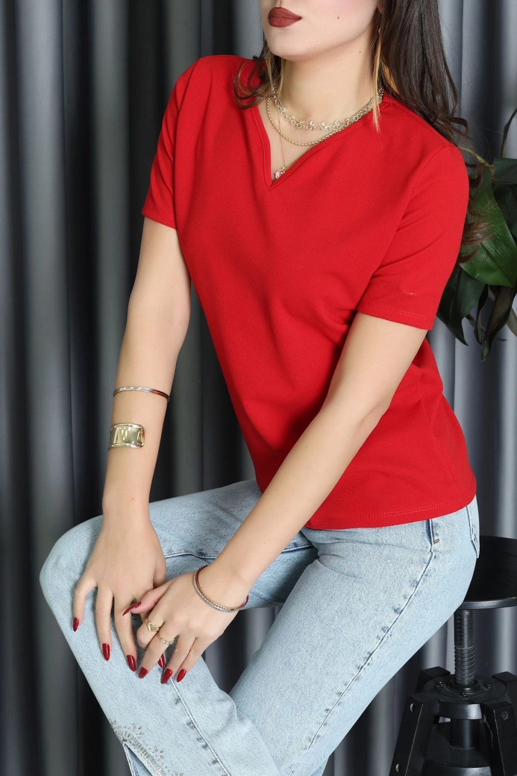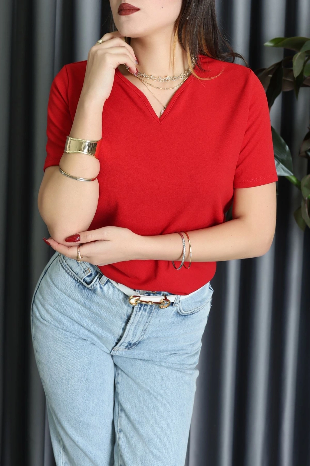 V Yakalı İthal Krep Bluz Kırmızı - 61622.1256.