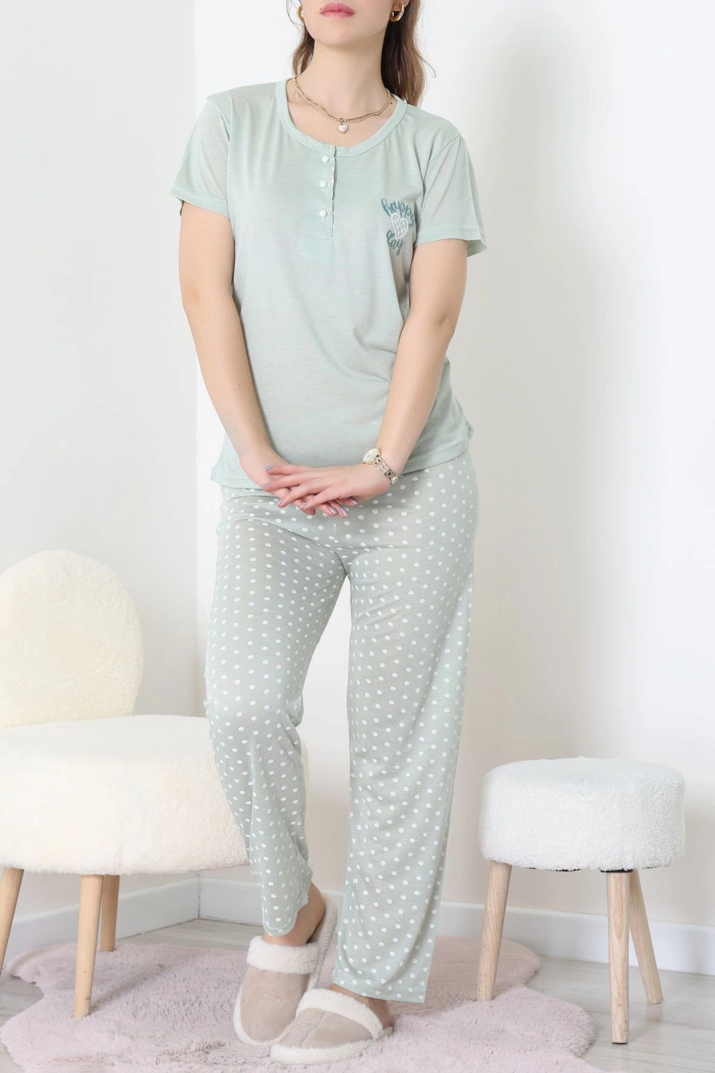 Süet Düğmeli Pijama Takımı Yeşil - 31876.1049.